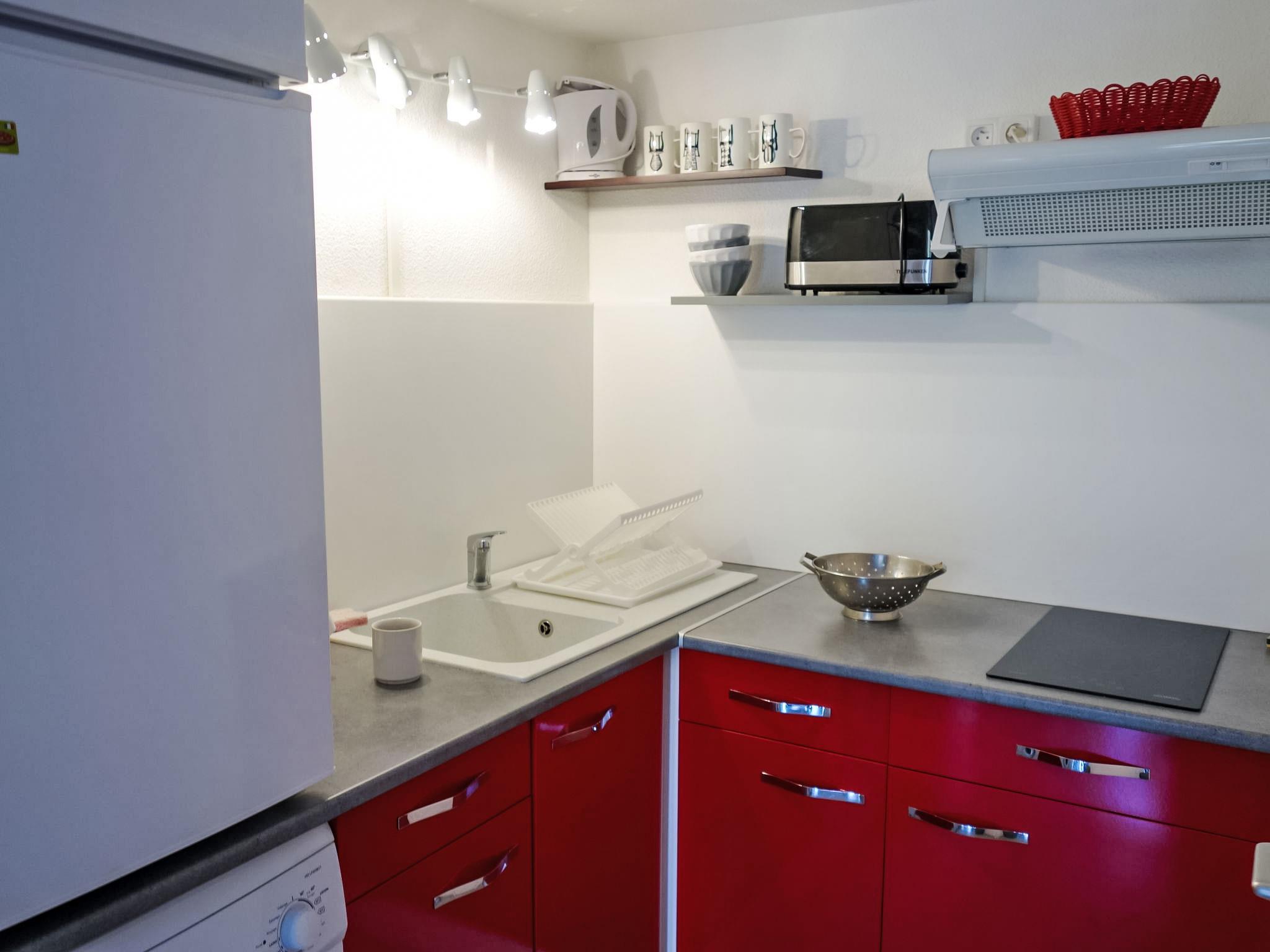 1-room studio 22 m2 on 2 levels. Living/dining room with 1 double sofabed (1 x 140 cm, length 190 cm), TV. Exit to the terrace. Open kitchen (mini-oven, 2 ceramic glass hob hotplates, toaster, kettle, microwave, electric coffee machine). Shower, sep. WC. Forced-air heating. Upper floor: open gallery with 1 french bed (1 x 140 cm, length 190 cm). Air-conditioning. Terrace 15 m2. Terrace furniture. Facilities: washing machine. Internet (WiFi, extra). Parking. Please note: non-smokers only. Smoke alarm.