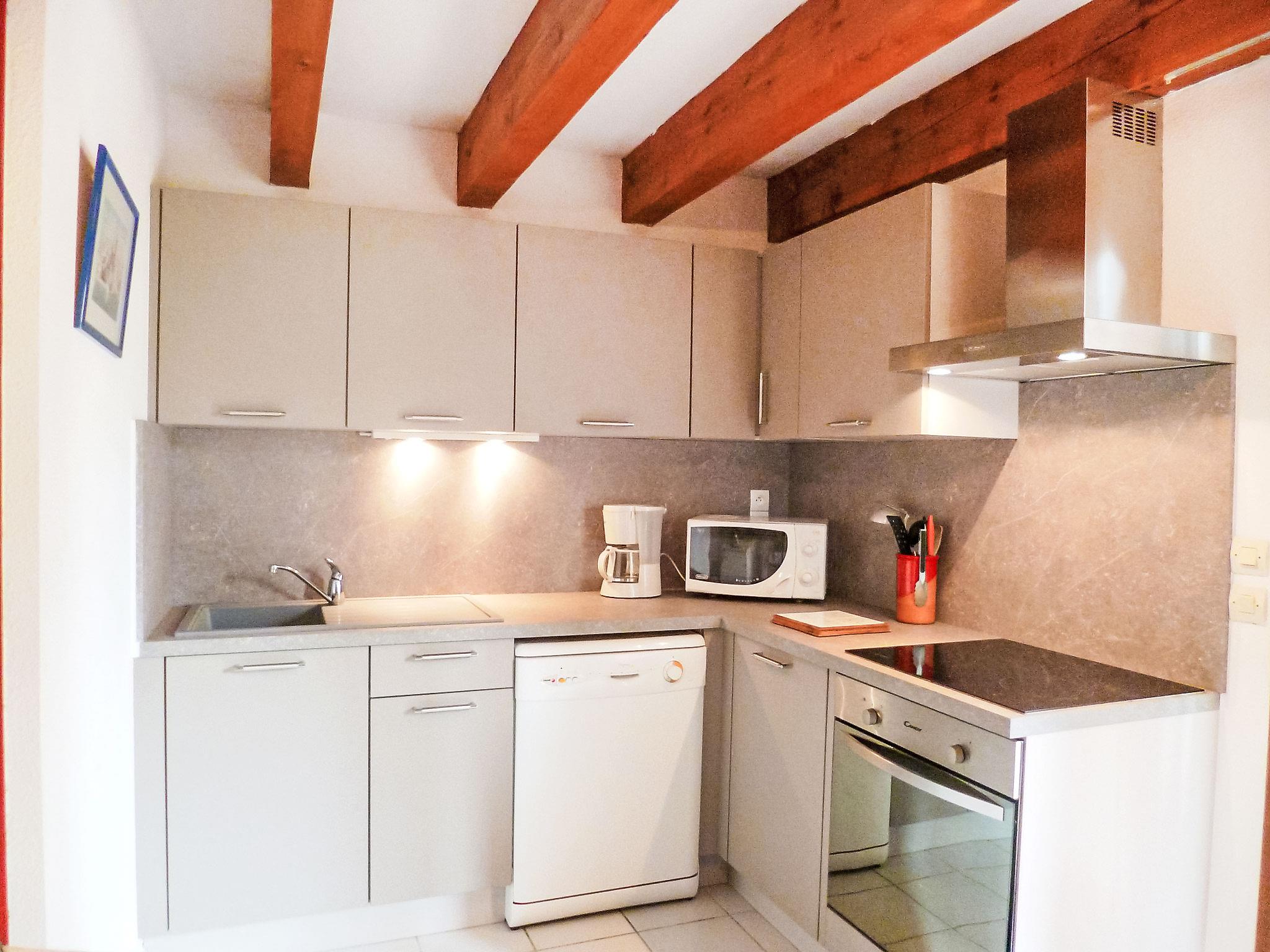 3-room terraced house 37 m2 on 2 levels. Practical furnishings: living/dining room with TV. Exit to the terrace. Kitchenette (oven, dishwasher, 4 ceramic glass hob hotplates, microwave, freezer). Shower, sep. WC. No heating option. Upper floor: 1 room with 1 french bed (140 cm, length 190 cm). 1 room with 2 beds (80 cm). Terrace 20 m2, south facing position. Terrace furniture, barbecue. Facilities: washing machine. Internet (WiFi, extra). Parking. Please note: smoke alarm.