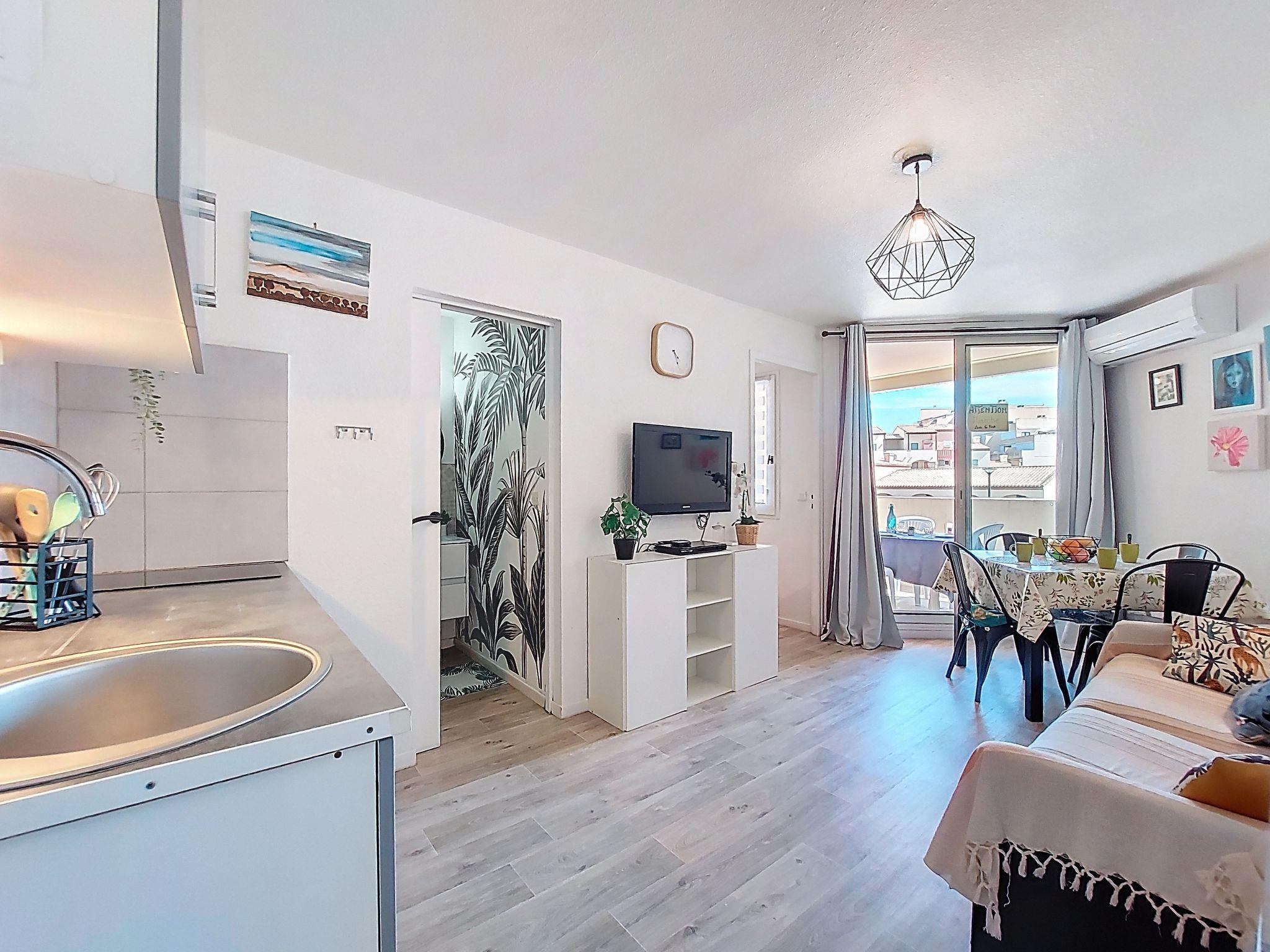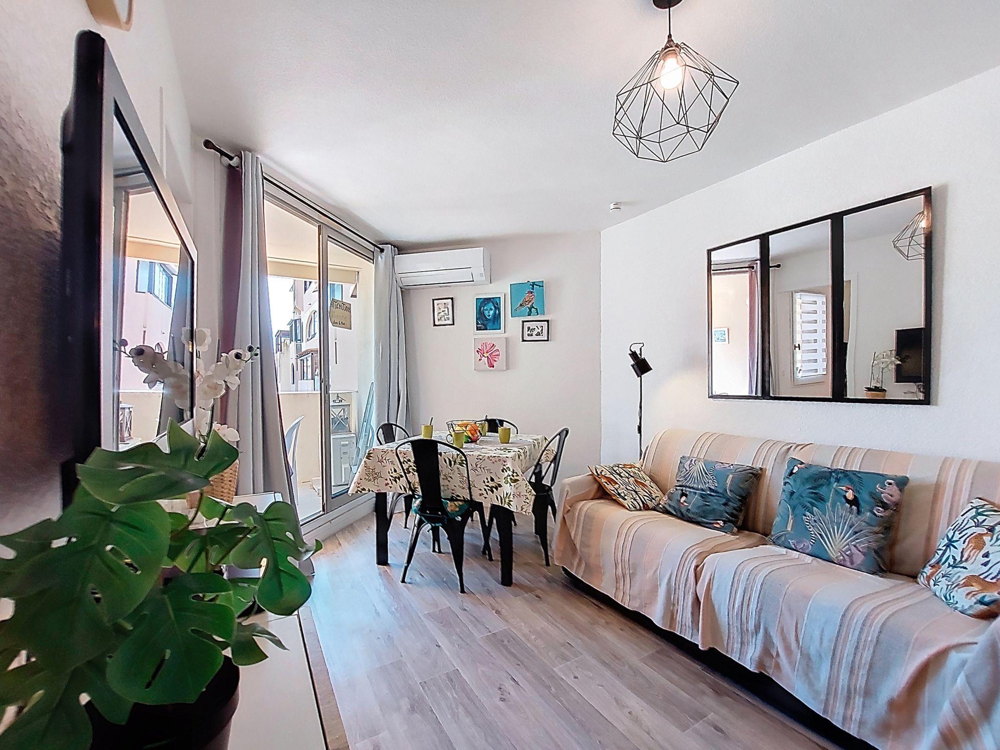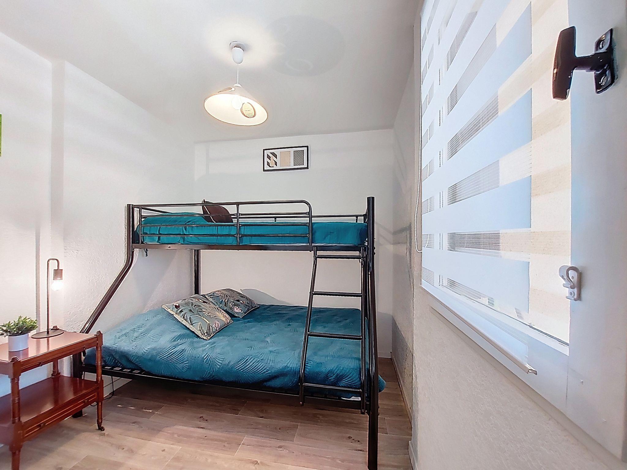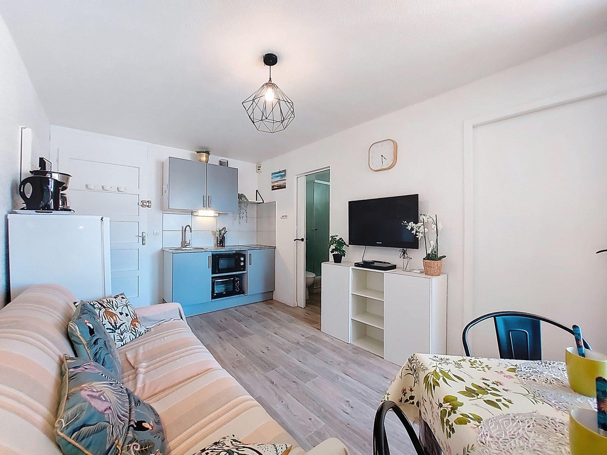 2-room apartment 27 m2 on 1st floor. Dining room with 1 sofabed (140 cm, length 190 cm), TV (flat screen). Exit to the terrace. 1 room with 1 french bed (1 x 140 cm, length 190 cm). Kitchenette (mini-oven, 2 ceramic glass hob hotplates, toaster, kettle, microwave, electric coffee machine). Shower/WC. Air-conditioning. Terrace 5 m2. Terrace furniture. Side view of the sea. Facilities: Internet (WiFi, extra). Parking. Please note: smoke alarm. Offer by a private individual according to Art. 155, IV of CGI.