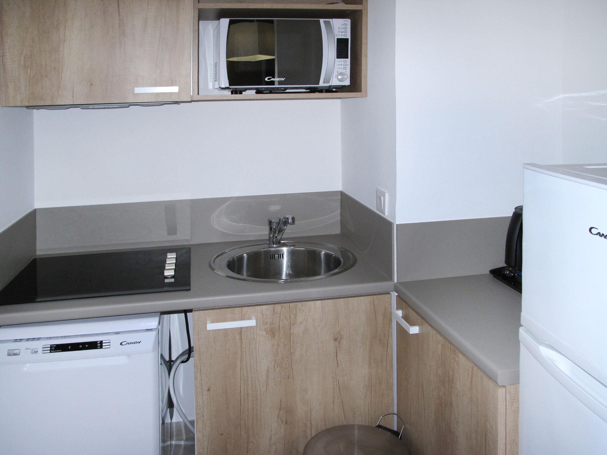 "Odalys Référence Le Lotus Blanc", 3-room apartment 42 to 46 m2. Beautiful furnishings: living/sleeping room with 2 sleeping facilities, dining table and TV (flat screen), air conditioning. Exit to the terrace. 2 rooms, each room with 2 sleeping facilities. Small, open kitchen (dishwasher, 4 ceramic glass hob hotplates, kettle, electric coffee machine, combination microwave). Shower, sep. WC. Electric heating. Balcony or terrace. Terrace furniture. Facilities: children's high chair, baby cot (extra). Internet (WiFi, free). Parking (1 car). Please note: non-smokers only. Maximum 1 pet/ dog allowed. Smoke alarm, fire extinguisher.