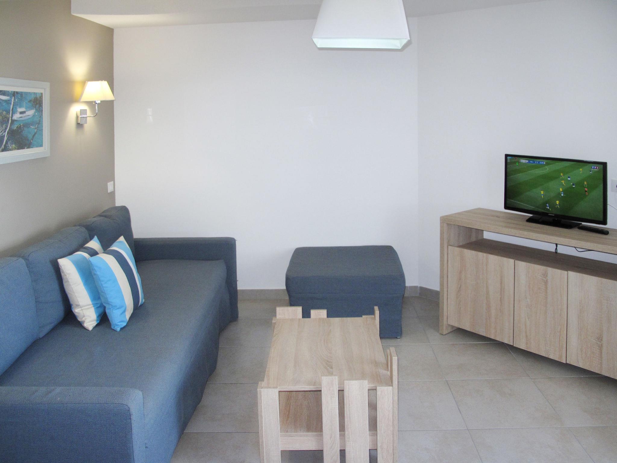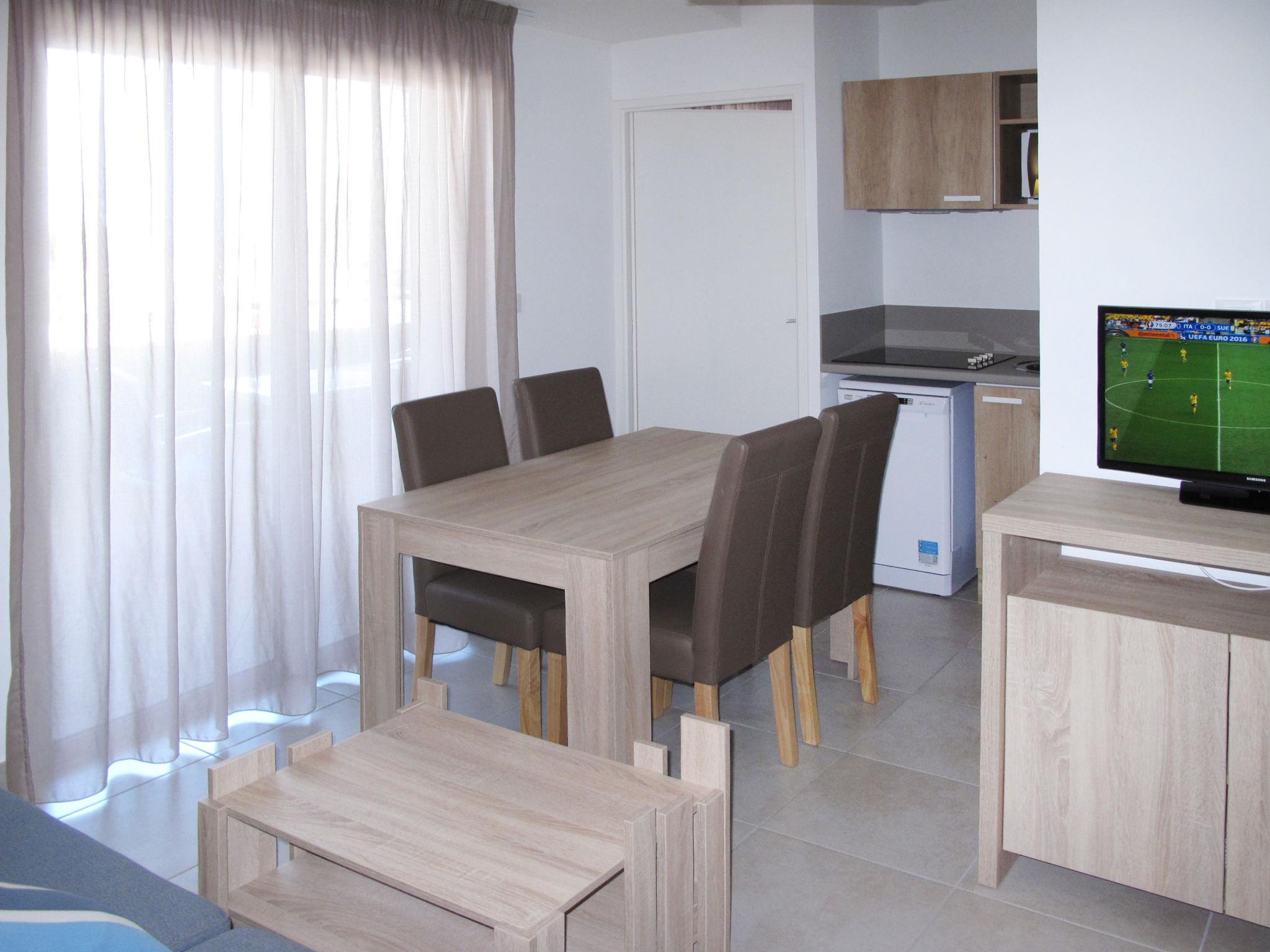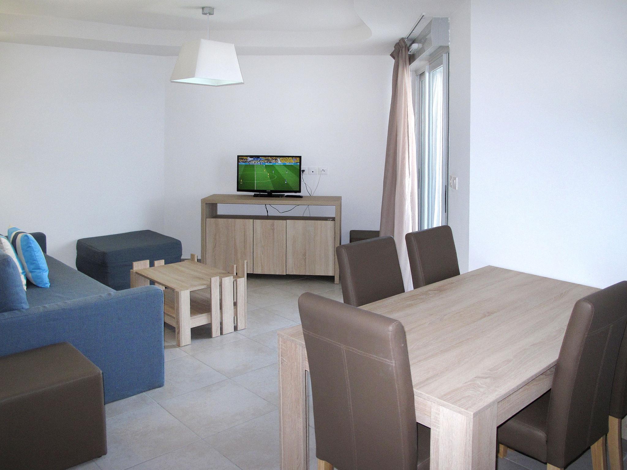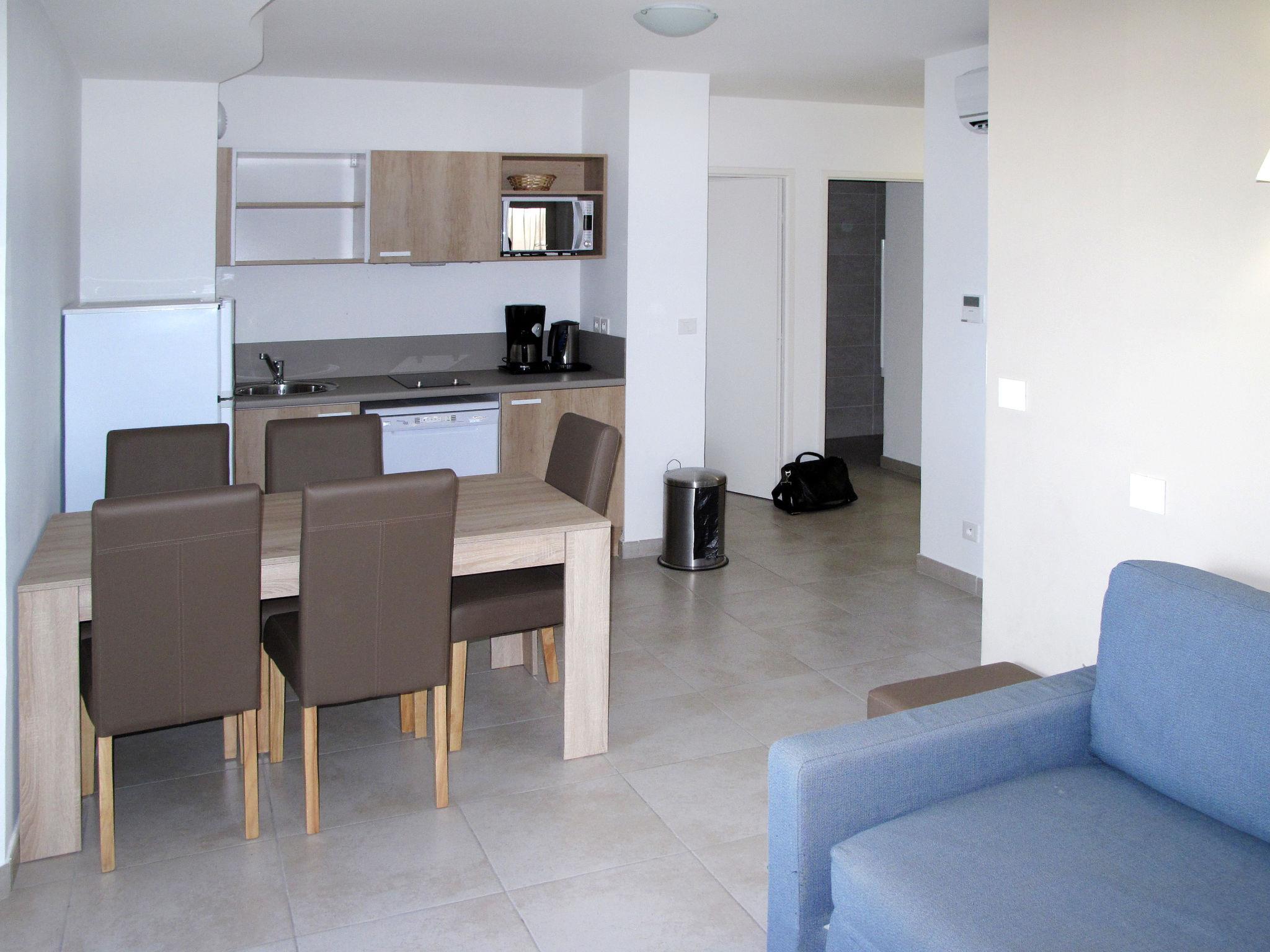 "Odalys Référence Le Lotus Blanc", 3-room apartment 51 m2. Beautiful furnishings: living/sleeping room with 2 sleeping facilities, dining table and TV (flat screen), air conditioning. Exit to the terrace. 1 room with 2 sleeping facilities. 1 room with 2 sleeping facilities. Small, open kitchen (dishwasher, 4 ceramic glass hob hotplates, kettle, electric coffee machine, combination microwave). Shower, sep. WC. Electric heating. Balcony or terrace. Terrace furniture. View of the sea. Facilities: children's high chair, baby cot (extra). Internet (WiFi, free). Parking (1 car). Please note: non-smokers only. Maximum 1 pet/ dog allowed. Smoke alarm, fire extinguisher.