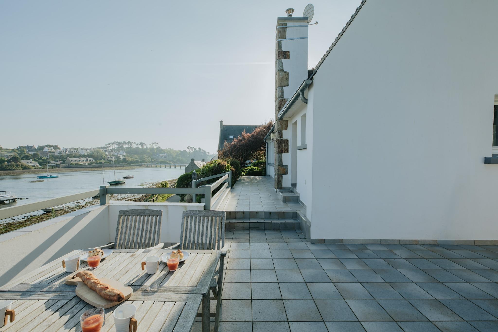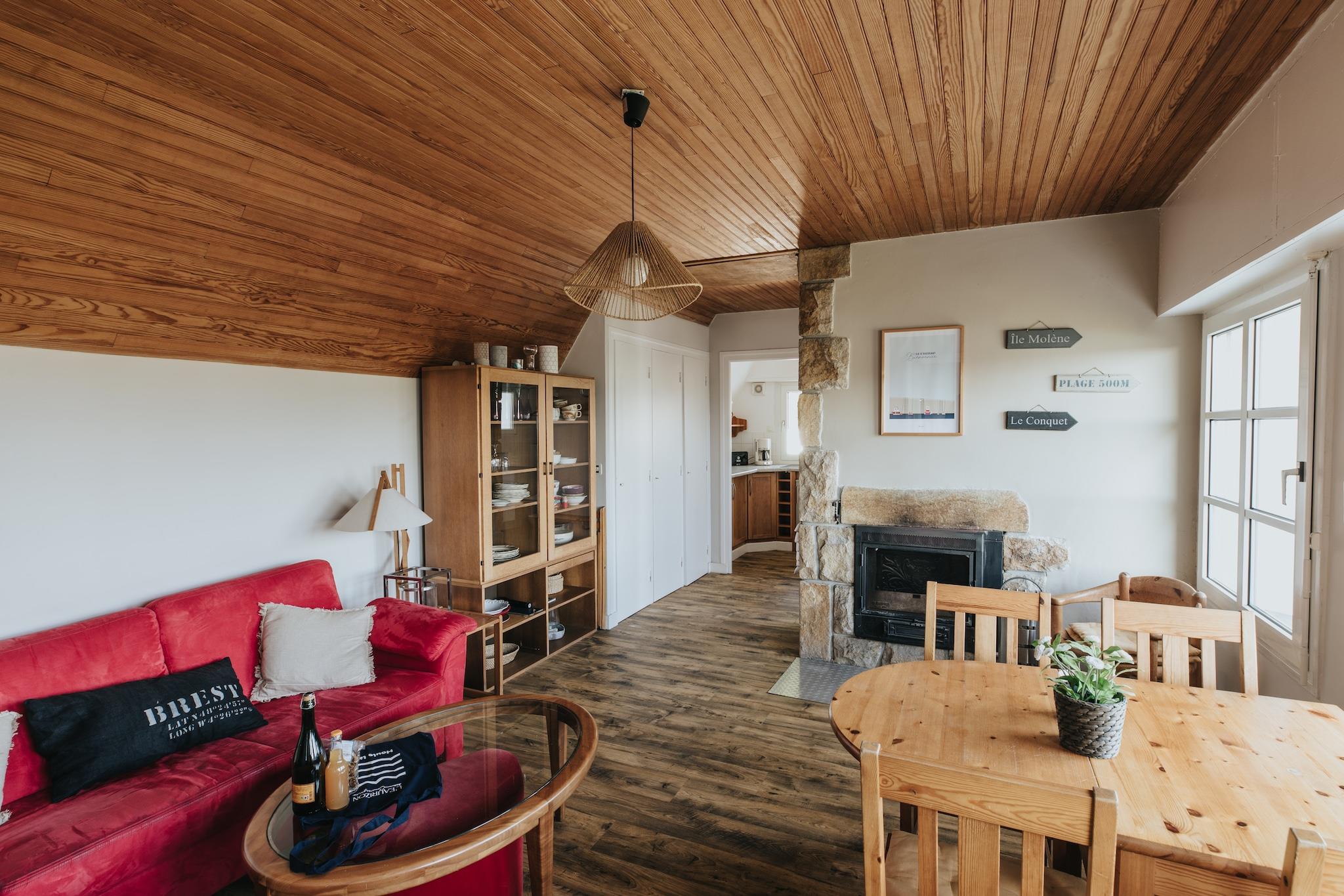 Dit feriehus – Strandliv med maritim charme. Velkommen til dit feriested, et sjældent og harmonisk paradis, tæt forbundet med havet. Fra næsten alle vinduer kan du nyde en betagende udsigt over det glitrende vand, forbipasserende sejlbåde og tidevandets storslåede skue. Selv fra soveværelset ledsager dette panorama dig og tilbyder et nyt og levende landskab på hvert øjeblik af dagen. Start din dag med den forfriskende havluft, det perfekte supplement til en fransk morgenmad med baguette og croissant. På den store terrasse med udsigt over havet kan du se bådene sejle forbi og lade dit blik vandre helt til Kermorvan-halvøen. Kun en kort gåtur væk ligger den lange, fine sandstrand Les Blancs Sablons – ideel til gåture, solbadning og vandsport. I stueetagen venter en hyggelig stue med brændeovn, der skaber en særlig behagelig atmosfære i lavsæsonen. Et soveværelse med en komfortabel dobbeltseng (1,60 x 2,00 m, separate madrasser) og et badeværelse med bruser og toilet fuldender denne etage. Øverste etage nås via en stejl stige – denne del af boligen er derfor ikke egnet til små børn eller ældre. På loftet er der et andet soveværelse med en usædvanlig stor rund seng (ca. 1,60 x 2,00 m). Et tilstødende værelse, udstyret med et skrivebord, kan bruges som hjemmekontor. En garage er tilgængelig til dit køretøj (afhængigt af størrelse). I Le Conquet finder du også offentlig parkering med parkeringsskiver samt overdækkede parkeringspladser til leje. Kæledyr: Kæledyr er velkomne efter forudgående anmodning. Et højdepunkt under dit ophold er det ugentlige marked, som bringer byens centrum til live hver tirsdag. Færger til øerne Molène og Ouessant afgår også herfra – en uforglemmelig udflugt. Gå heller ikke glip af en tur på en 12-personers stiv oppustelig båd: med lidt held kan du få øje på delfiner og sæler, der soler sig på klipperne.