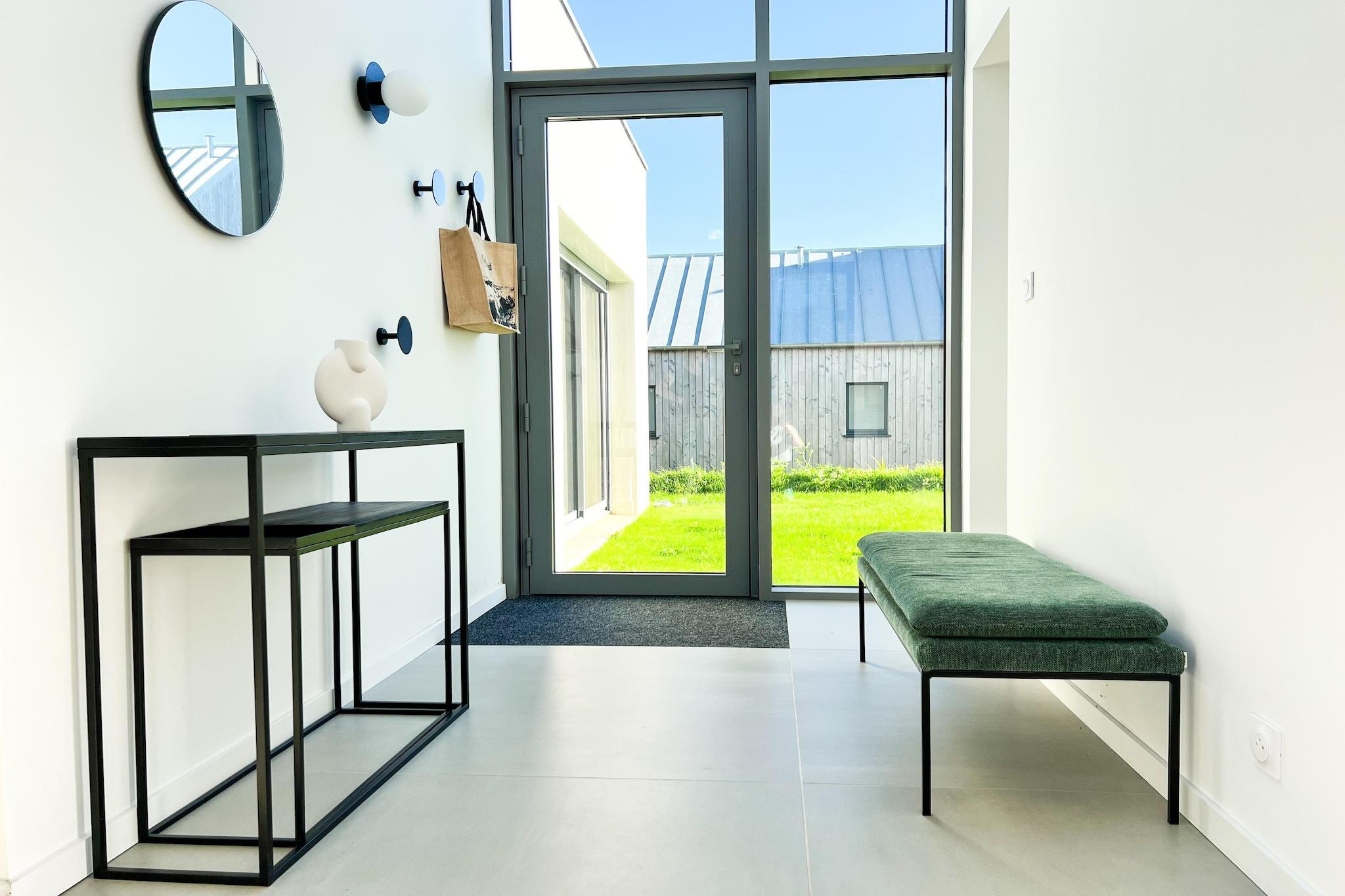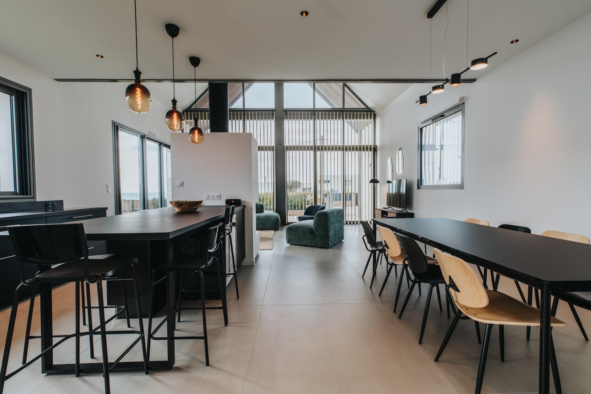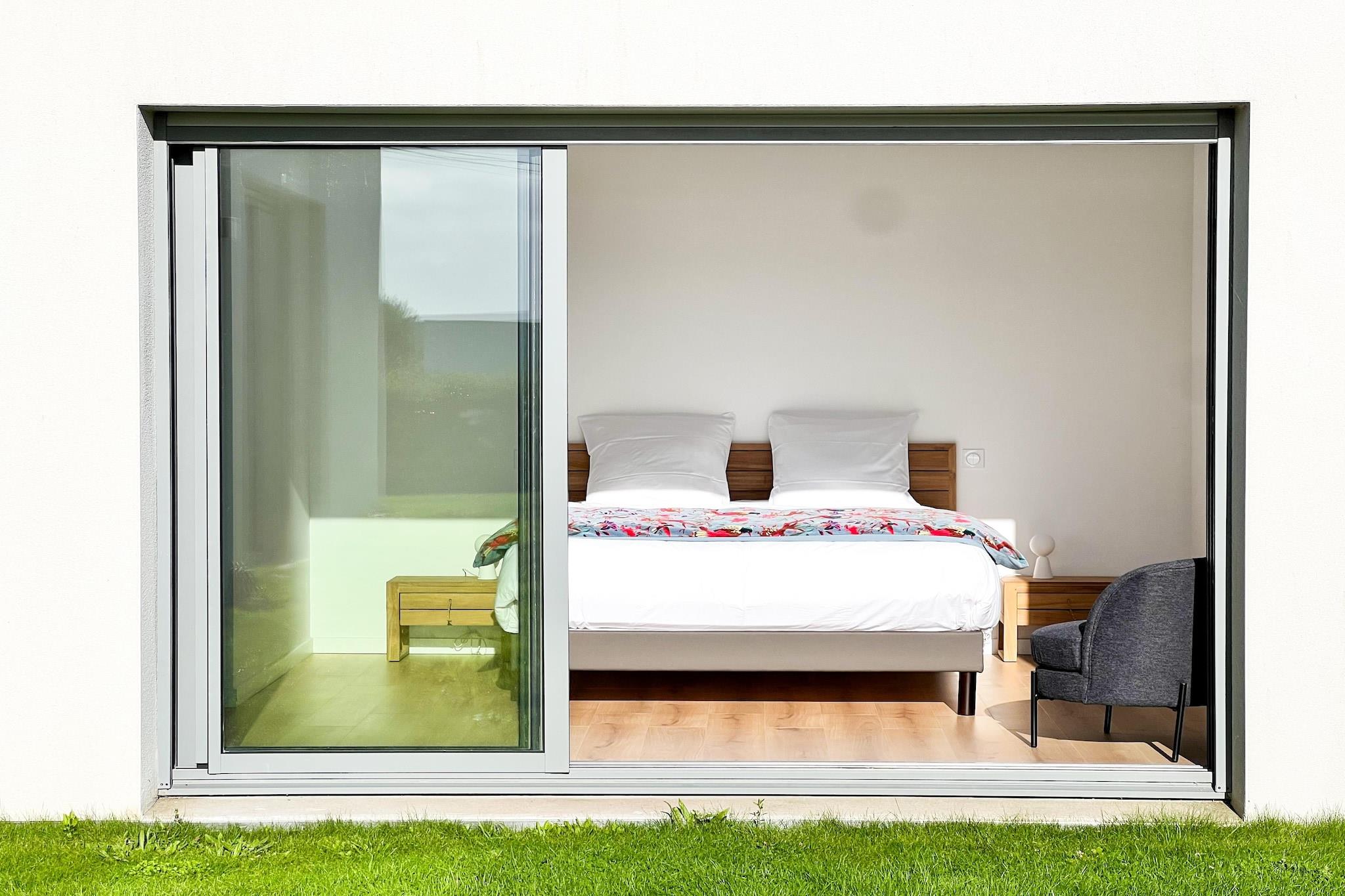 Denne arkitekttegnede villa tilbyder en generøs opholdsstue og moderne, elegante møbler med en betagende delvis havudsigt. Den rummelige planløsning, stuen med havudsigt og den tilstødende terrasse inviterer dig til at nyde vidunderlige øjeblikke med hygge, måske omkring en grill på plancha-grillen. Det fuldt udstyrede køkken er ideelt til at tilberede bretonske specialiteter sammen. Vinkælderen er et sandt højdepunkt for vinelskere. Pejsen i stuen skaber en særlig hyggelig atmosfære, især i lavsæsonen. Ovenpå, på mezzaninen, er der en anden opholdsstue med et fjernsyn, der tilbyder endnu mere spektakulær havudsigt. I stueetagen finder du master-suiten med en 160 x 200 cm seng, store vinduer, der åbner direkte ud mod haven, et tilstødende påklædningsværelse og et badeværelse med badekar, bruser og separat toilet. Ovenpå er der yderligere to soveværelser: Et soveværelse med dobbeltseng (160 x 200 cm) Et soveværelse med dobbeltseng (160 x 200 cm) og en enkeltseng (90 x 190 cm), ideelt til et barn Et badeværelse med bruser og toilet To kontorer er også tilgængelige, perfekte til hjemmearbejde. Babyudstyr, en barneseng, en højstol og et babybadekar kan stilles til rådighed efter anmodning. En garage (afhængigt af køretøjets størrelse) fuldender denne exceptionelle villa. Der er flere ekstra parkeringspladser på ejendommen. Den nærmeste sandstrand og kystvandrestien GR34 ligger kun 300 meter væk. Et særligt højdepunkt er det ugentlige marked, som bringer hele bymidten til live hver tirsdag. Der afgår også færger herfra til de nærliggende øer Molène og Ouessant, hvilket tilbyder en uforglemmelig oplevelse. En tur i en af de 12-personers oppustelige både kan også varmt anbefales: På denne imponerende tur kan du med lidt held observere delfiner og sæler, der soler sig på klipperne. For vandreentusiaster tilbyder den berømte GR34-kystrute en betagende udsigt og strækker sig kilometervis langs Frankrigs vilde og romantiske vestkyst. )