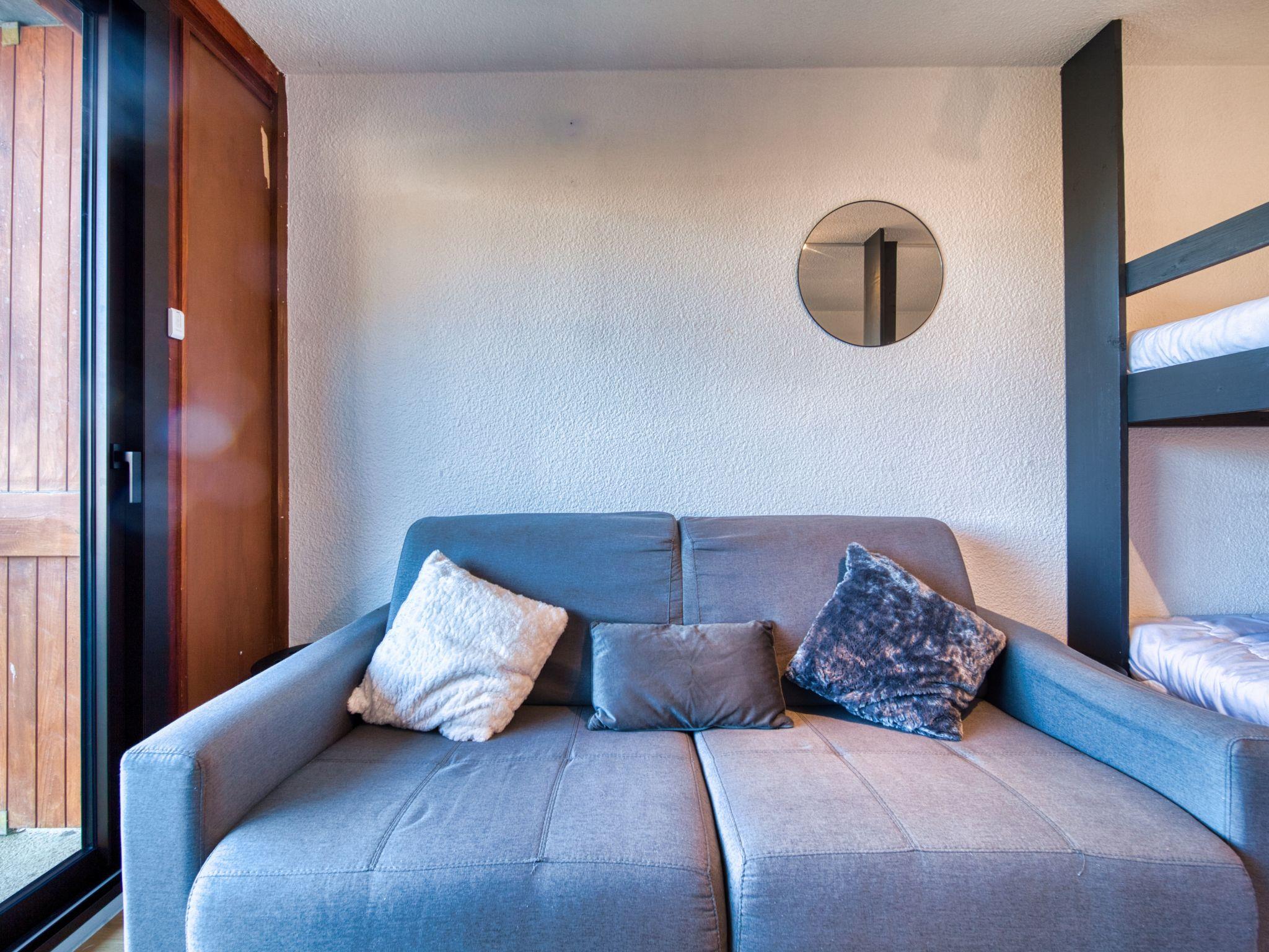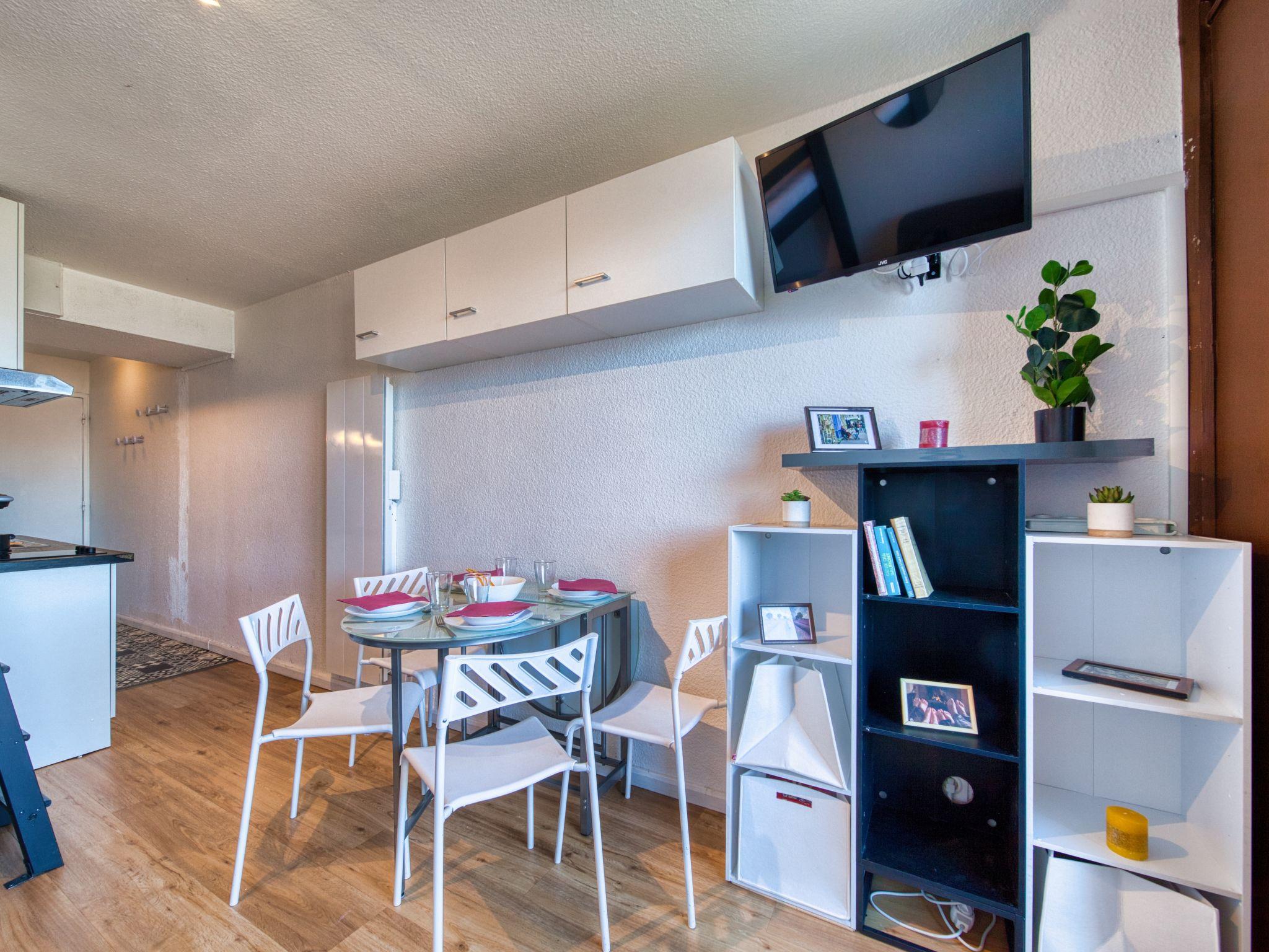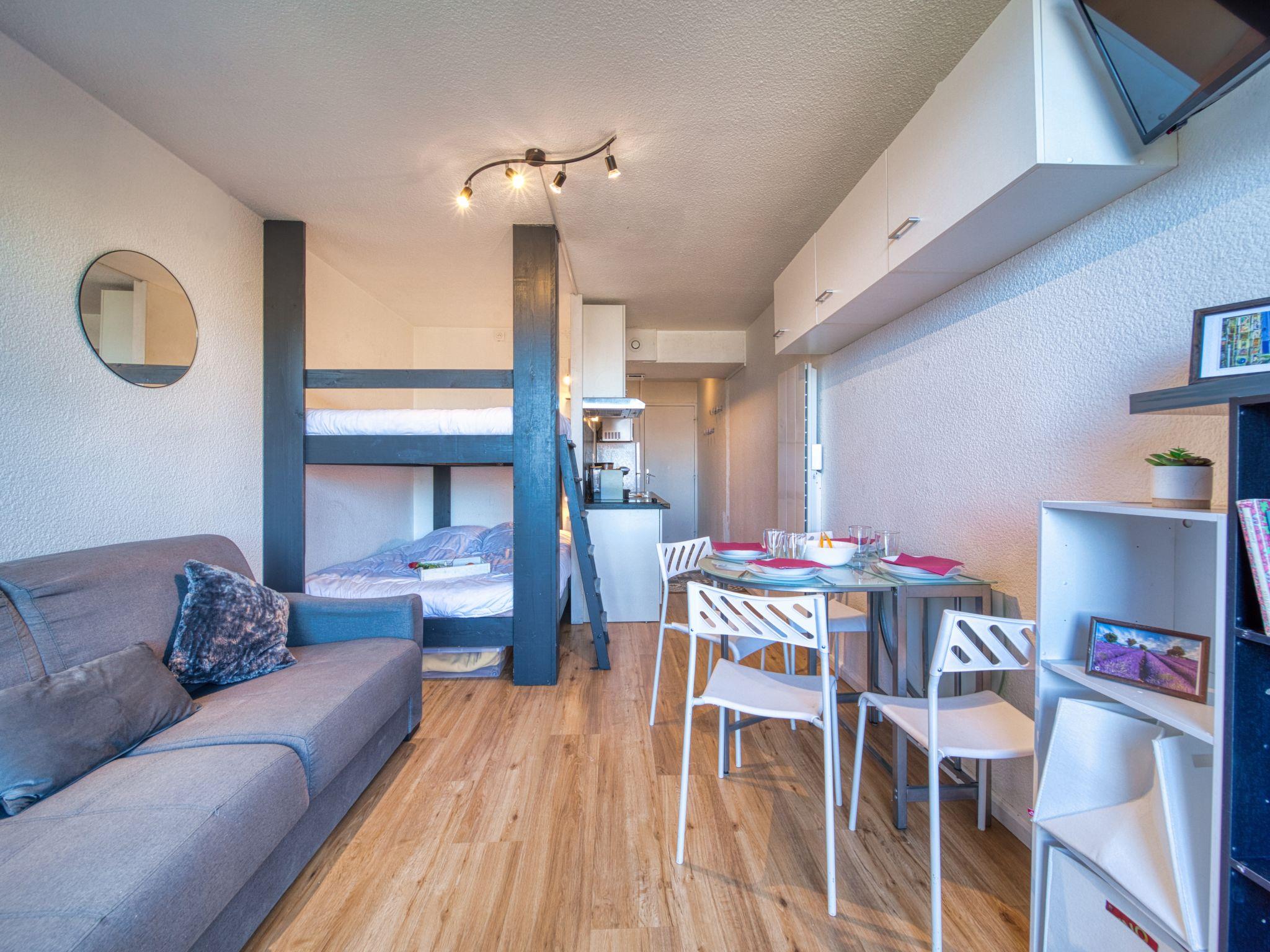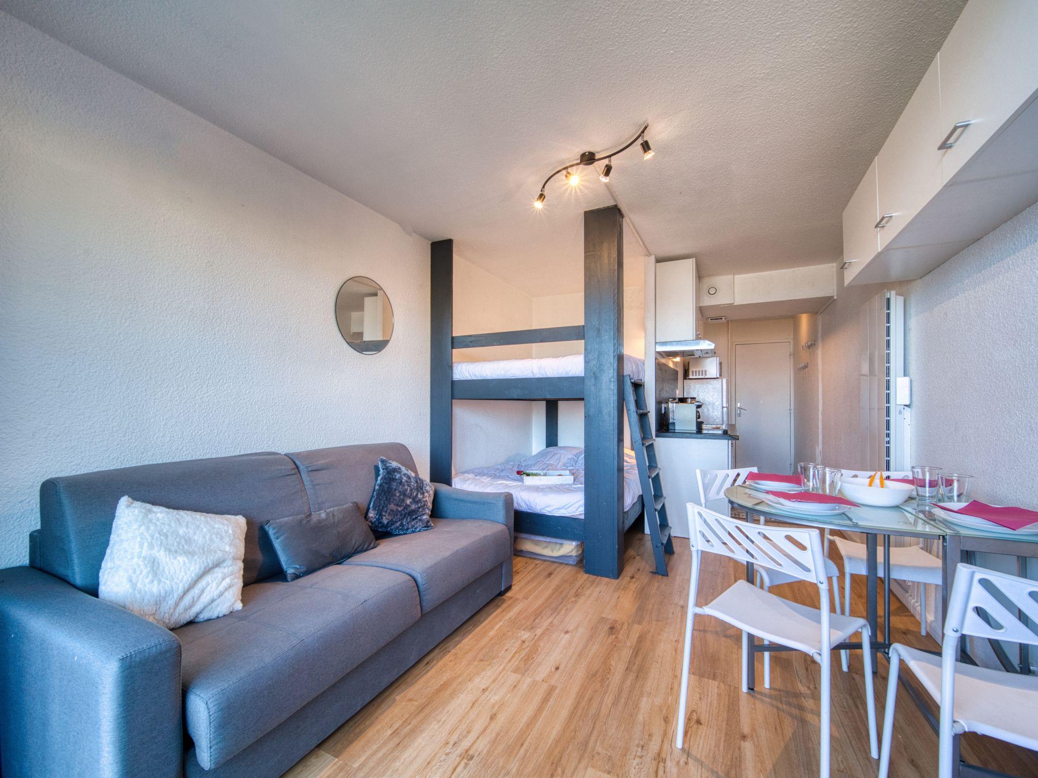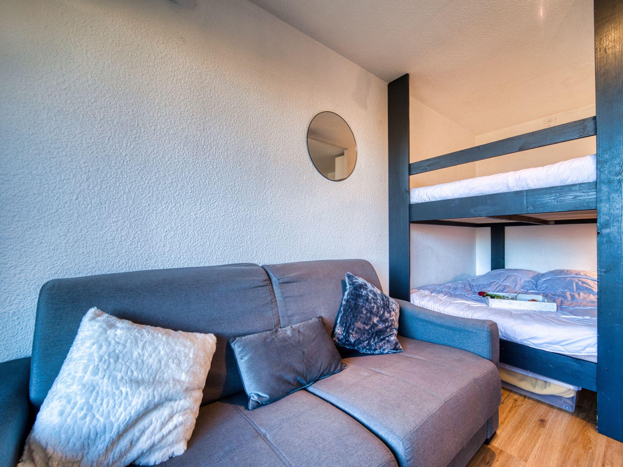 1-room studio 22 m2 on 4th floor, north facing position. Renovated: living/dining room with 1 x 2 bunk beds (140 cm, length 190 cm), TV (flat screen), electric shutters. Kitchenette in the entrance (dishwasher, 2 induction hot plates, freezer, electric coffee machine, Capsules for coffee machine (TASSIMO) extra, raclette grill). Bath/WC. Electric heating. Parquet floors. Small balcony 4 m2. Balcony furniture. View of the mountains and the valley. Facilities: Internet (WiFi, extra). Please note: non-smokers only. Smoke alarm. Offer by a private individual according to Art. 155, IV of CGI.