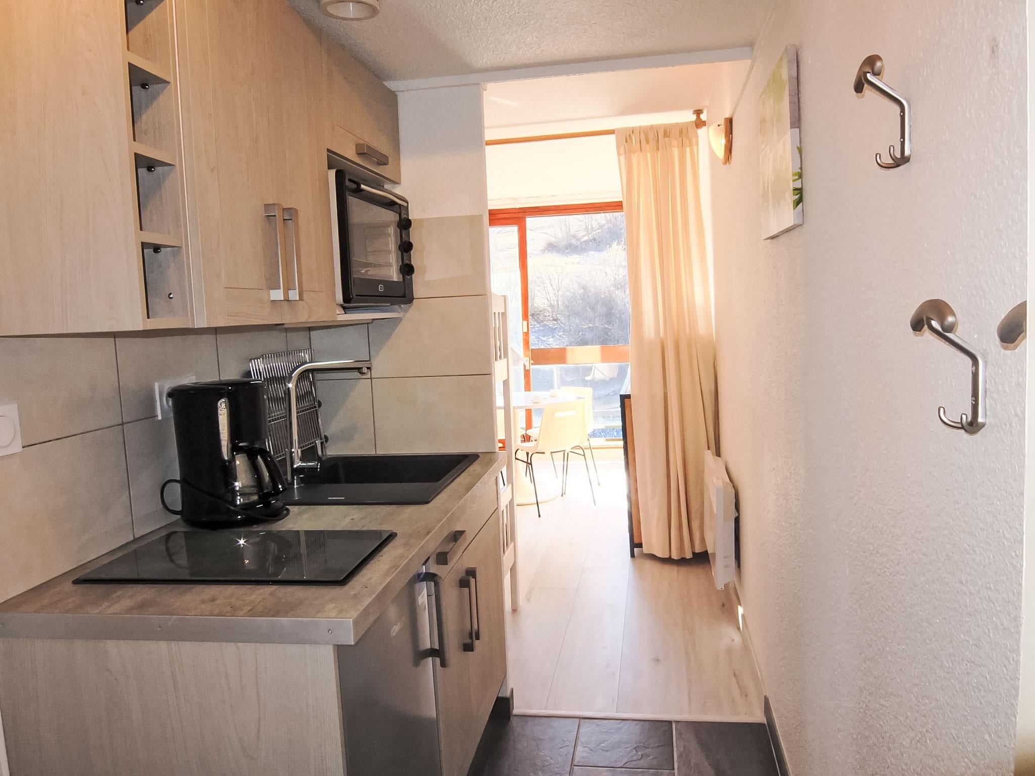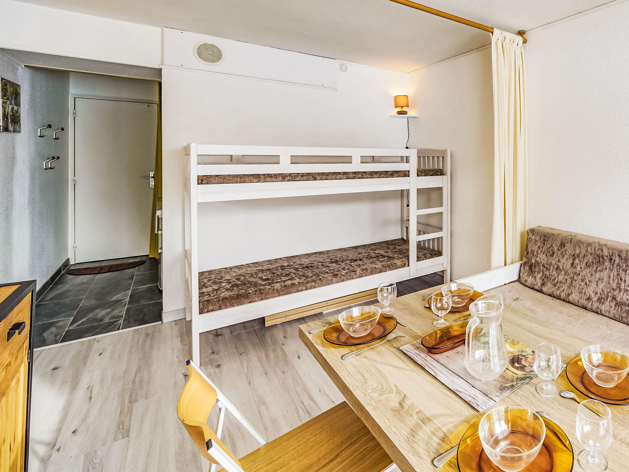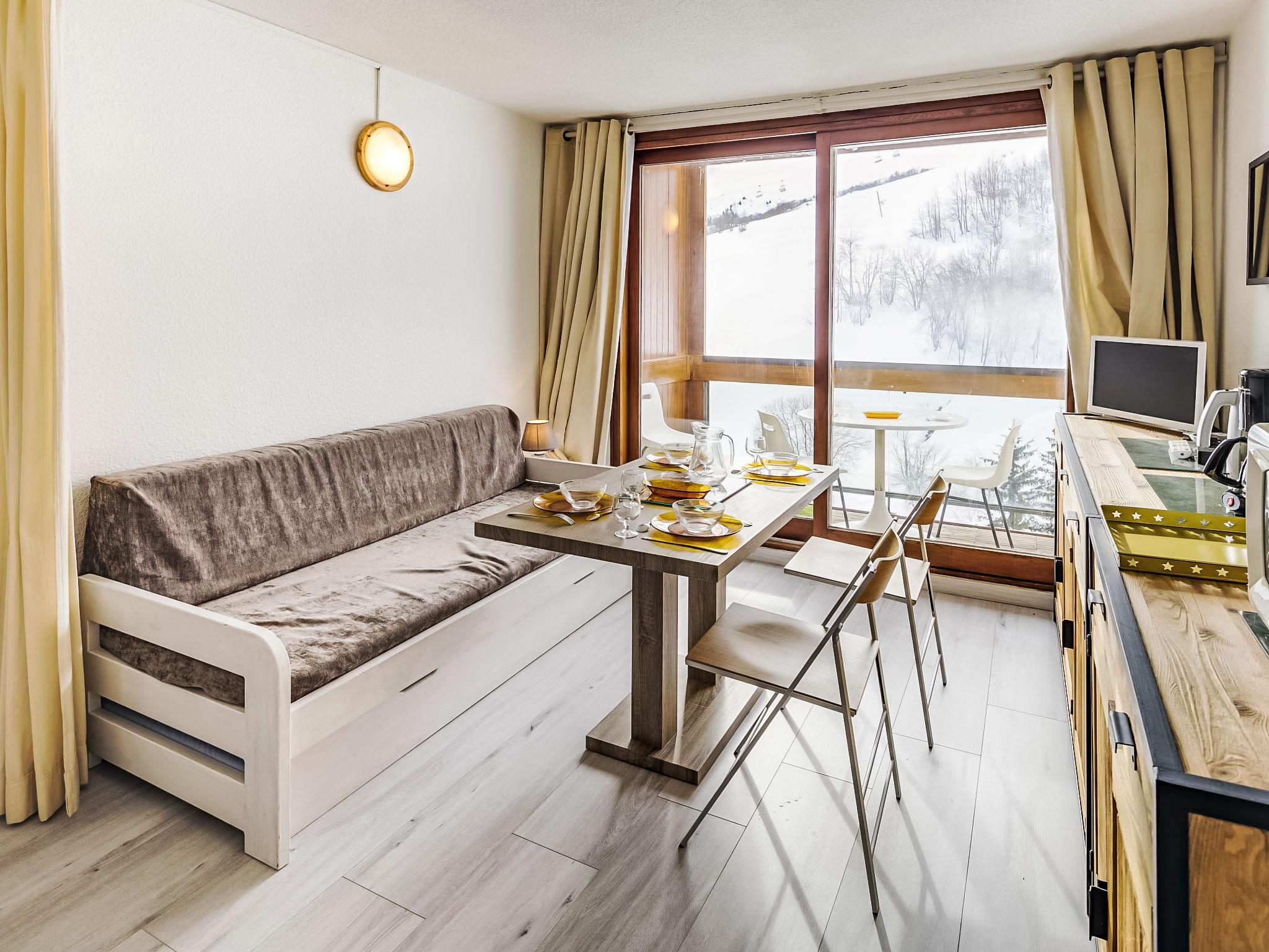 1-room studio 22 m2 on 8th floor. Beautiful furnishings: living/sleeping room with 1 x 2 bunk beds (90 cm, length 190 cm), 1 pull-out bed (2 pers. 2 x 80 cm, length 190 cm), TV (flat screen). Exit to the balcony, south facing position. Kitchenette in the entrance (oven, 2 ceramic glass hob hotplates, toaster, kettle, microwave, electric coffee machine, raclette grill, fondue Set (cheese)). Bath/WC. Electric heating. Parquet floors. Balcony 4 m2, south facing position. Balcony furniture. View of the ski run. Facilities: hair dryer. Internet (WiFi, extra). Please note: maximum 1 pet/ dog allowed. Smoke alarm. Offer by a private individual according to Art. 155, IV of CGI.