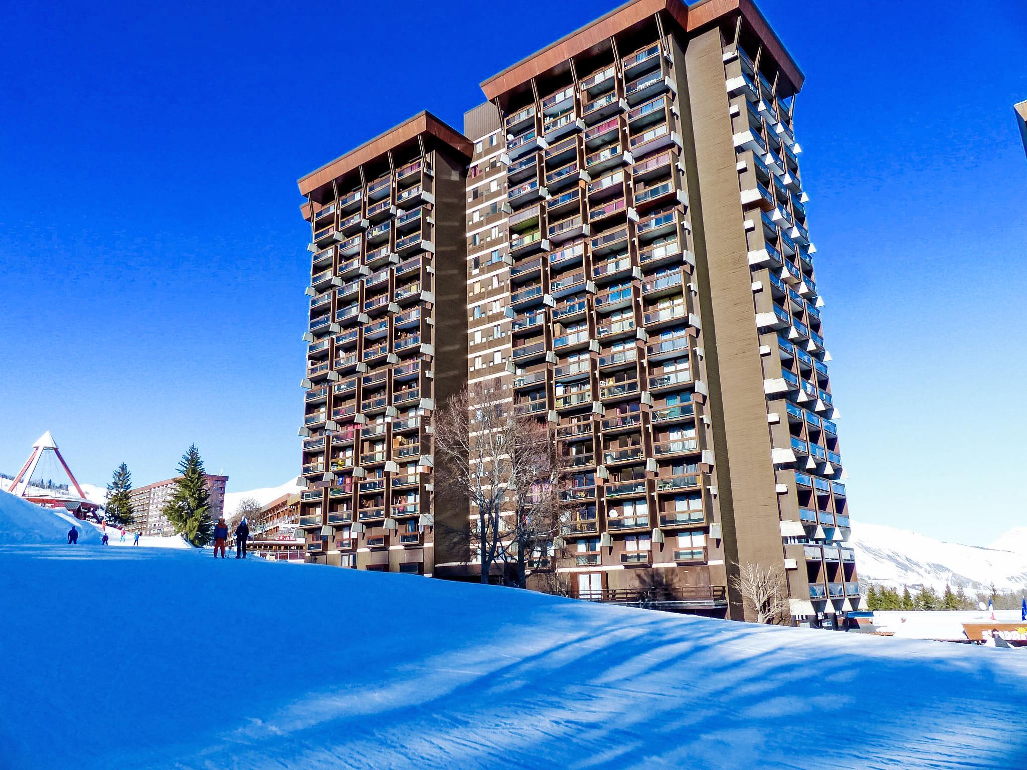 2-room apartment 32 m2 on 14th floor, south facing position. Simple furnishings: living/dining room with 1 double sofabed (130 cm, length 190 cm), TV (flat screen). Exit to the balcony, south facing position. 1 small room, window onto the living room with 1 french bed (140 cm, length 190 cm). Kitchenette (2 hot plates, toaster, kettle, electric coffee machine, raclette grill, combination microwave). Shower, sep. WC. Electric heating. Carpet. Balcony 4 m2, south facing position. Balcony furniture, deck chairs (1). View of the ski run. Facilities: Internet (WiFi, extra). Please note: non-smokers only. Smoke alarm. Instead of an enclosed bedroom, some sleeping areas are located in an open-plan area (gallery, alcove, etc.). Offer by a private individual according to Art. 155, IV of CGI.