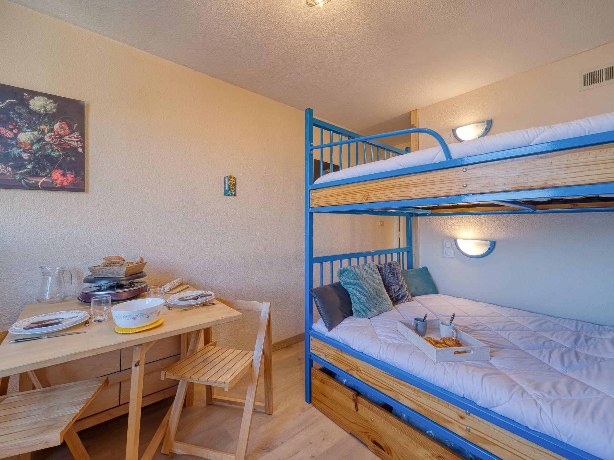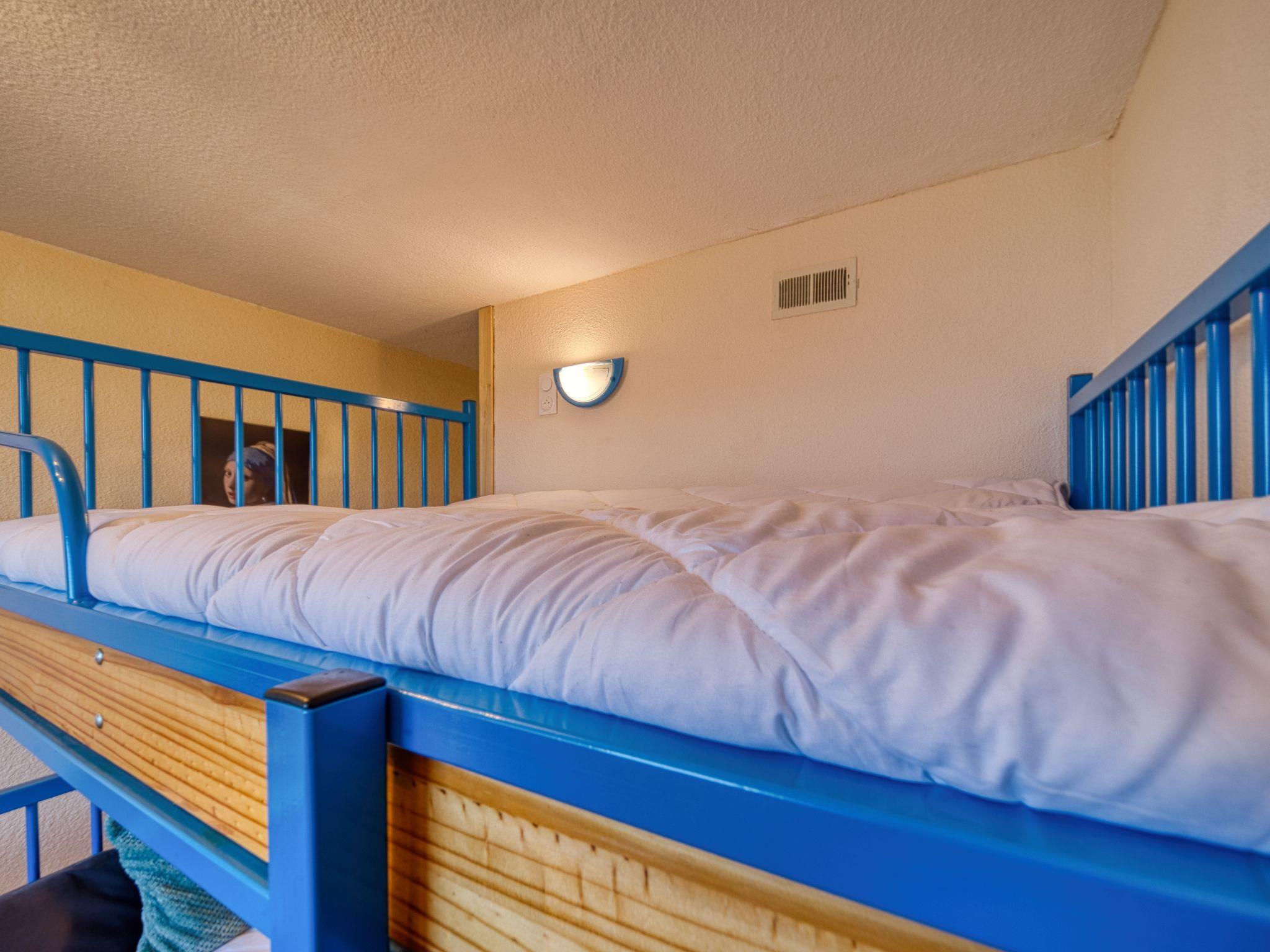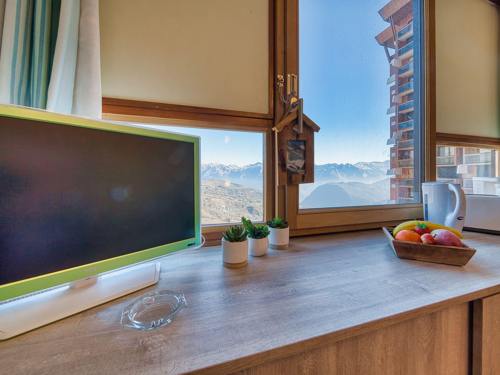 1-room studio 16 m2 on 7th floor, north facing position. Simple furnishings: living/dining room with 1 x 2 bunk beds (130 cm, length 190 cm), TV (flat screen). Kitchenette (2 ceramic glass hob hotplates, toaster, kettle, microwave, electric coffee machine, raclette grill). Bath/WC. Electric heating. Parquet floors. View of the valley. Facilities: hair dryer. Internet (WiFi, extra). Please note: non-smokers only. Maximum 1 pet/ dog allowed. Smoke alarm. Offer by a private individual according to Art. 155, IV of CGI.