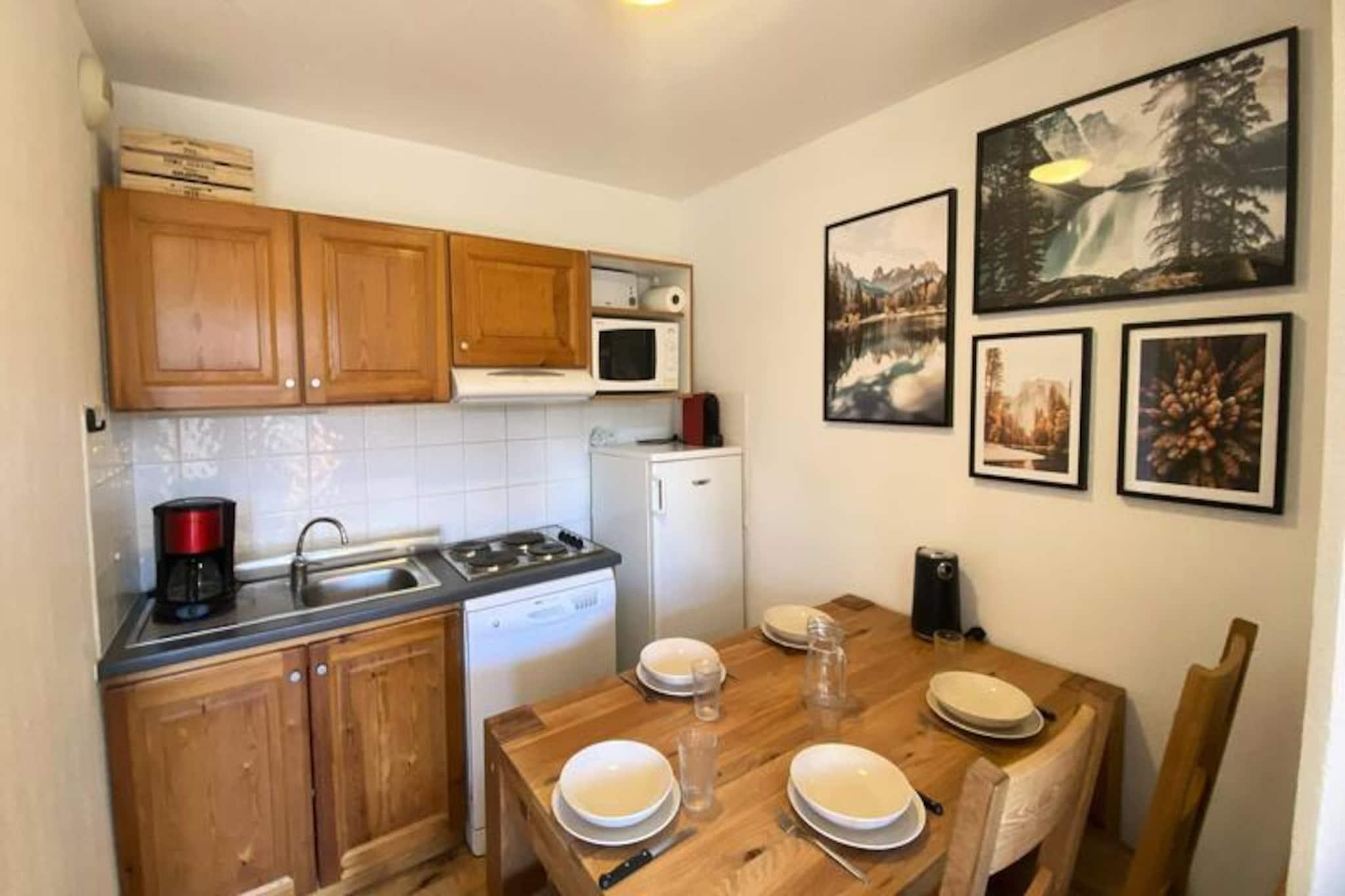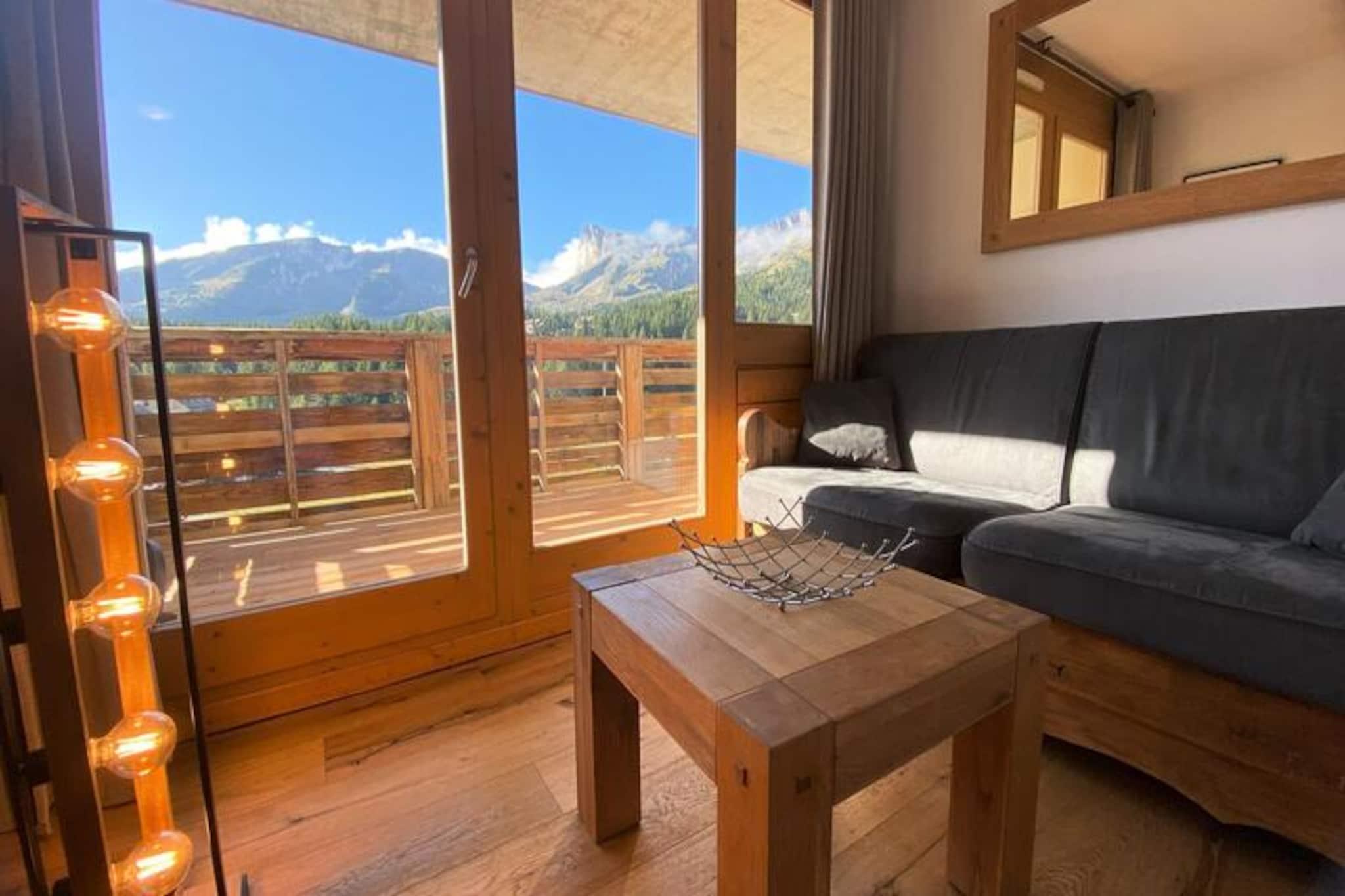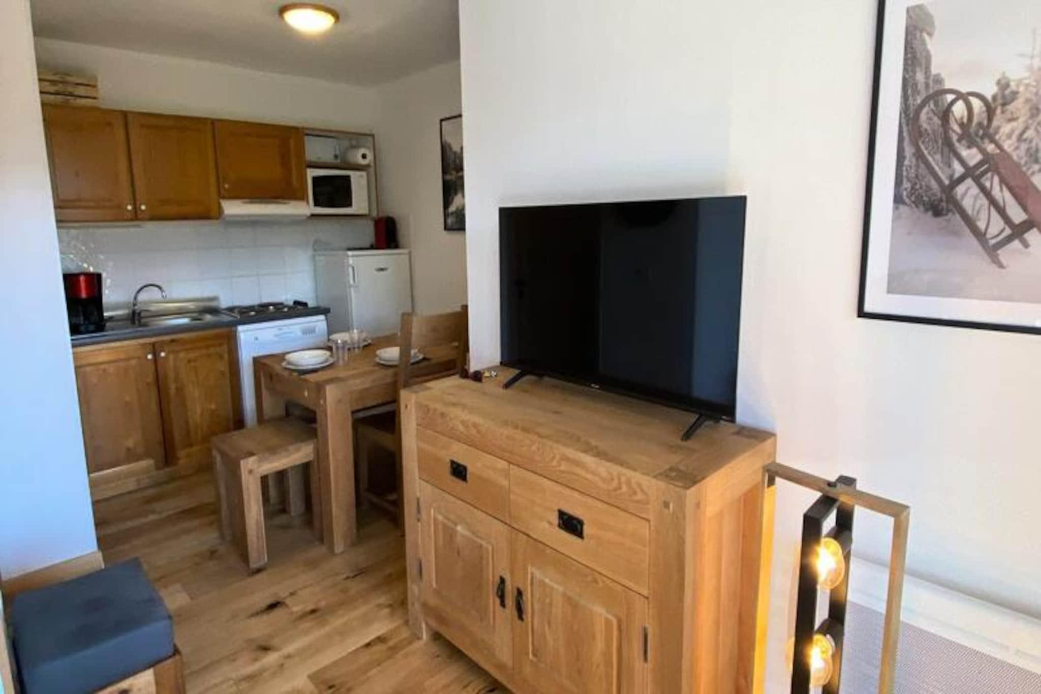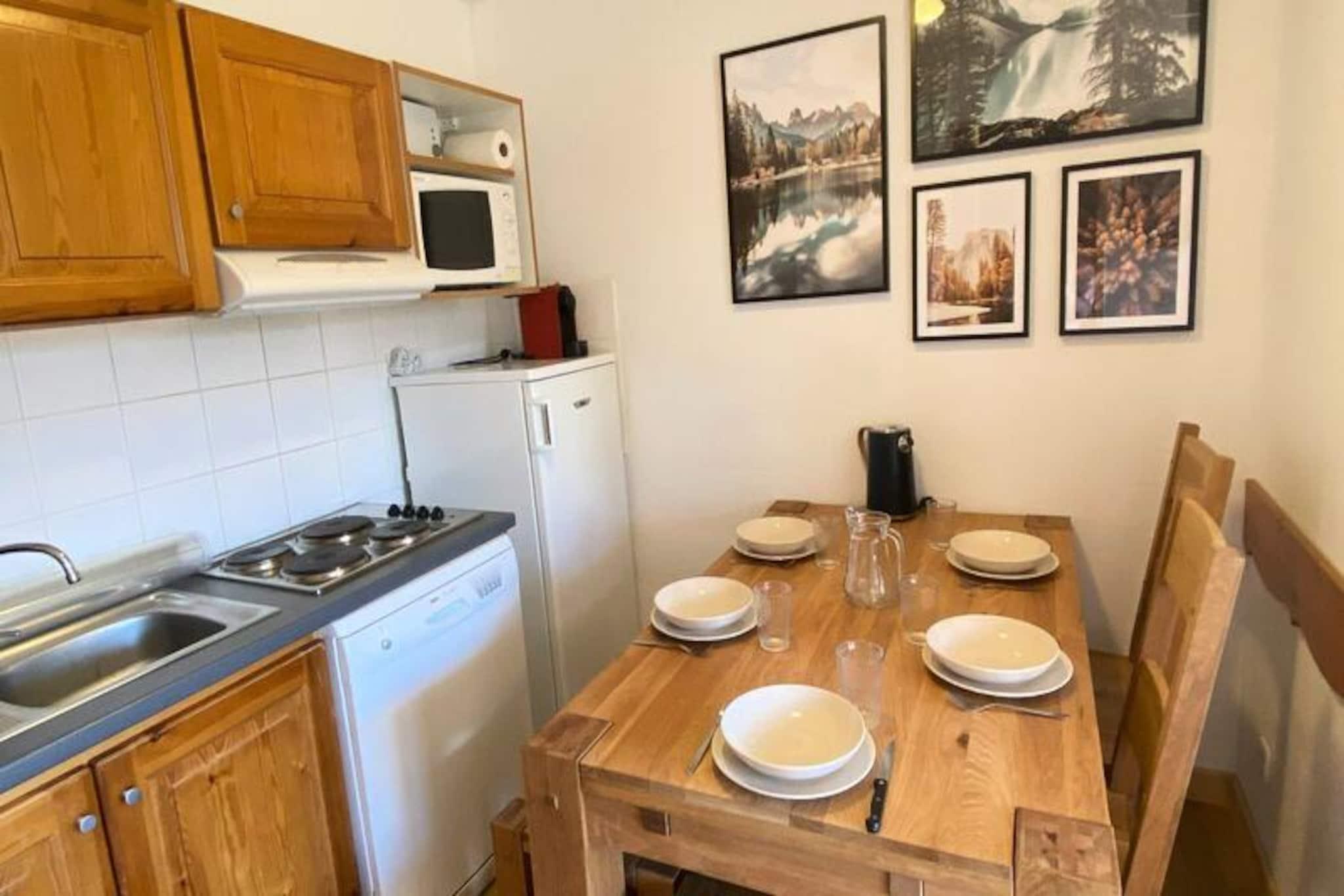 Højt oppe i de fredfyldte Dévoluy-bjerge tilbyder denne charmerende lejlighed et hyggeligt tilflugtssted for op til seks gæster, der blander alpin charme med moderne komfort. Fra din sydøstvendte balkon kan du nyde den betagende udsigt over Pic de Bure og det vidtstrakte Dévoluy-skiområde, hvor eventyr venter kun få skridt væk. Uanset om du er her for at stå på ski, vandre eller blot slappe af, er denne bolig perfekt beliggende til en mindeværdig bjergferie. \n\nLejligheden har en gennemtænkt planløsning med en dobbelt sovesofa i stuen, en køjesengsniche og et separat soveværelse med en dobbeltseng, hvilket sikrer komfort for familier eller små grupper. Det fuldt udstyrede tekøkken inkluderer en ovn, et stort køleskab, opvaskemaskine og både en filterkaffemaskine og en Nespresso-maskine, hvilket gør det nemt at tilberede solide måltider efter en dag med udforskning. Moderne bekvemmeligheder såsom et tv og gratis parkering omkring boligen gør dit ophold mere behageligt. For dem, der søger overdækket parkering, kan der lejes pladser efter reservation. \n\nBeliggende kun 100 meter fra ski-in/ski-out-gangbroen har du direkte adgang til turistkontoret og pisterne, hvilket gør det nemt at dykke ned i de alpine aktiviteter. Kæledyr er velkomne, og yderligere tjenester såsom leje af linned og rengøringspakker er tilgængelige for at forbedre dit ophold. \n\nUanset om du nyder bjergudsigten fra din balkon eller snowboarder i frisk puddersne på pisterne, tilbyder denne lejlighed i Superdévoluy den perfekte blanding af komfort, bekvemmelighed og naturlig skønhed til din næste alpine ferie.