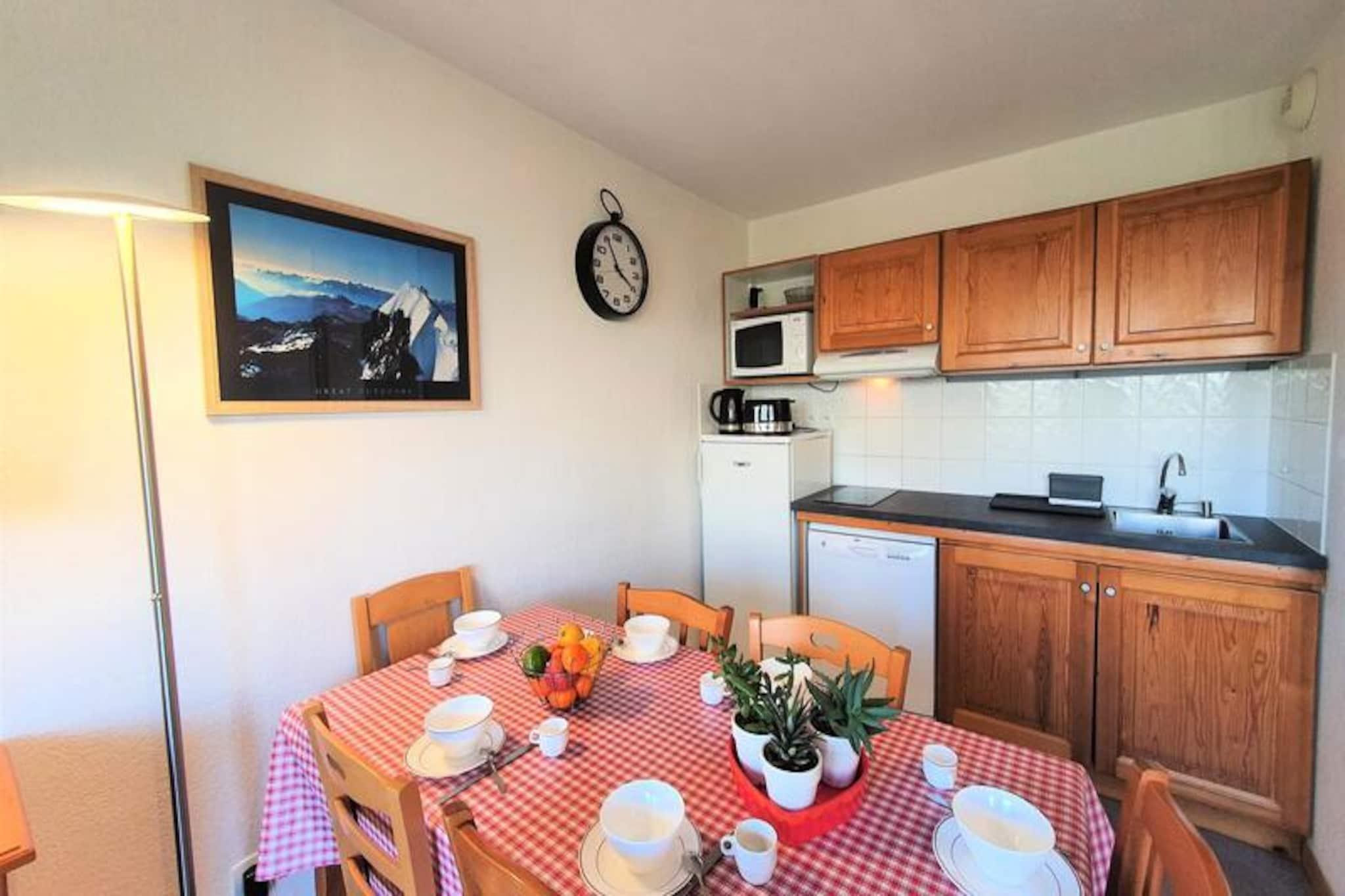 I de franske alpers fredfyldte omfavnelse tilbyder residensen 'Les Chaumettes' en charmerende alpin oase med betagende udsigt over den majestætiske Pic de Bure. Beliggende kun 80 meter fra gangbroen, der forbinder til skiløjperne og turistkontoret, er denne ejendom et paradis for både vintersportsentusiaster og naturelskere. Forestil dig at vågne op til solopgangens gyldne nuancer over bjergene, træde ud på din sydøstvendte balkon og indånde den friske alpine luft, inden du begiver dig ud på en dag med eventyr. \n\nDenne hyggelige 2-værelses lejlighed, beliggende på 3. sal, har komfortabel plads til op til seks gæster. Stuen har en udtrækssovesofa, mens en sovealkove med køjesenge og et separat soveværelse med en dobbeltseng giver ekstra sovepladser. Det fuldt udstyrede køkken har moderne bekvemmeligheder såsom køleskab, opvaskemaskine, mikrobølgeovn og både Nespresso- og filterkaffemaskine, hvilket sikrer et praktisk og behageligt ophold. Efter en dag på pisterne kan du slappe af i opholdsstuen med et tv eller nyde den fantastiske udsigt over bjergene fra din private balkon.\n\nResidensen tilbyder gratis parkering omkring ejendommen, og der kan lejes overdækkede parkeringspladser. Skiløjperne ligger kun 100 meter væk, hvilket giver direkte adgang via den nærliggende gangbro. For ekstra bekvemmelighed er der mulighed for at leje linned og få rengøring ved opholdet, og kæledyr er velkomne mod et mindre gebyr.\n\nUanset om du er her for at grave dig gennem uberørt sne, udforske de naturskønne stier eller blot slappe af midt i de franske alpers skønhed, lover 'Les Chaumettes' et uforglemmeligt alpint tilflugtssted. Med sin førsteklasses beliggenhed og indbydende faciliteter er dette den perfekte base for dit næste bjergeventyr.