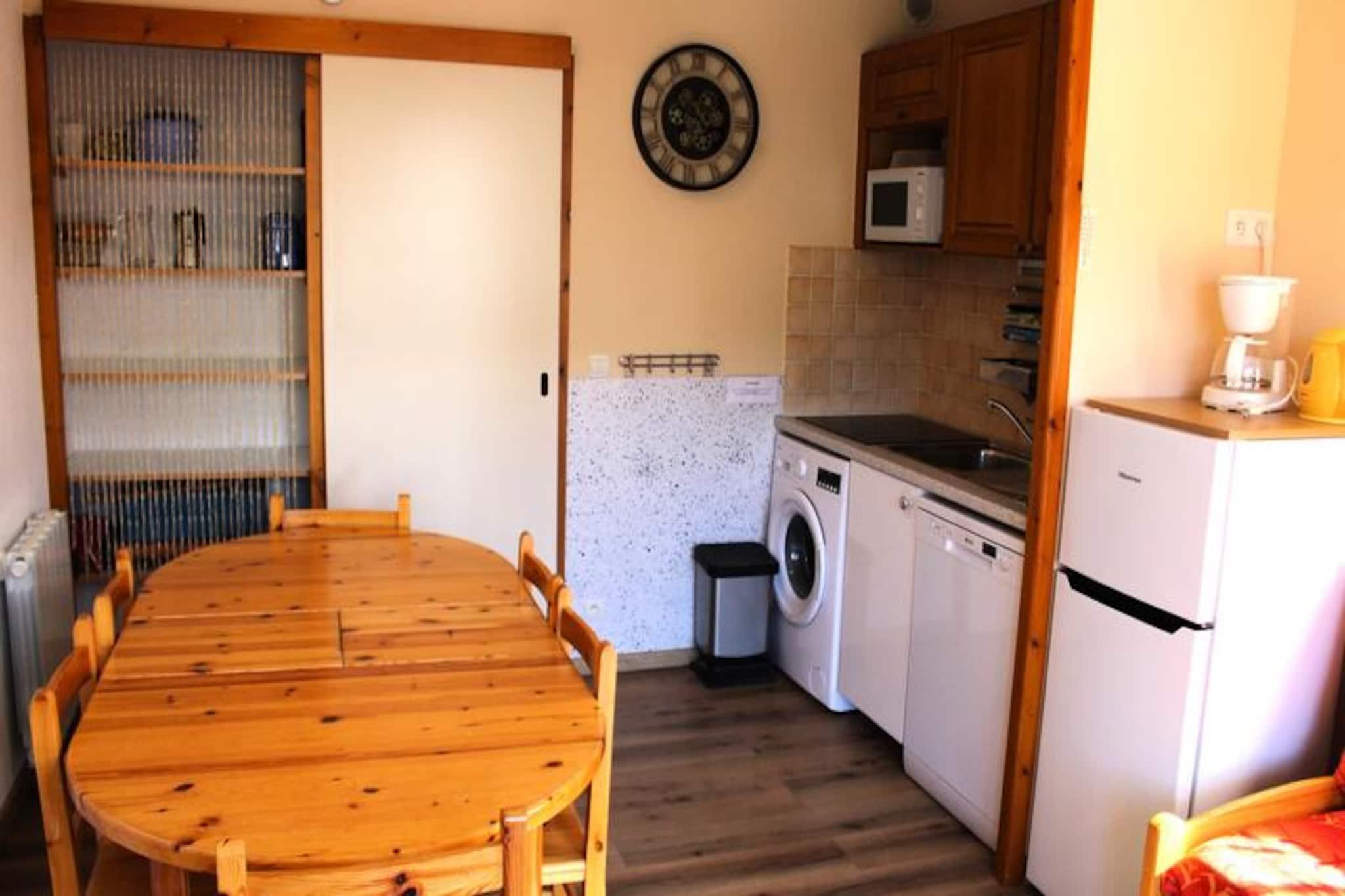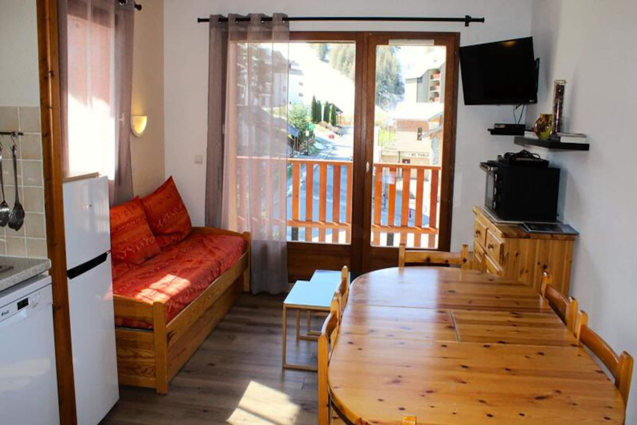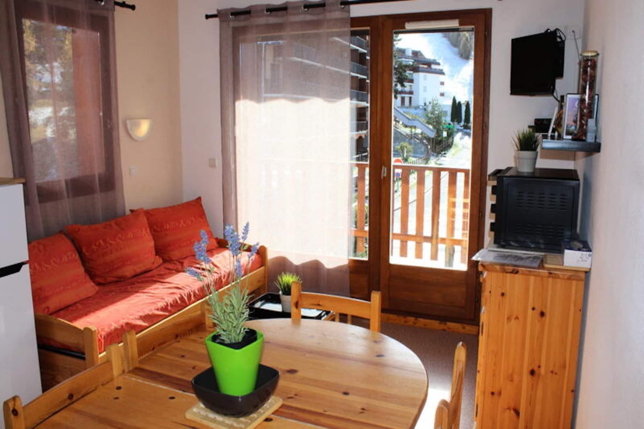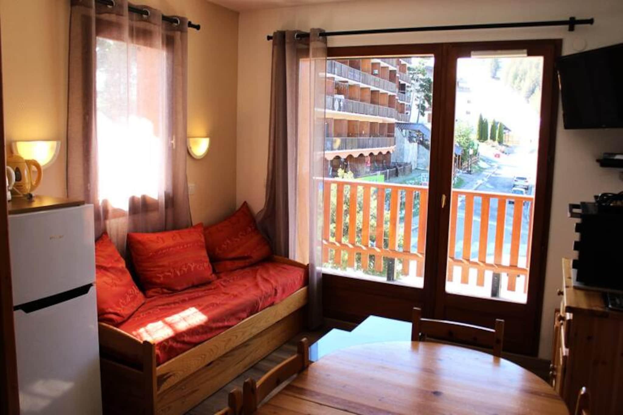 Højt over de fredfyldte landskaber i La Joue du Loup inviterer denne charmerende lejlighed dig til at opleve magien i de franske alper i enhver sæson. Med sin uovertrufne beliggenhed ved foden af ??pisterne og i hjertet af feriestedet, vågner du hver morgen op til en betagende udsigt over skiområdet og den livlige landsbymidte, alt sammen badet i det gyldne lys fra den sydvendte sol. Uanset om du er her for spændende vintersport eller rolige sommervandreture, tilbyder denne bolig den perfekte base for dine alpine eventyr. \n\nTræd indenfor og oplev et gennemtænkt designet rum, der komfortabelt rummer op til otte gæster. Lejligheden har en hyggelig stue med en udtræksseng, et fuldt udstyret tekøkken med kogeplader, ovn, køleskab, opvaskemaskine og vaskemaskine samt et soveværelse med en dobbeltseng. To sovealkover med køjesenge giver yderligere sovemuligheder, hvilket gør den ideel til familier eller vennegrupper. En privat balkon tilbyder et fredeligt tilflugtssted til at nyde bjergluften, mens moderne bekvemmeligheder som et fjernsyn sikrer afslapning efter en aktiv dag. \n\nUd over lejligheden tilbyder feriestedet et væld af attraktioner. Wellnesscentret O'dycéa ligger kun få minutter væk, hvor du kan slappe af i de luksuriøse afslapningsområder efter en dag på pisterne. I nærheden finder du butikker, restauranter og underholdningsmuligheder, der bringer landsbyen til live. Om sommeren kan du udforske naturskønne stier, cykle gennem alpine enge eller blot nyde roen i dette bjergparadis. \n\nUanset om du søger eventyr eller afslapning, kombinerer denne bolig komfort, bekvemmelighed og fantastisk naturlig skønhed for at skabe uforglemmelige minder i hjertet af Dévoluy-bjergene.