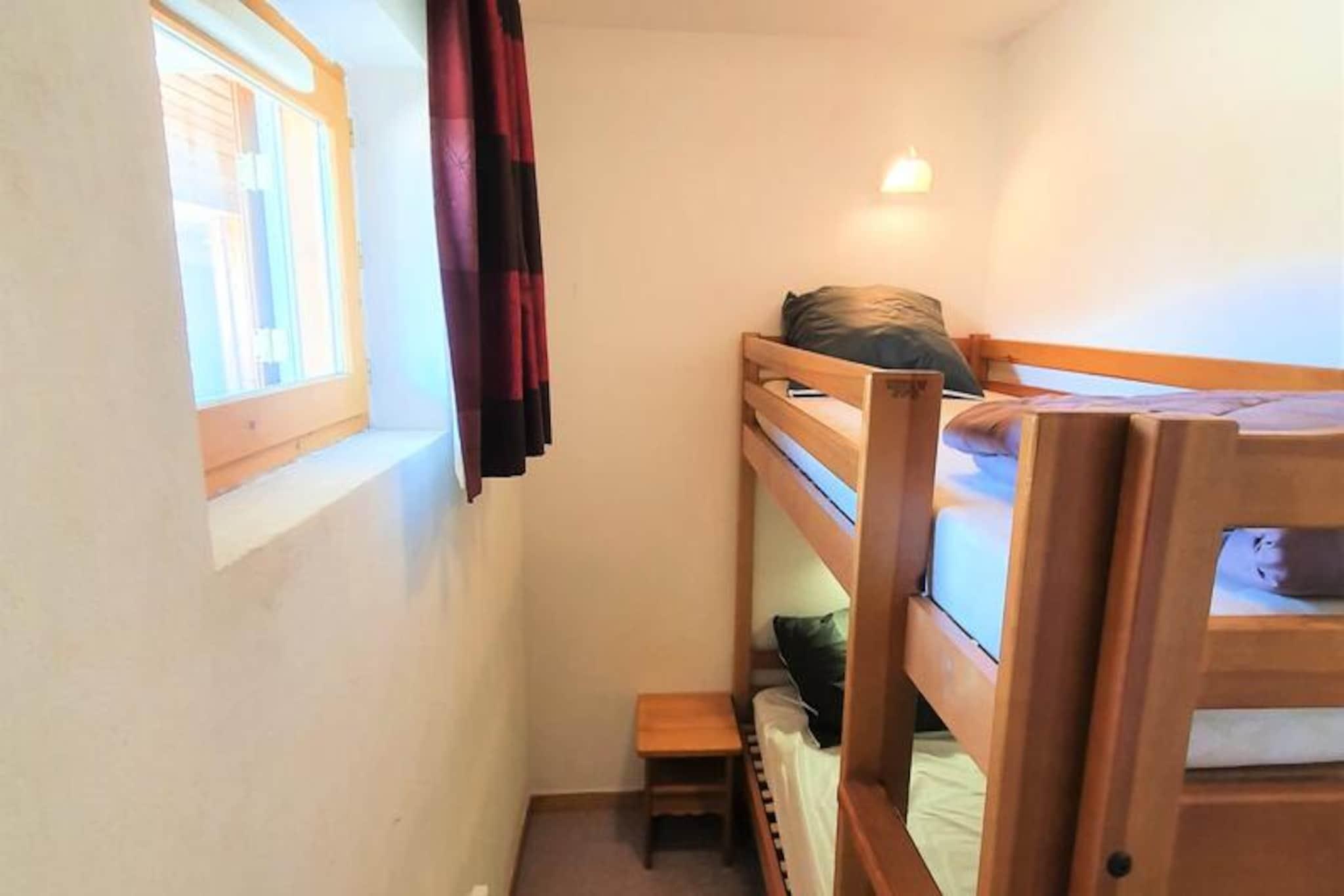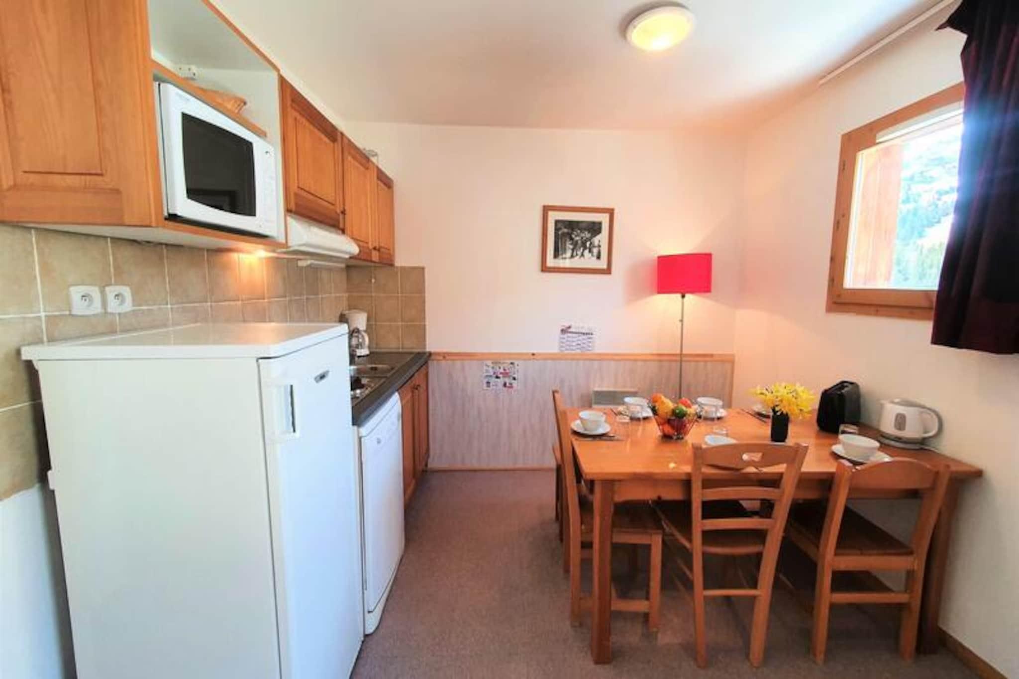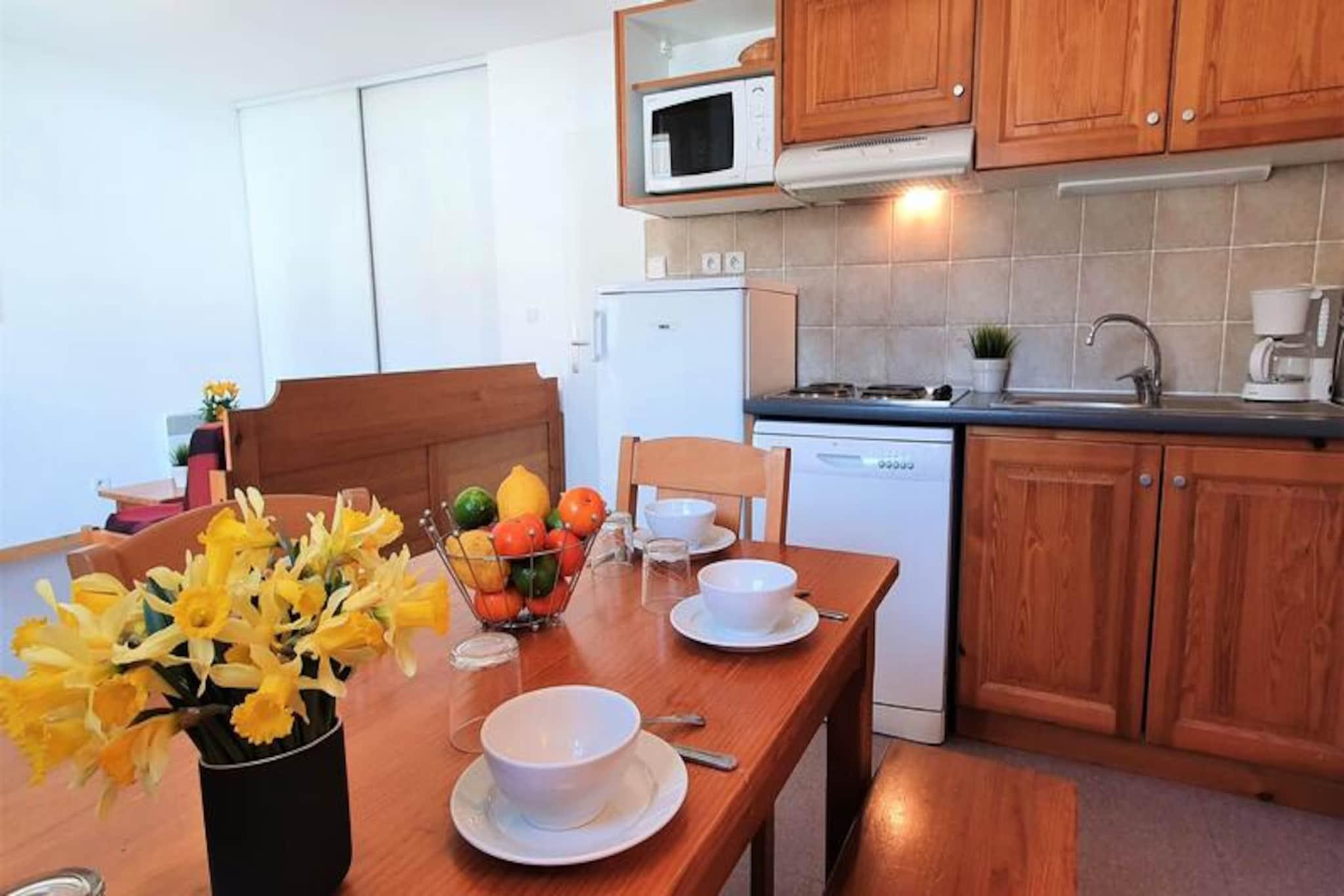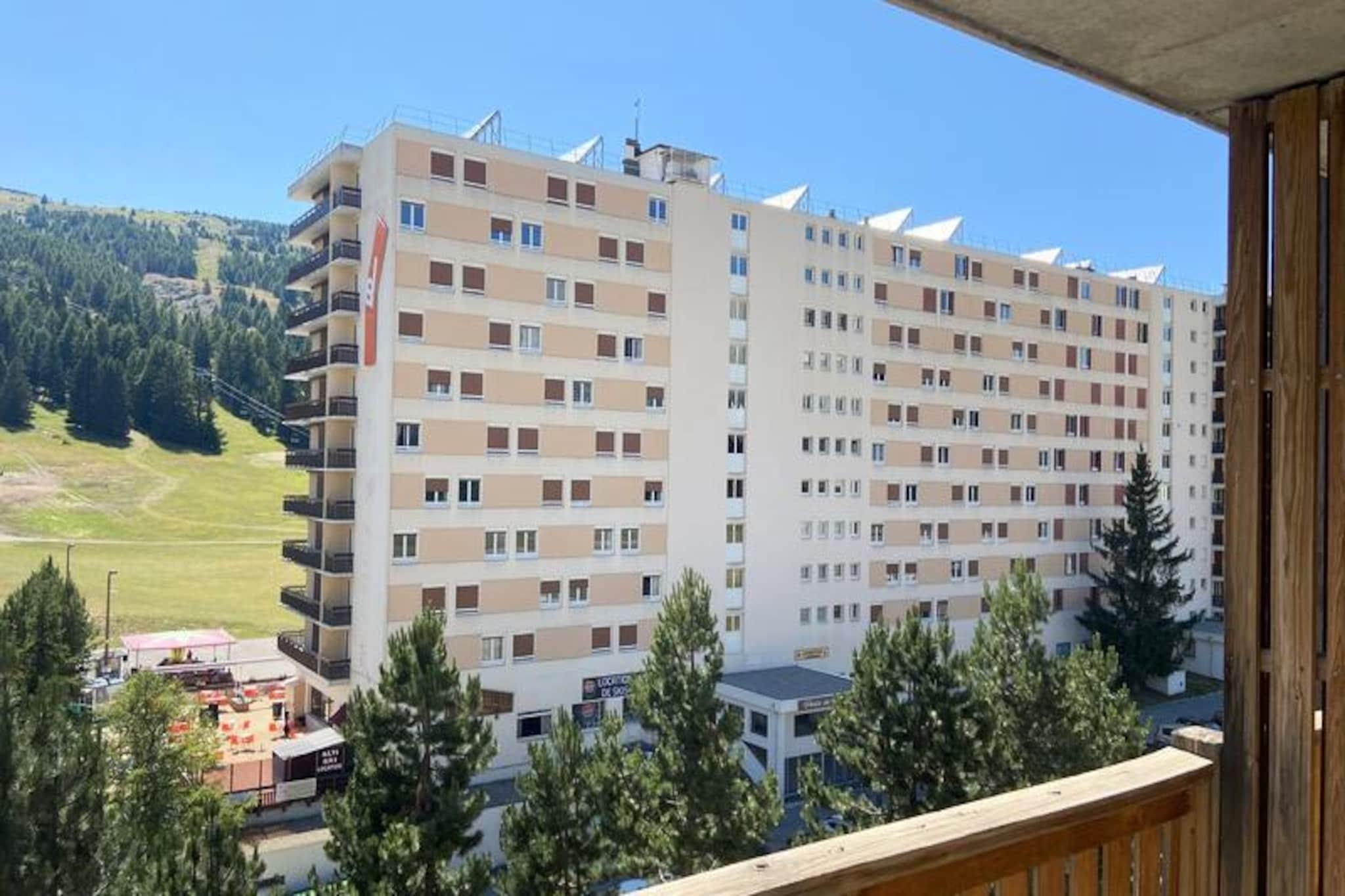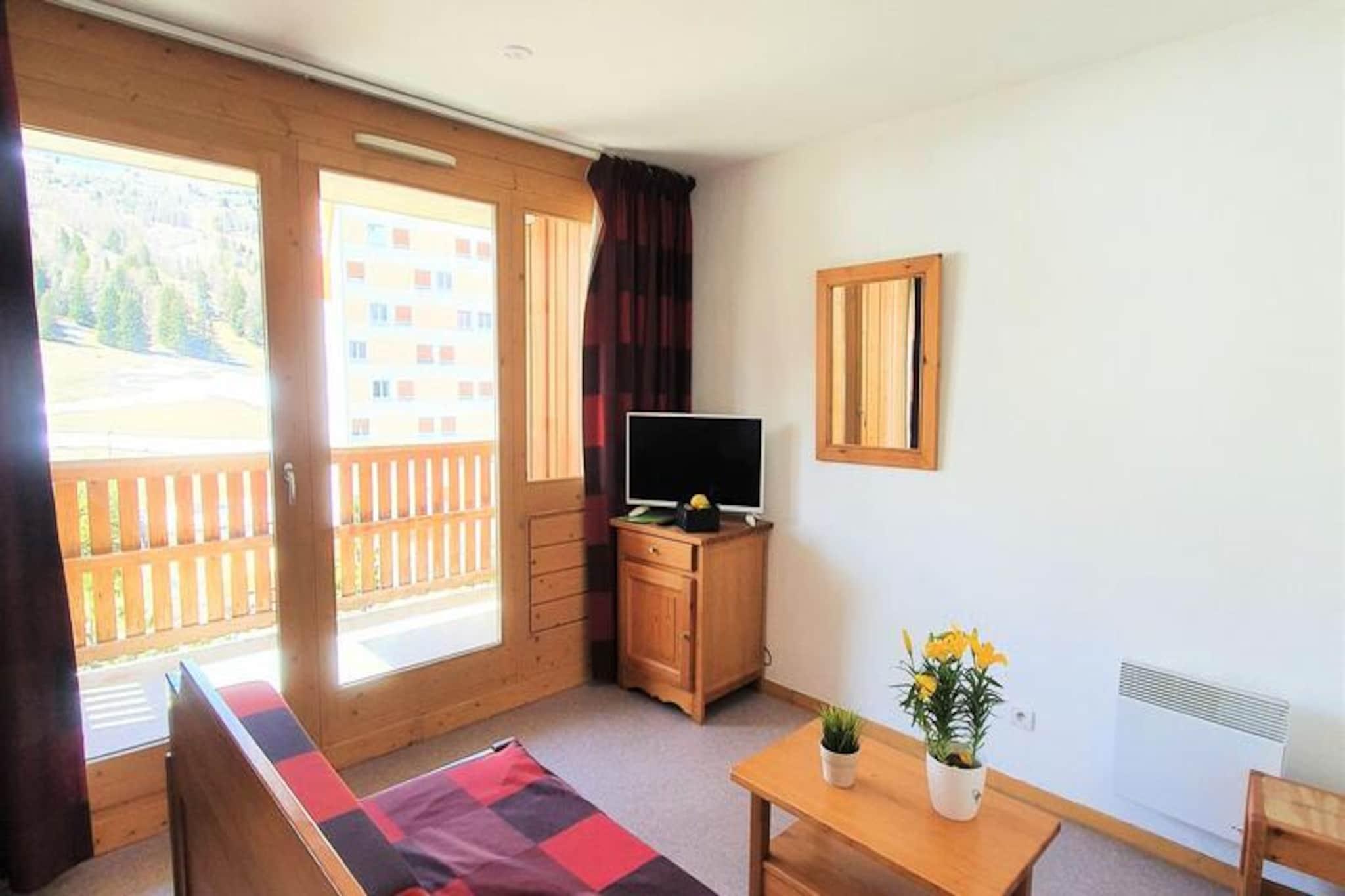 Højt over de fredfyldte dale i de franske alper tilbyder denne indbydende lejlighed et hyggeligt tilflugtssted for både eventyrere og naturelskere. Med en betagende udsigt over det majestætiske Pic de Bure er boligen perfekt placeret til at indfange skønheden i Superdévoluys barske bjerglandskab. Uanset om du er her for at stå på ski, vandre eller blot slappe af, lover de rolige omgivelser og den friske alpeluft en foryngende flugt. Den sydvendte balkon er det ideelle sted at nyde landskabet og sole sig i varmen fra solen, når den går ned over bjergtoppene. \n\nIndenfor har lejligheden komfortabel plads til op til seks gæster med gennemtænkt design og moderne bekvemmeligheder. Stuen har en udtrækssovesofa til to personer, mens soveværelset tilbyder en blød dobbeltseng (160x200 cm) til afslappende nætter. En hyggelig alkove med køjesenge tilføjer et legende præg til familier eller grupper. Tekøkkenet er fuldt udstyret med opvaskemaskine, mikrobølgeovn/grill, filterkaffemaskine og brødrister, hvilket gør det nemt at tilberede solide måltider efter en dag med eventyr. Slap af med en film på fjernsynet, eller gå ud på balkonen og nyd den friske bjergluft.\n\nResidensen ligger kun 100 meter fra pisterne og tilbyder direkte adgang via en bekvem gangbro, så du aldrig er langt fra alt, hvad der sker. Gratis parkering omgiver ejendommen, og der kan lejes overdækket parkering. Det nærliggende turistkontor ligger kun få skridt væk og giver dig alle de oplysninger, du har brug for, for at udforske området. Uanset om du står på ski om vinteren eller vandrer om sommeren, er Superdévoluy en indgang til uforglemmelige alpine oplevelser.\n\nVælg denne charmerende lejlighed på grund af dens uovertrufne beliggenhed, fantastiske udsigt og komfortable faciliteter. Det er mere end et sted at bo - det er dit hjem i hjertet af de franske alper.