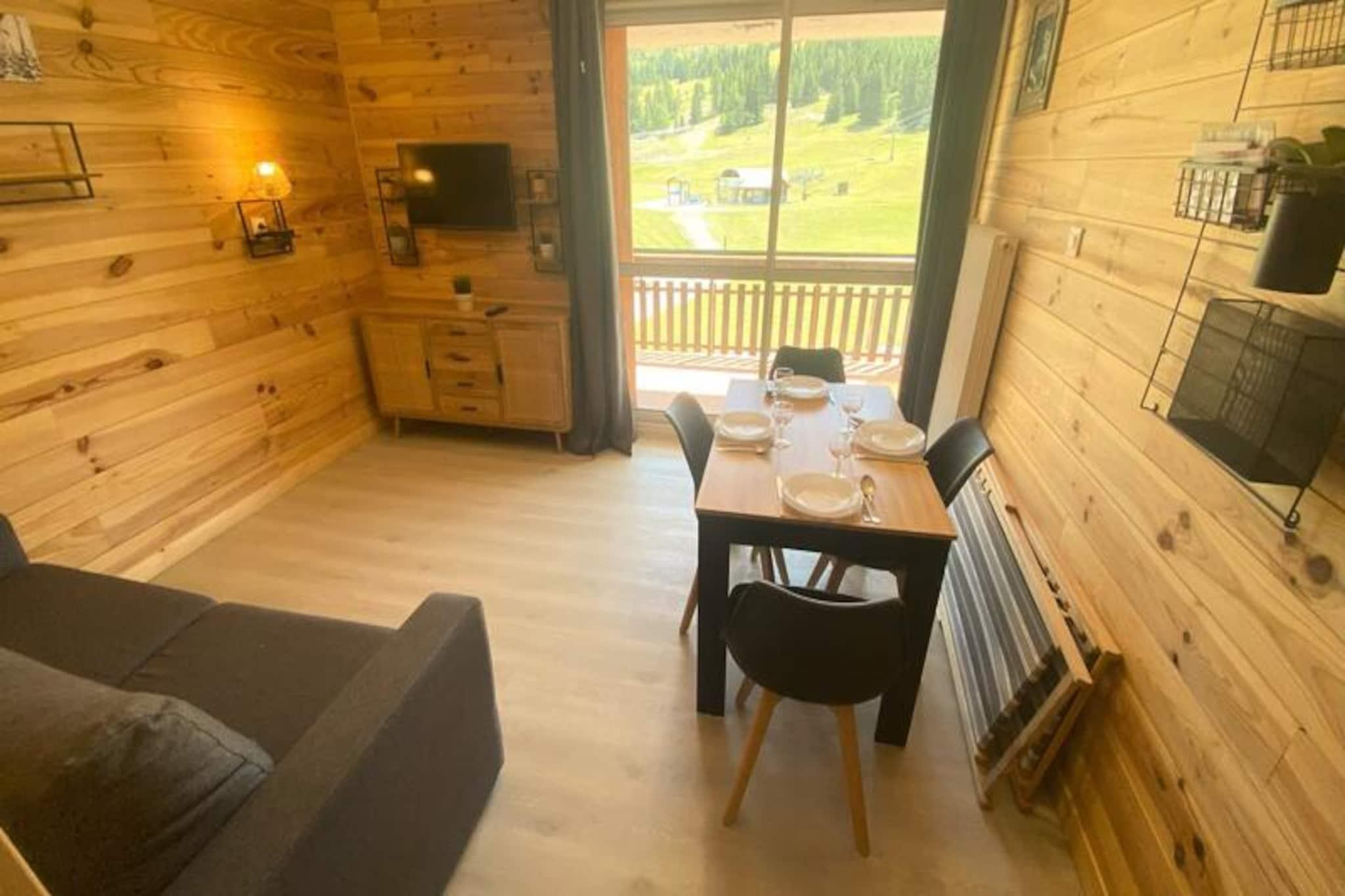 Højt over Superdévoluys fredfyldte landskaber inviterer dette charmerende studie dig til at opleve magien i de franske alper. Med en betagende udsigt over Pic de Bure og Faraud-bjerget føles hvert øjeblik her som et postkort, der kommer til live. Uanset om du nipper til din kaffe på din sydvendte balkon eller kigger ud over dalen fra din hyggelige opholdsstue, omgiver naturens skønhed dig i alle retninger. Denne bolig, der er perfekt beliggende ved foden af ??pisterne, tilbyder uovertruffen adgang til alpine eventyr. \n\nIndenfor er studiet omhyggeligt designet til op til fire gæster og blander komfort og praktisk anvendelighed. Stuen har spiseplads og en dobbelt sovesofa, mens en separat sovealkove med køjesenge sikrer privatliv og bekvemmelighed. Tekøkkenet er fuldt udstyret med elektriske kogeplader, ovn, mikrobølgeovn, brødrister, kaffemaskine og køleskab, hvilket gør det nemt at tilberede måltider efter en dag på pisterne. Badeværelset har bruser, håndvask og toilet, hvilket fuldender rummet med moderne bekvemmeligheder. I stueetagen finder du alle de nødvendige butikker og tjenester, herunder restauranter og skiudlejning, hvilket gør dit ophold ubesværet og behageligt. Gratis parkering omgiver boligen, mens overdækket parkering er tilgængelig efter reservation. For ekstra bekvemmelighed tilbydes der leje af linned og slutrengøring, hvilket sikrer en stressfri ferie. Kæledyr er velkomne, så dine pelsede venner kan være med på det sjove. Uanset om du er her for at stå på ski, vandre eller bare slappe af, er dette studie i Superdévoluy din port til uforglemmelige alpine minder. Lad de majestætiske tinder og den friske bjergluft inspirere dit næste eventyr.