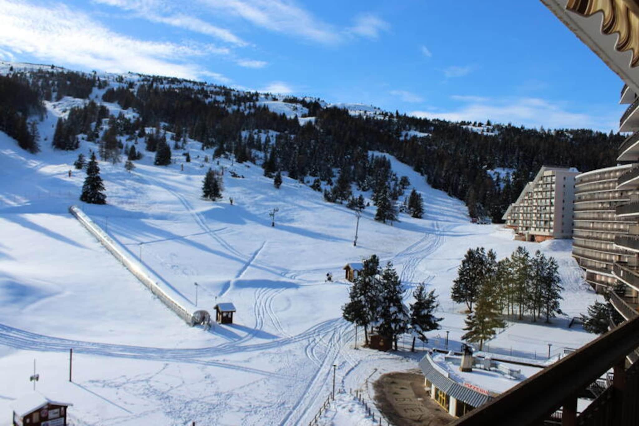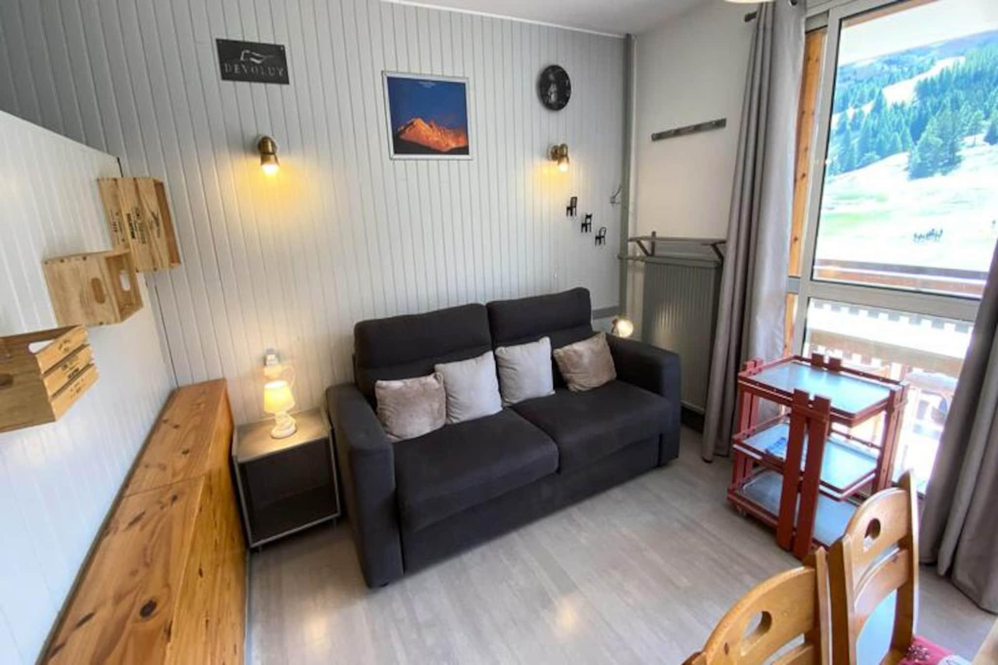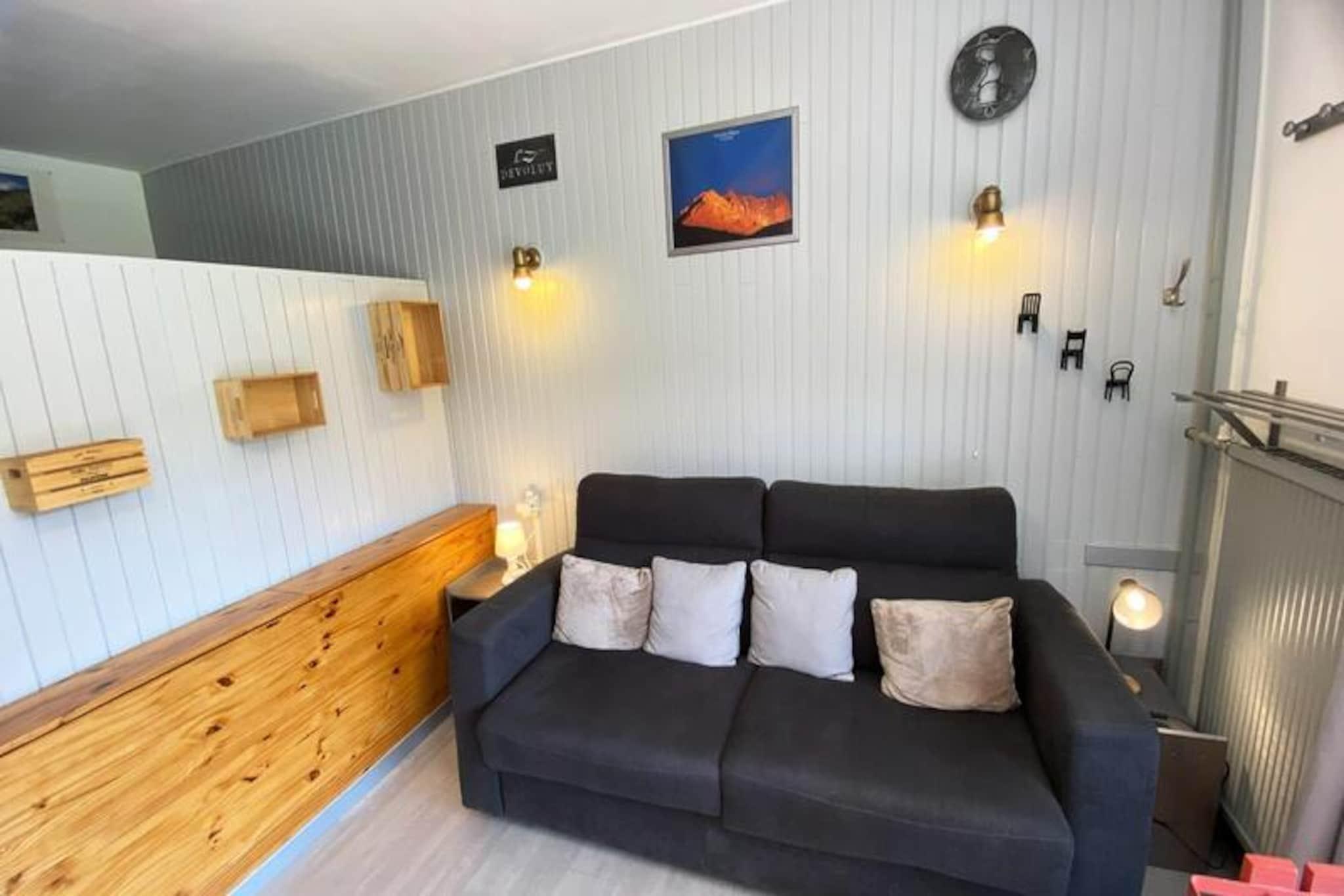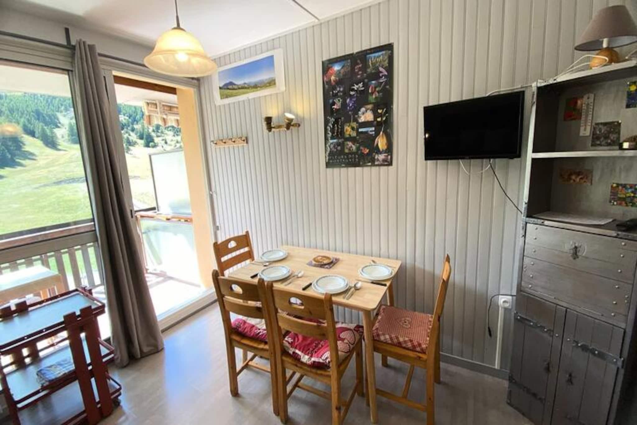 Højt over Superdévoluys fredfyldte landskaber tilbyder dette charmerende studie en unik blanding af alpin arv og moderne komfort. Ejendommen er beliggende i en residens fra 1970'erne, der er anerkendt som en arkitektonisk perle fra det 20. århundrede, og har direkte adgang til pisterne, hvilket gør det til et ideelt tilflugtssted for både skientusiaster og naturelskere. Uanset om du kigger ud over det majestætiske Pic de Bure eller det rolige Faraud-bjerg, er udsigten fra dette sydvendte studie intet mindre end betagende. Balkonen inviterer dig til at nyde den friske bjergluft og skønheden i det omkringliggende skiområde og skabe den perfekte kulisse for din alpine flugt. \n\nStudioet er designet til op til fire gæster og har en smart indretning med en sovealkove, en mezzaninseng og en sovesofa i stuen. Tekøkkenet er fuldt udstyret med moderne apparater, herunder mikrobølgeovn/grillovn, køleskab, opvaskemaskine og filterkaffemaskine, hvilket sikrer, at du har alt, hvad du behøver for at tilberede solide måltider efter en dag på pisterne. Badeværelset er udstyret med bruser og toilet, hvilket tilbyder bekvemmelighed og komfort. Med et tv inkluderet og varme er dit ophold garanteret hyggeligt og afslappende.\n\nSelve boligen er et knudepunkt for bekvemmeligheder med butikker og essentielle tjenester lige i stueetagen. Gratis parkering omgiver bygningen, og overdækket parkering er tilgængelig efter reservation for ekstra bekvemmelighed. For dem, der rejser med kæledyr, er ejendommen velkommen mod et mindre gebyr, hvilket gør det til et godt valg for familier. Yderligere faciliteter såsom leje af linned og slutrengøring sikrer en problemfri oplevelse.\n\nUanset om du er her for at grave dig gennem uberørt puddersne, udforske naturskønne stier eller blot slappe af midt i fantastiske bjergudsigter, lover denne studiolejlighed ved foden af ??pisterne en uforglemmelig ferie i hjertet af de franske alper.