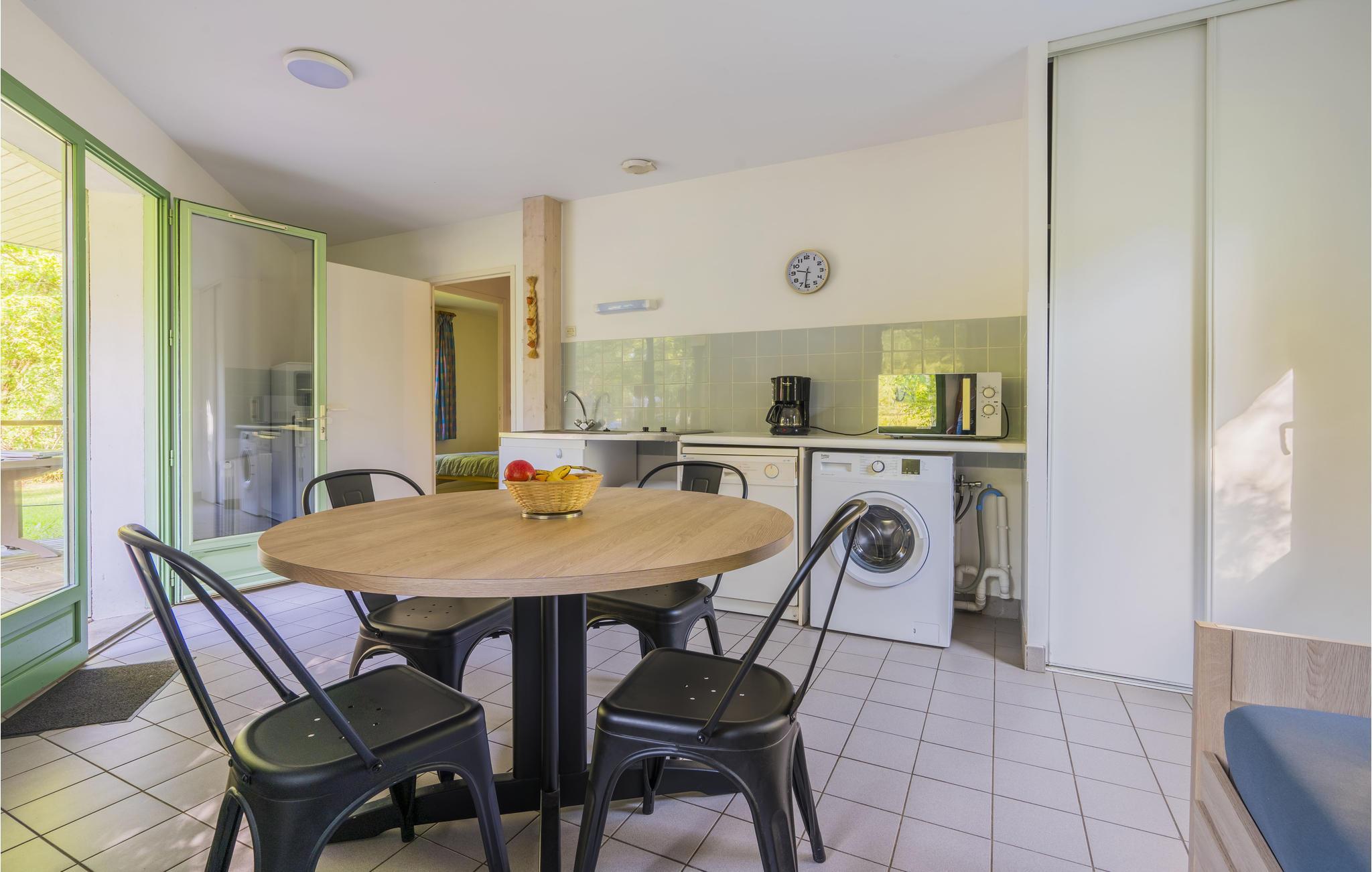 Nyd jeres ophold i en velholdt bungalowpark, der tilbyder rolige omgivelser til en afslappende ferie. Find jer til rette i jeres funktionelle bolig. Udnyt den kombinerede opholds- og spisestue, hvor I kan sidde sammen ved det runde bord. Tilbered jeres måltider i det åbne tekøkken og nyd det naturlige lys fra de store vinduer og døre.