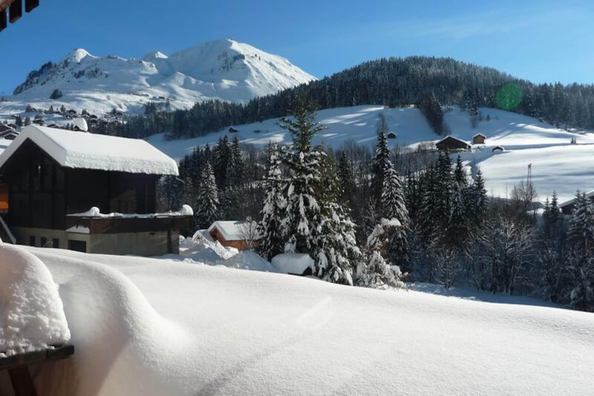 Omgivet af de majestætiske tinder i de franske alper tilbyder denne charmerende lejlighed i stueetagen i et traditionelt chalet et idyllisk tilflugtssted for op til ni gæster. Med sin rummelige planløsning på 87 m² og betagende udsigt over bjergene fra terrassen er det den perfekte ramme for at skabe uforglemmelige minder med familie eller venner. Uanset om du søger eventyr på pisterne eller en fredelig alpin flugt, tilbyder denne ejendom en indbydende base for alle årstider. \n\nIndvendigt er lejligheden omhyggeligt udstyret for at sikre et behageligt ophold. Den åbne stue indbyder til afslapning efter en dag med udforskning, mens køkkenet er klar til fælles måltider og hyggelige aftener derhjemme. Planløsningen er ideel til større grupper med masser af plads til, at alle kan slappe af. Kæledyr er velkomne, så du kan tage din lodne ledsager med på eventyret. Praktiske faciliteter såsom udendørs parkering og mulighed for at leje sengelinned og håndklæder gør dit ophold problemfrit. \n\nLejligheden ligger kun 1,5 km fra det charmerende centrum af Chainaillon Le Grand-Bornand og er perfekt placeret til at nyde det bedste af regionen. Skipisterne ligger blot 800 meter væk, og der er en gratis shuttlebusstation kun 50 meter fra din dør, hvilket sikrer nem adgang til områdets attraktioner. Om sommeren tilbyder de omkringliggende stier og den smukke natur uendelige muligheder for vandreture, cykling og at nyde den fredfyldte alpine atmosfære. \n\nUanset om du er tiltrukket af spændingen ved vintersport eller sommerens ro i bjergene, er denne dejlige chaletlejlighed din port til de franske alpers vidundere. Book dit ophold og oplev magien ved denne fortryllende destination.