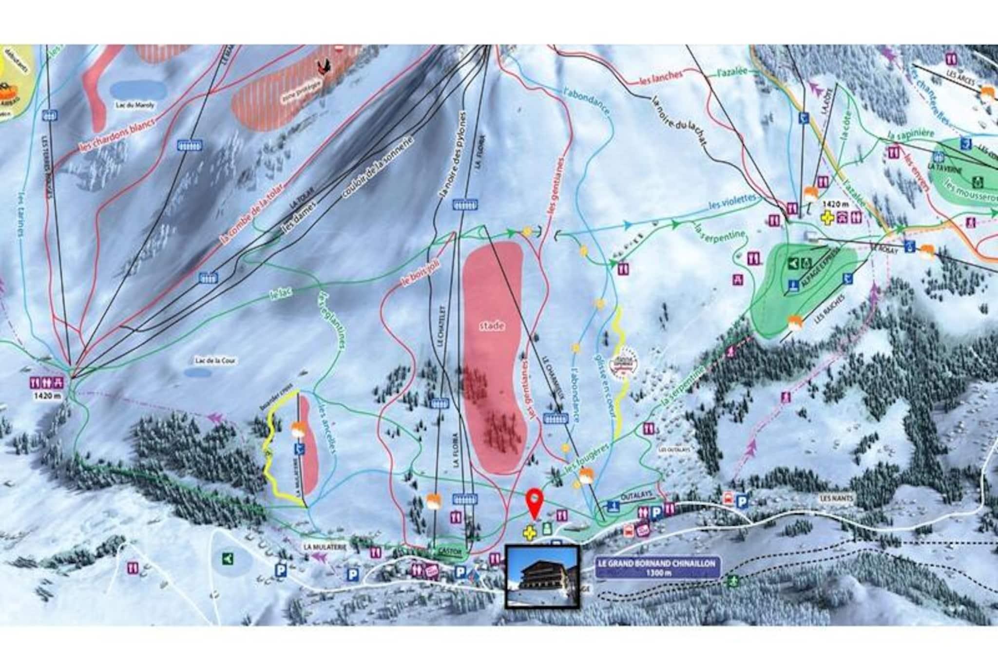 Højt over den charmerende landsby Le Grand-Bornand tilbyder denne treværelses duplexlejlighed et varmt og indbydende tilflugtssted for bjergentusiaster. Med sin misundelsesværdige ski-in/ski-out-beliggenhed ved foden af ??pisterne og kun få skridt fra ESF-skiskolen og Le Charmieux-stoleliften, er det den perfekte base for både erfarne skiløbere og familier, der søger alpine eventyr. Fra den vestvendte balkon kan du nyde panoramaudsigten over den historiske landsby nedenfor, hvor charmen ved traditionel savoyard-arkitektur møder de omkringliggende tinders majestæt. \n\nIndenfor er lejligheden på 55 m² og har komfortabel plads til op til otte gæster. Stuen, komplet med en dekorativ pejs og en hyggelig sovesofa, er et indbydende sted at slappe af efter en dag på pisterne. Køkkenet er fuldt udstyret til at tilberede solide måltider, mens soveafdelingen ovenpå omfatter et dobbeltværelse med egen balkon og et andet soveværelse med to køjesenge, perfekt til familier eller vennegrupper. Et moderne badeværelse og to separate toiletter bidrager til bekvemmeligheden i dette gennemtænkt designede rum. \n\nUd over lejligheden tilbyder Le Grand-Bornand et væld af aktiviteter året rundt. Om vinteren lokker pisterne med uberørt sne og varieret terræn, mens sommeren forvandler regionen til et paradis for vandrere og cyklister. Den nærliggende landsby er et centrum for aktivitet med lokale markeder, hyggelige restauranter og kulturelle begivenheder, der fejrer regionens rige kulturarv. For dem, der søger en dagstur, ligger Annecys glitrende sø kun 32 km væk, og Genève Lufthavn er inden for rækkevidde.\n\nUanset om du er her for spændingen ved skiløb, roen på bjergstier eller charmen ved en traditionel alpelandsby, lover denne lejlighed et uforglemmeligt ophold i hjertet af de franske alper.