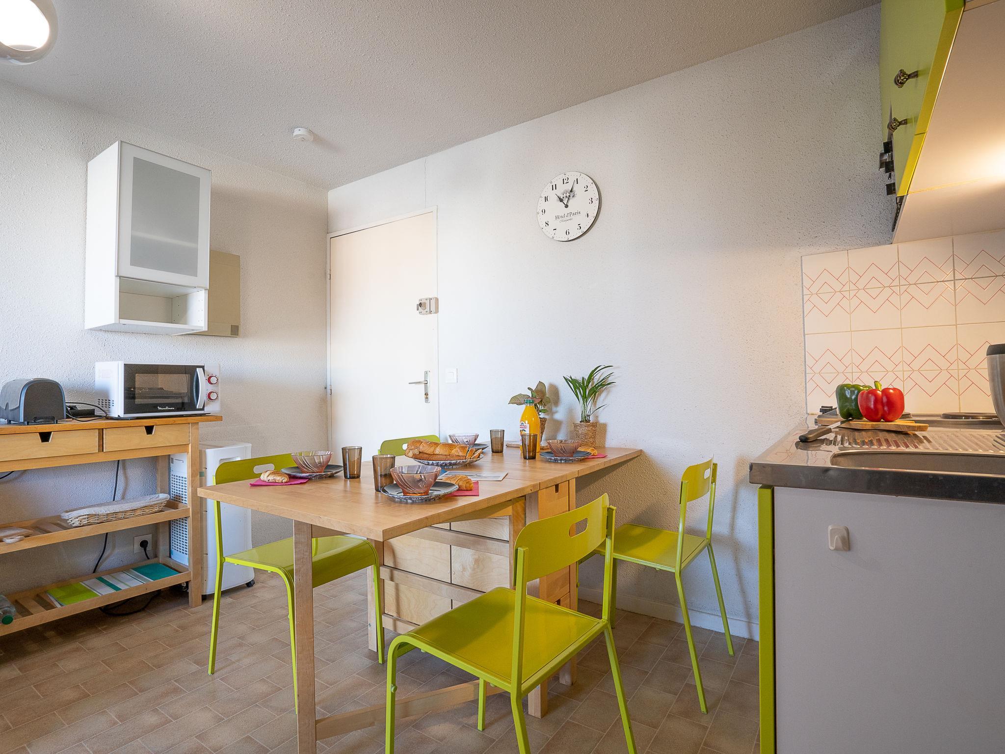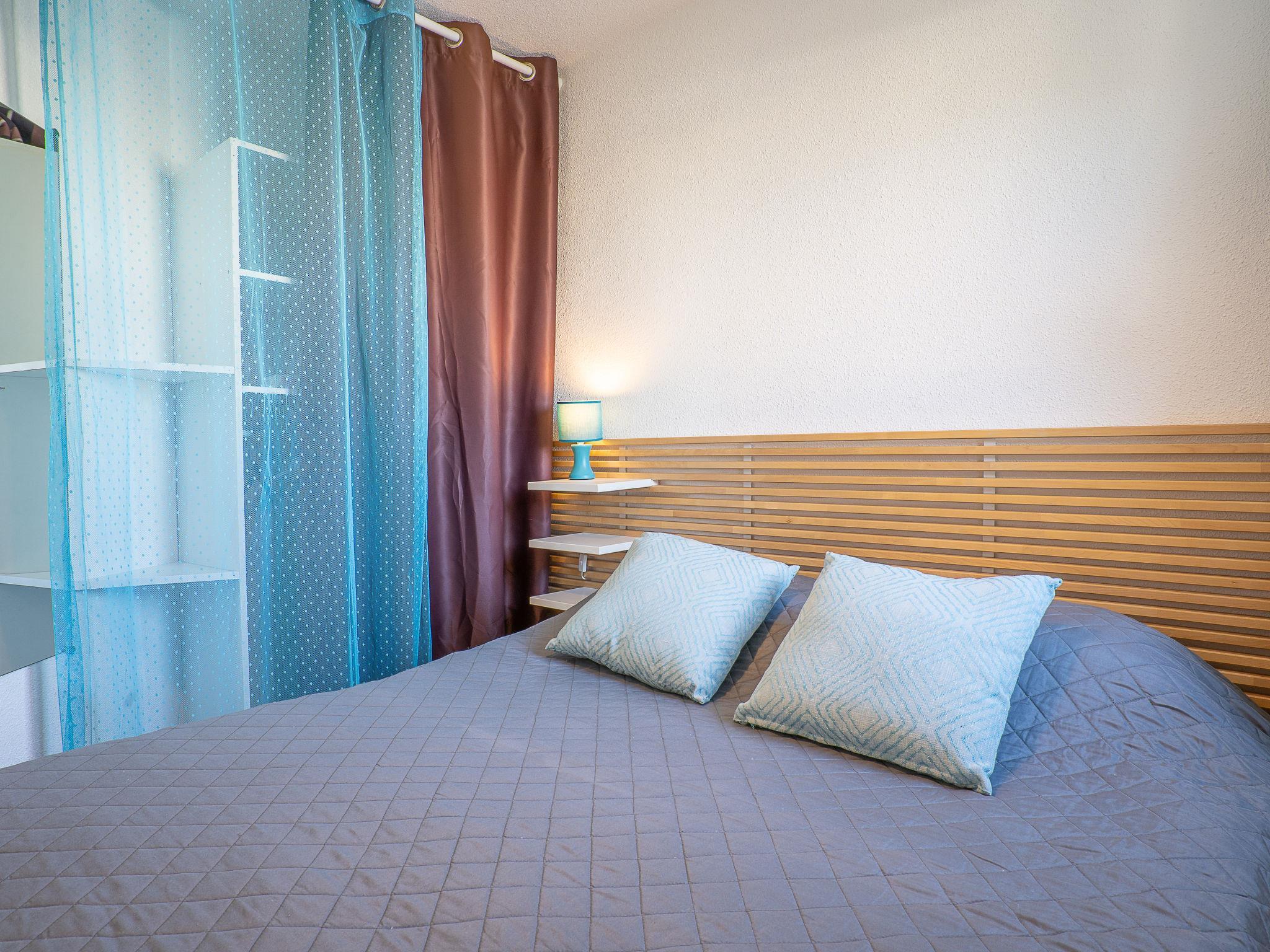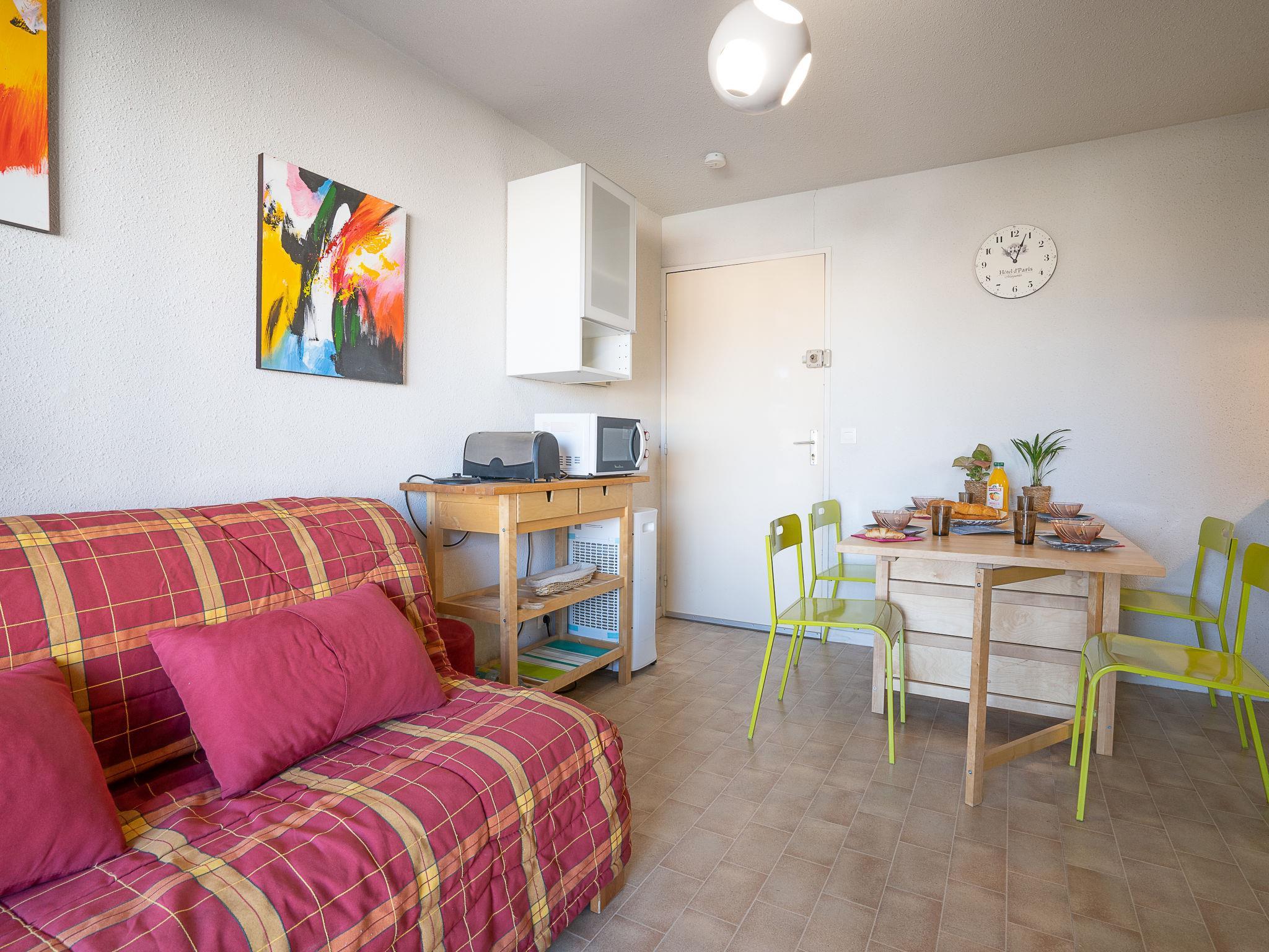 2-room apartment 22 m2 on 2nd floor. Living/dining room with 1 double sofabed (140 cm, length 190 cm), TV (flat screen). Exit to the terrace. 1 small room with 1 french bed (140 cm, length 190 cm). Kitchenette (2 hot plates, mini-oven). Shower/WC. Terrace 9 m2, north-west facing position. Terrace furniture. View of the swimming pool. Facilities: Internet (WiFi, extra). Please note: maximum 1 pet/ dog allowed. Smoke alarm.