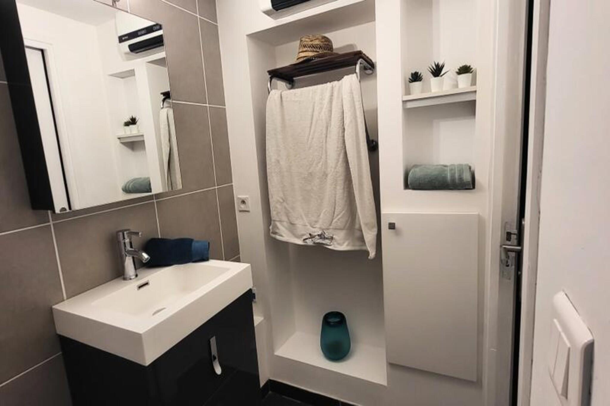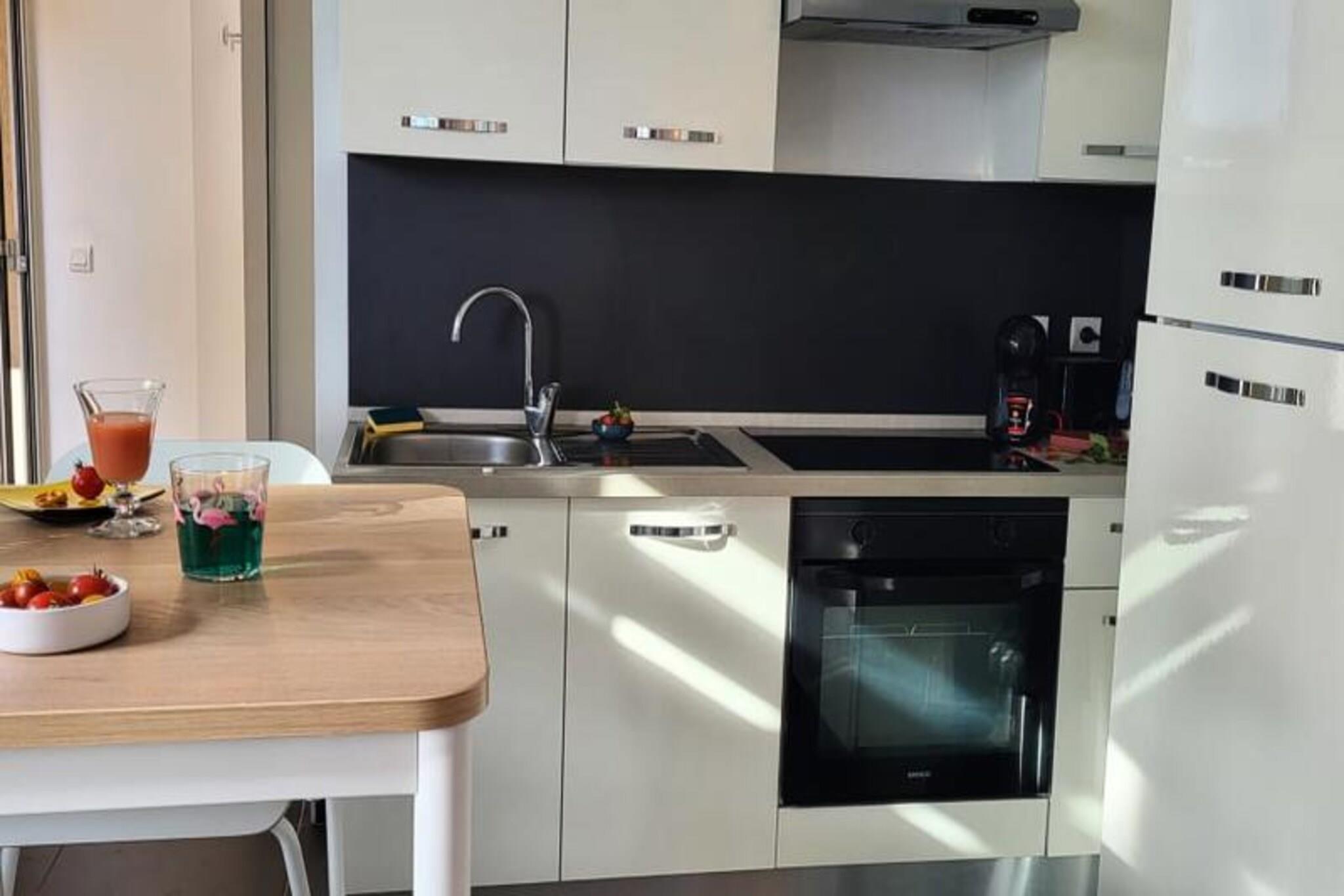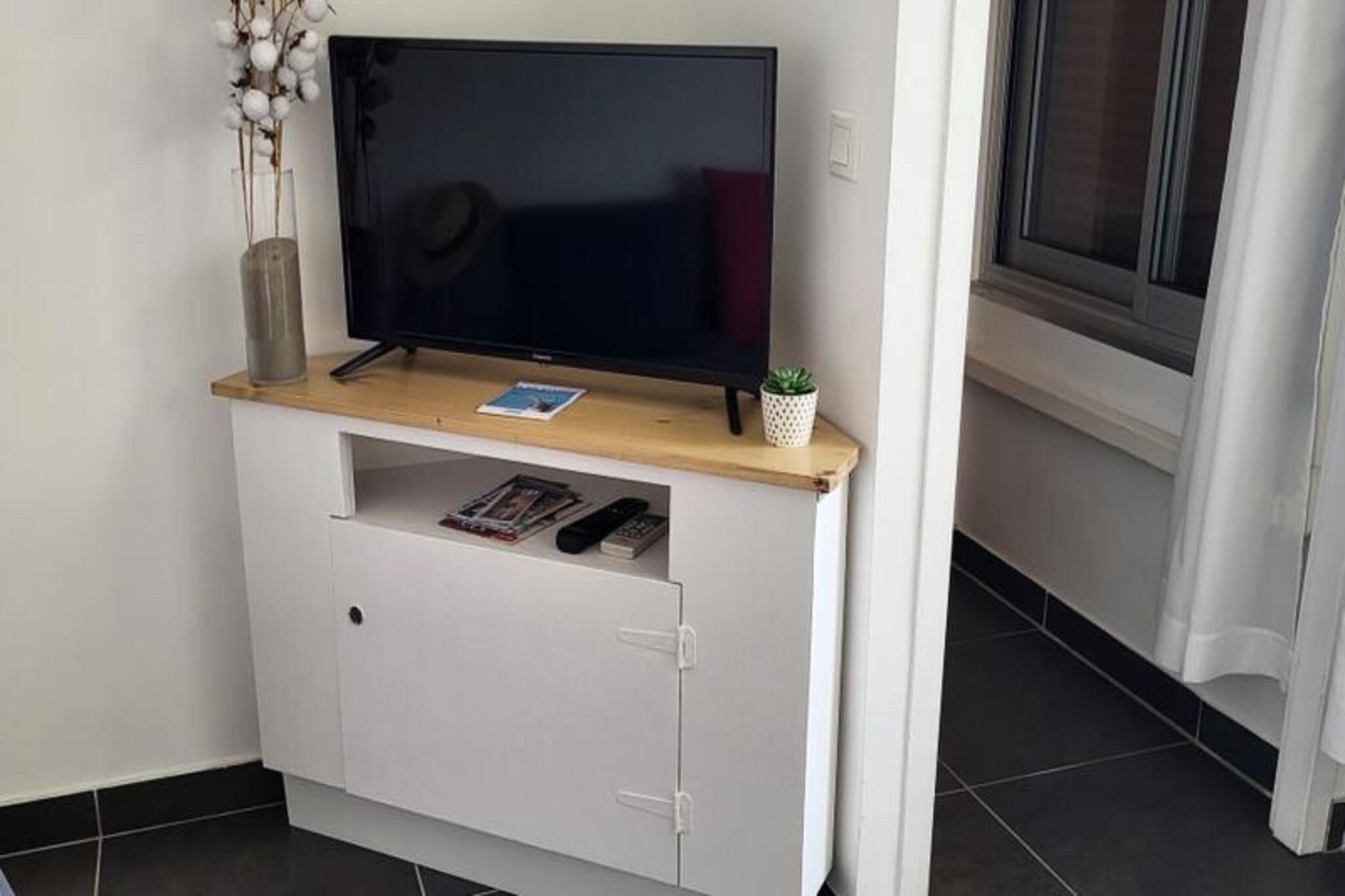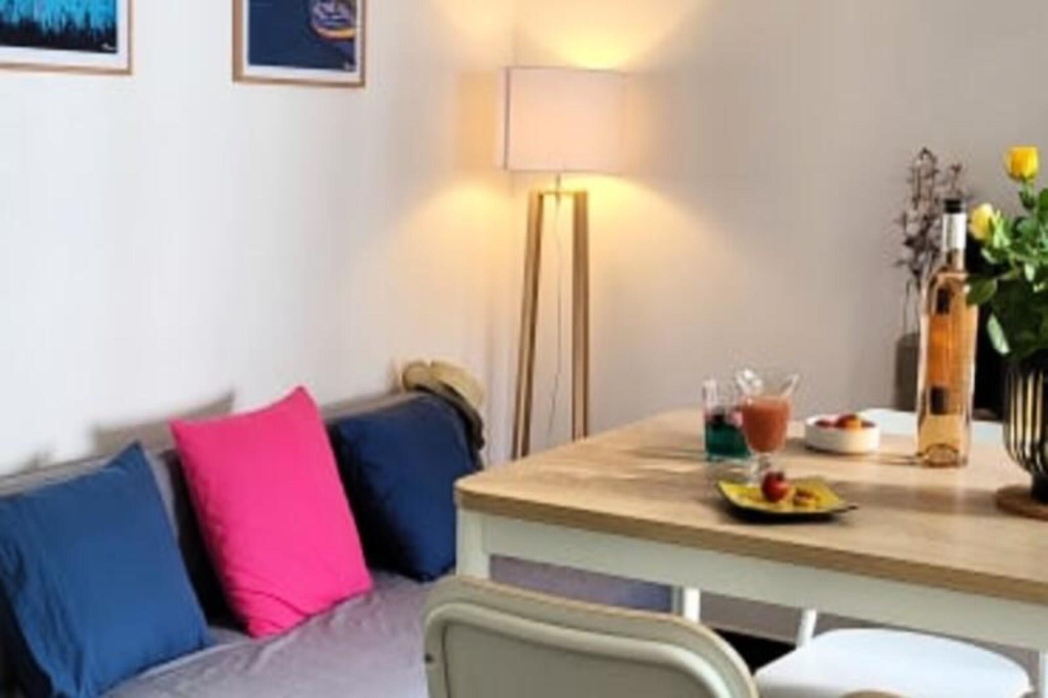 Denne charmerende lejlighed, beliggende på første sal i en bolig med en fælles swimmingpool, tilbyder et afslappende oase for op til 2 gæster. Det har et soveværelse med en 140 cm seng, en hyggelig stue med en sovesofa og et fuldt udstyret køkken. Kæledyr er velkomne efter anmodning for yderligere EURO30. Ejendommen inkluderer privat parkering i boligen og et ikke-debiteret forudregistreret depositum på EURO400 med et registreringsgebyr på EURO7,94. Lejligheden er perfekt beliggende kun 15 minutter til fods fra North Beach i Port Camargue og 10 minutter fra lokale butikker. Nærliggende attraktioner omfatter fiskerihavnen, hvor besøgende kan se trawlerne vende tilbage, og den første marina i Europa, hjemsted for UCPA-sejlerskolen. Oplev smukke solnedgange langs North Beach-promenaden og nyd lyserøde flamingoers flugt i Camargue. Lokale markeder afholdes to gange om ugen, kun 10 minutters gang væk. Indvendigt har opholdsstuen i åbent plan store karnapper med udsigt over haven og stranden. Køkkenet er udstyret med en glaskeramisk kogeplade, mikroovn, køleskab og en Dolce Gusto-kaffemaskine. Bruserummet inkluderer jetbrusere, et vaskeskab med skuffer og et separat toilet. Sengelinned og håndklæder er tilgængelige for EURO20 per to personer.