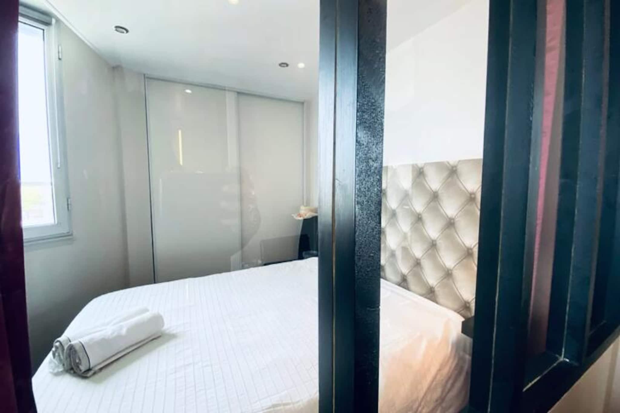 Denne charmerende lejlighed med et soveværelse i Grau-du-Roi, der ligger på øverste etage i en moderne kystresidens, tilbyder en rolig oase med betagende havudsigt. Den nordvestvendte terrasse er perfekt til at nyde solnedgange over Aigues-Mortes og La Grande-Motte-bugten, hvilket skaber uforglemmelige øjeblikke af ro. Ejendommen ligger i et fredeligt, men centralt område og tilbyder direkte adgang til stranden gennem haven, hvilket sikrer den ultimative bekvemmelighed til afslapning ved havet. Uanset om du slentrer til nærliggende butikker, markeder eller tapasbarer, er alt hvad du behøver kun en kort gåtur væk. \n\nIndenfor kan lejligheden prale af en lys og moderne opholdsstue designet til komfort. Den faste 160 cm sengetøj sikrer afslappende nætter, mens det åbne køkken er fuldt udstyret med fornødenheder som vaskemaskine, kaffemaskine, brødrister og ovn. Reversibel aircondition øger komforten, hvilket gør dette tilflugtssted ideelt året rundt. Badeværelset har et elegant brusebad og toilet, og gæsterne bydes velkommen med et sengetøjssæt og basale faciliteter for et problemfrit ophold. \n\nResidensen Château Leenhardt tilbyder privat parkering og elevatoradgang, hvilket gør den velegnet til par eller små familier, der søger en bekvem og stilfuld base. Nærliggende attraktioner omfatter cykelstier til Salins d'Aigues-Mortes, vandsport og udflugter til Camargue. For dem, der søger eventyr, ligger strandene Espiguette og Port-Camargue, Luna Park og thalassoterapicentre kun få minutter væk. \n\nMed nem adgang til Montpellier, Nîmes og Arles er denne lejlighed den perfekte port til at udforske det sydlige Frankrigs skønhed. Uanset om du er her for det pulserende landsbyliv eller den fredfyldte kystcharme, lover denne ejendom et mindeværdigt ophold.