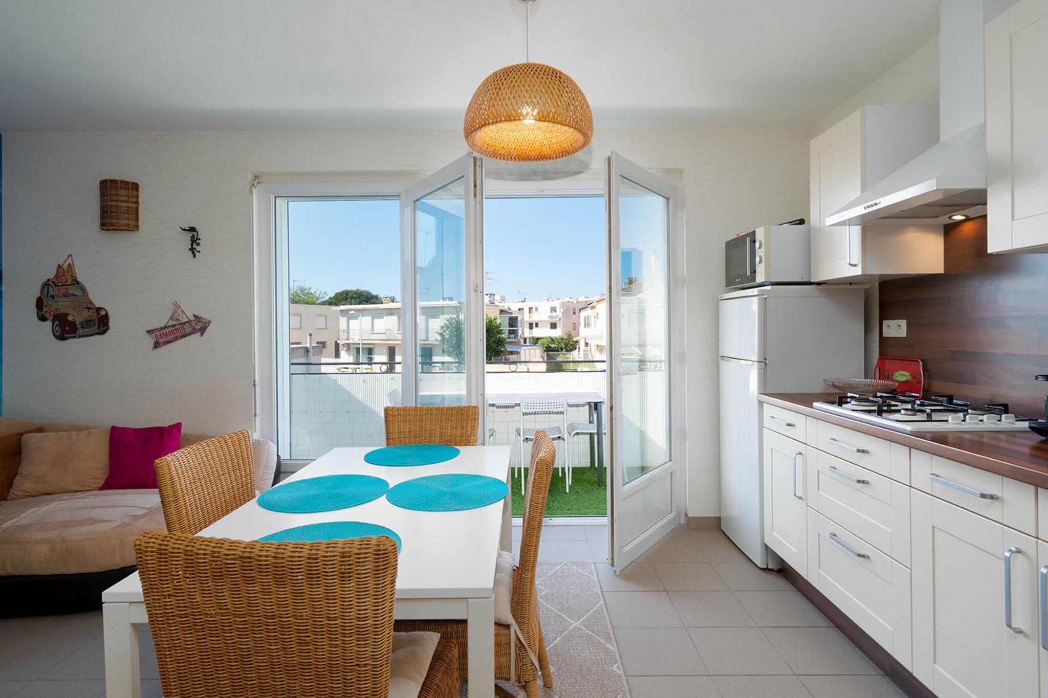 Velkommen til dit solrige gemmested i Grau du Roi. Denne hyggelige lejlighed på 47 kvadratmeter, der ligger på første sal i den charmerende Les Magnarelles-residens, er det perfekte sted til en afslappet ferie ved havet. Uanset om du rejser som par, med familie eller en gruppe venner, kan denne lejlighed komfortabelt rumme op til fire gæster i et indbydende og solrigt rum. Træd ud på balkonen for at nyde din morgenkaffe eller aftenaperitif, mens du har udsigt over haven og den stille gade. Indenfor har lejligheden et fuldt udstyret køkken med alt, hvad du behøver for at tilberede måltider derhjemme, fra køleskab og fryser til mikrobølgeovn, brødrister og Nespresso-kaffemaskine. Det største soveværelse har en komfortabel dobbeltseng, mens det andet soveværelse er ideelt til børn eller venner med to køjesenge og en sovesofa for ekstra fleksibilitet. Et funktionelt badeværelse med bruser og separat toilet gør dit ophold mere bekvemt. Dyner, puder og tæpper er inkluderet, så du kan pakke let og fokusere på at nyde din tur. Beliggende kun 500 meter fra stranden og bymidten, er du perfekt placeret til en dag ved havet, besøge de lokale markeder eller spise på restauranter ved havet. Gratis privat parkering er inkluderet, og de fredelige omgivelser betyder, at du er tæt på alt, mens du stadig nyder rolige aftener. Uanset om du er her for at udforske Camargue, slappe af ved vandet eller blot nyde charmen ved Grau du Roi, er denne lejlighed en vidunderlig base for din middelhavsferie.