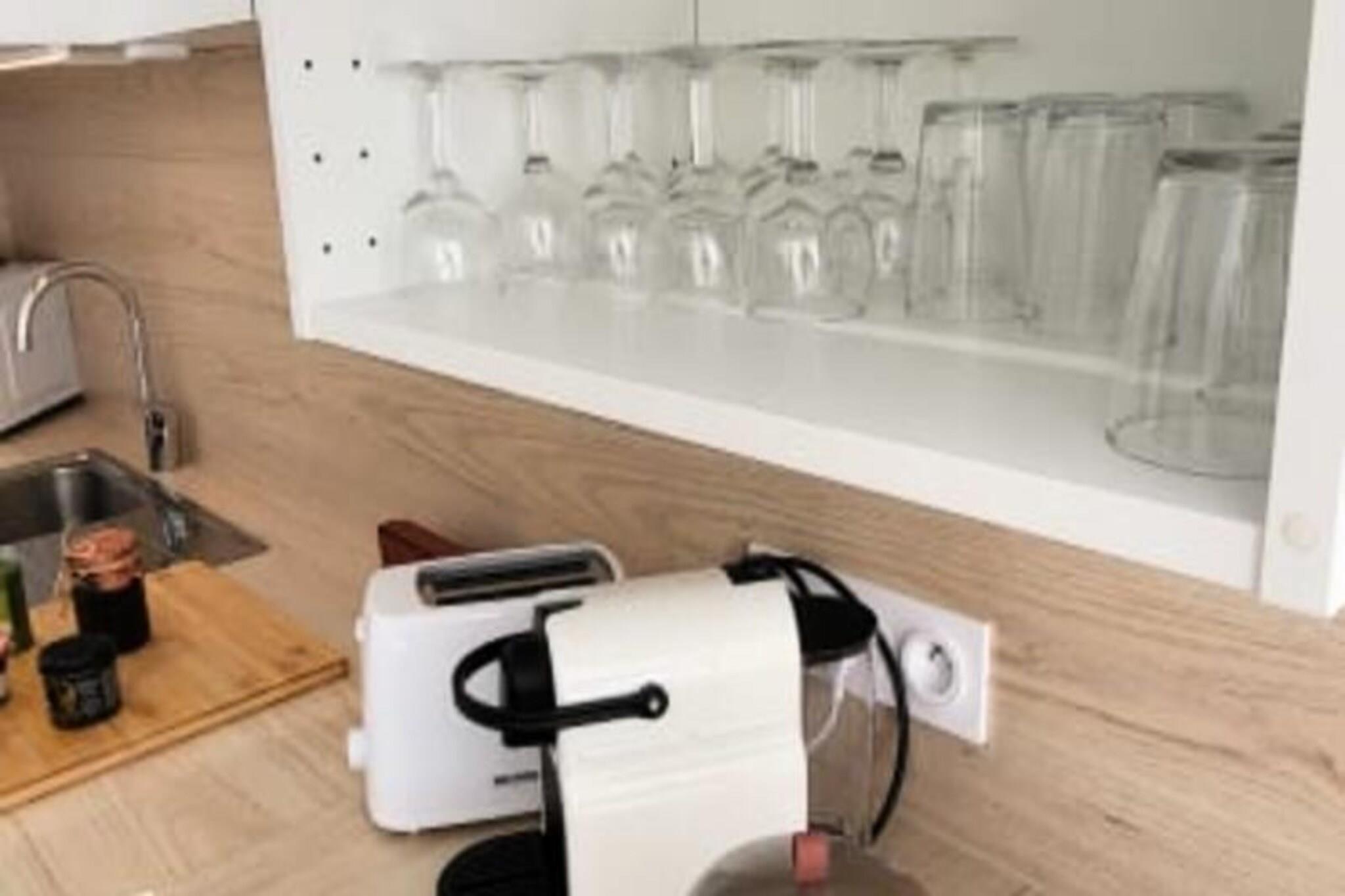 Hvor middelhavsbrisen møder charmen ved Port Camargue, tilbyder denne dejlige lejlighed i stueetagen et idyllisk tilflugtssted for to. Forestil dig at vågne op til den blide lyd af både, der svajer i marinaen, og træde ud på din private terrasse for at nyde en morgenkaffe med udsigt over frodige haver og det glitrende vand. Denne ejendom ligger kun 150 meter fra Nordstranden og er perfekt placeret til en rolig ferie ved havet, med de pulserende restauranter ved kajen og det sæsonbestemte lokale marked kun få skridt væk. Den maleriske bymidte i Le Grau-du-Roi ligger en afslappet 15-minutters gåtur derfra og inviterer dig til at udforske de hyggelige gader og den autentiske kystatmosfære. Indenfor er den airconditionerede lejlighed omhyggeligt designet til komfort og bekvemmelighed. Stuen åbner ud til terrassen, hvilket skaber en problemfri forbindelse mellem inde og ude, perfekt til spisning under åben himmel eller blot til at slappe af efter en dag med eventyr. Det fuldt udstyrede køkken med induktionskogeplader, Nespresso-maskine og opvaskemaskine gør madlavning til en leg, uanset om du nyder frisk lokal fisk og skaldyr eller et glas Vin des Sables. Det hyggelige soveværelse har en komfortabel 130 cm seng og blødt sengetøj, der sikrer afslappende nætter ved havet. Træd udenfor og oplev det bedste, Port Camargue har at byde på. Fra sandstrandene ved Nordstranden til den travle marina fyldt med yachter og sejlbåde, tilbyder hvert hjørne noget unikt. Se fiskere arbejde langs Quai Colbert, eller nyd den livlige atmosfære i havnefogedens kontordistrikt. For naturelskere er flamingoerne i Camargue og de fantastiske solnedgange over La Grande Motte-bugten uforglemmelige seværdigheder. Uanset om du er her for at slappe af, udforske eller forkæle dig selv med regionens kulinariske lækkerier, er denne lejlighed din port til Middelhavskystens skønhed og ro.