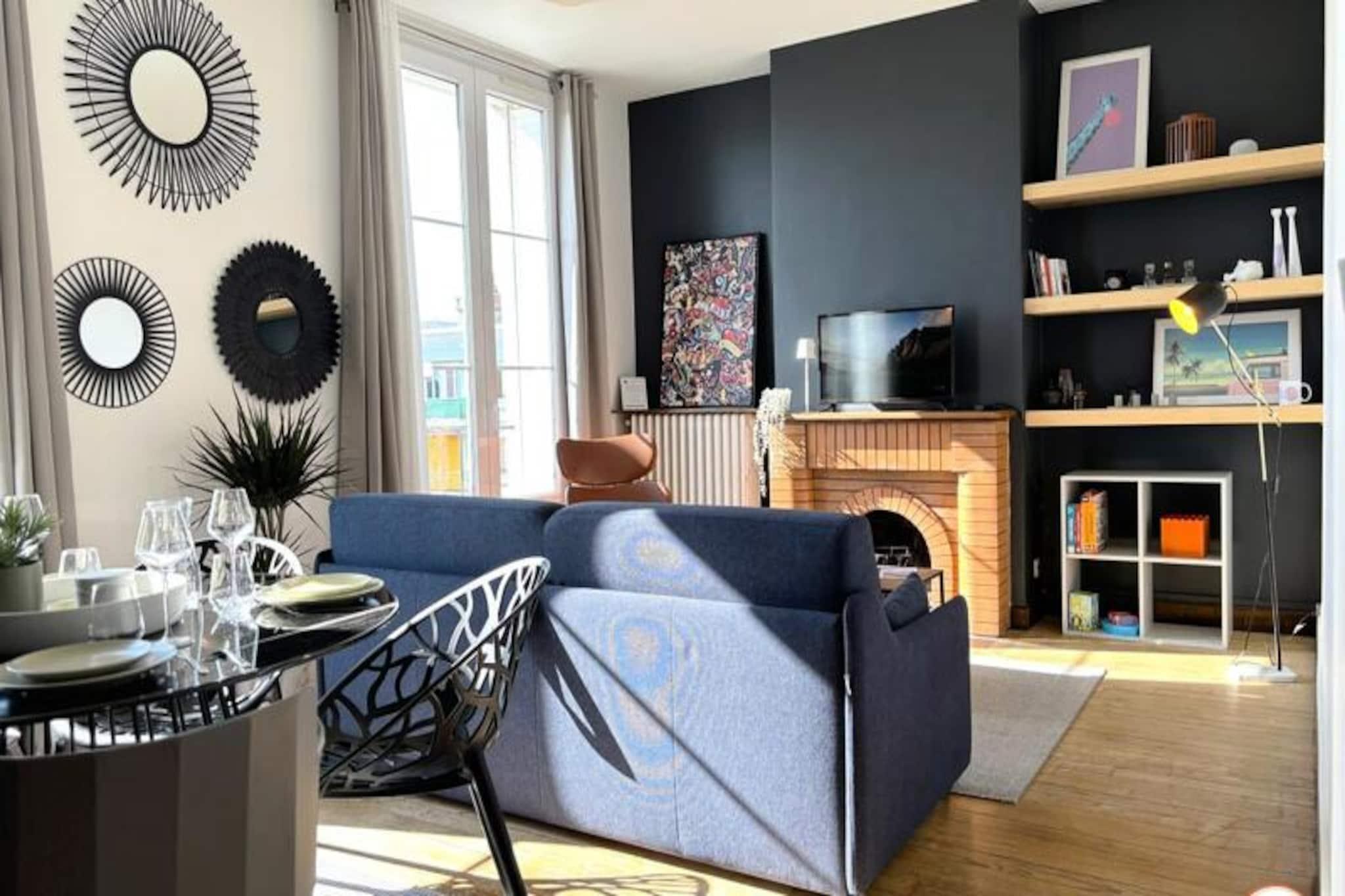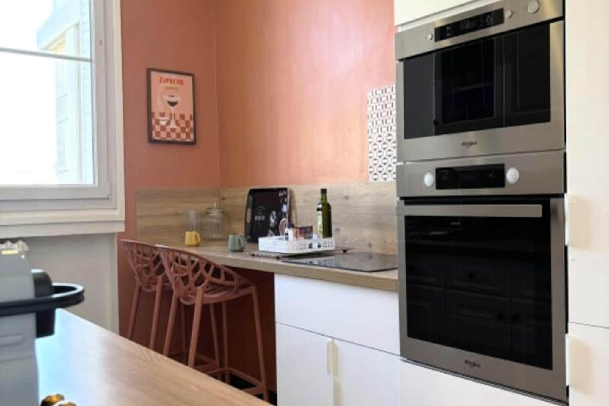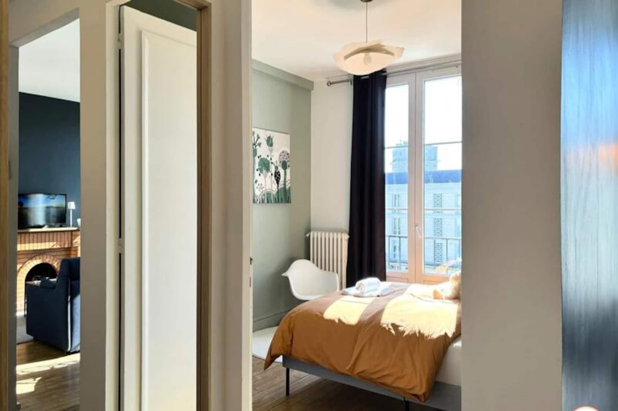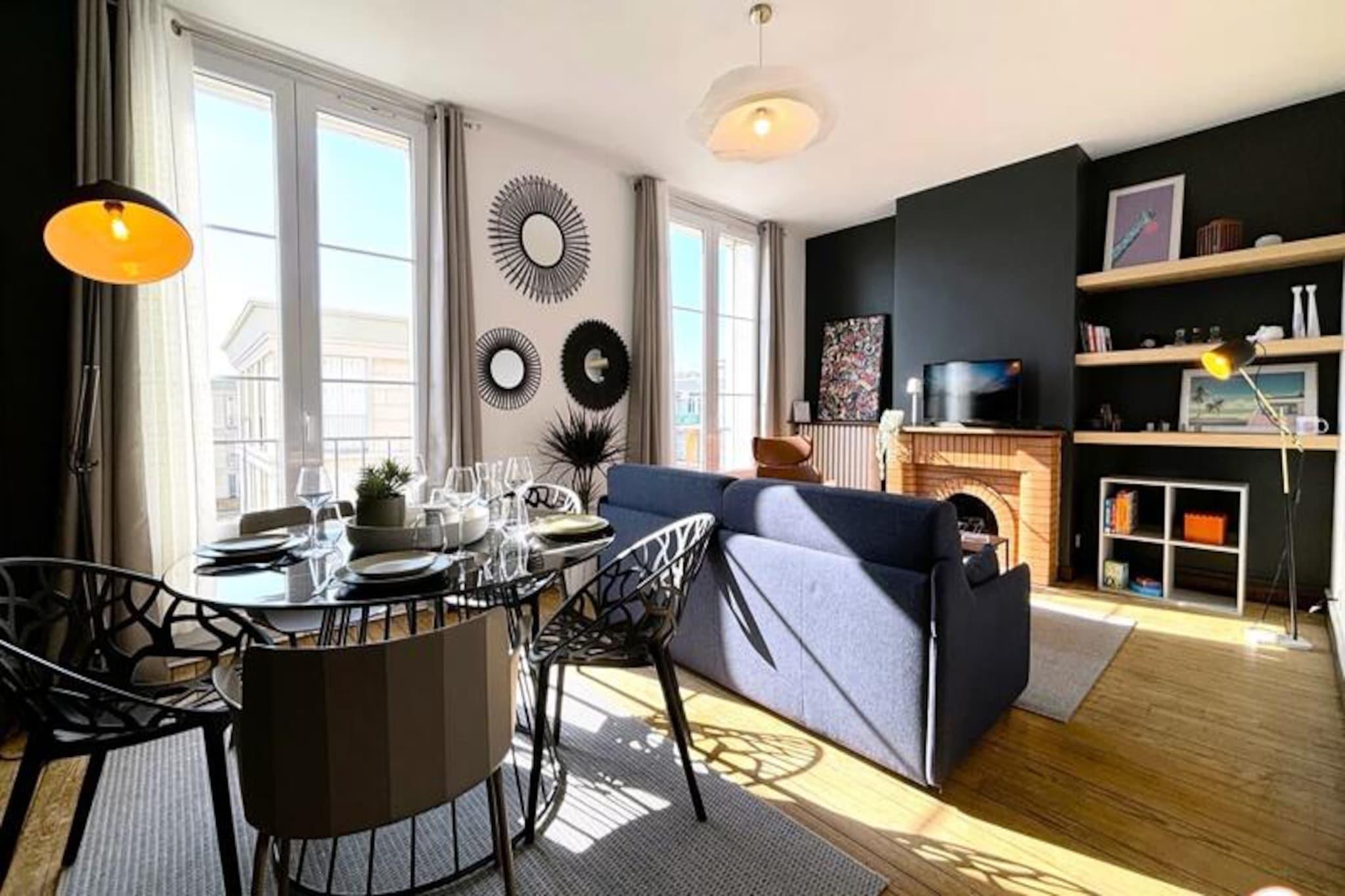 Denne charmerende lejlighed, beliggende på 4. sal i en rolig bolig i Le Havre, kan komfortabelt rumme op til 4 gæster. Det tilbyder et soveværelse med en queen-size seng (160x200 cm) og et opholdsområde med en sovesofa (140x200 cm), der forvandler sig til en soveplads for yderligere gæster. Lejligheden er ikke kæledyrsvenlig. Det er udstyret med et smart-tv, der giver underholdning og et badeværelse med badekar. Lejlighedens centrale beliggenhed placerer dig kun 200 meter fra strand og rådhus. Den UNESCO World Heritage-listede arkitektur i Le Havre omgiver dig, og det berømte naturhistoriske museum er kun en kort gåtur væk. Gæsterne kan udforske nærliggende madbutikker, caféer og det pulserende Les Halles-marked, perfekt til en afslappet dag ude. Ejendommen er veludstyret med et fuldt møbleret køkken med køleskab, ovn/mikroovn, Nespresso-kaffemaskine og vaskemaskine. Stuen og spisepladsen er perfekte til at slappe af efter en dag med udforskning. Der er gratis parkering til elbiler, og offentlige transportmuligheder såsom sporvogne og busser er inden for rækkevidde.