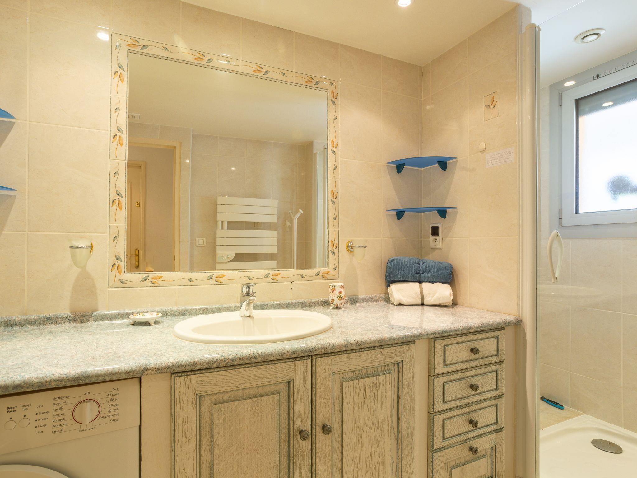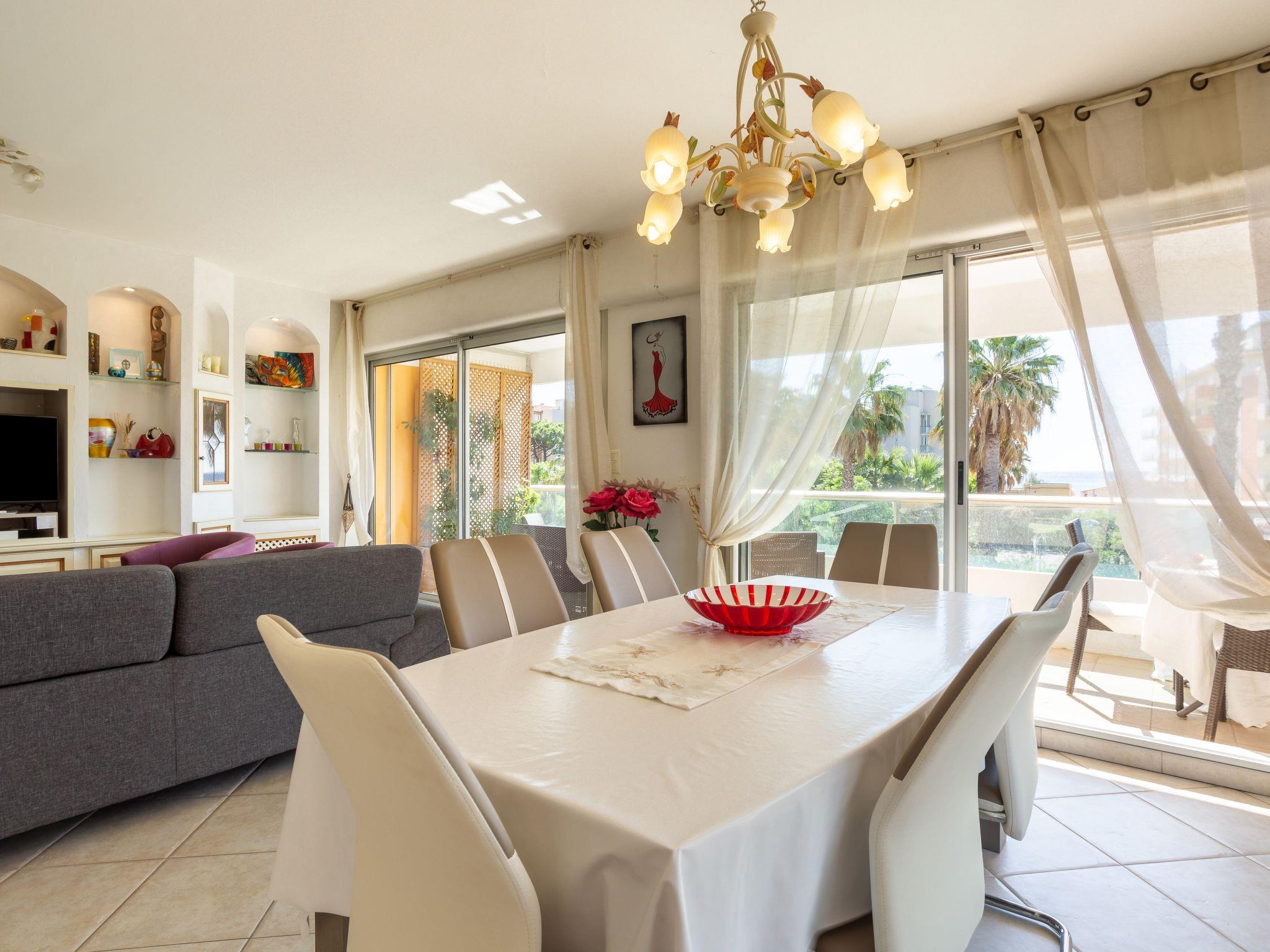 2-room apartment 70 m2 on 1st floor. Spacious and bright, beautiful and tasteful furnishings: large living/dining room with panoramic window east facing position and south facing position with 1 double fold-away bed (140 cm, length 190 cm), dining table and satellite TV (flat screen), air conditioning and electric shutters. Exit to the terrace. 1 room with panoramic window west facing position with 1 x 2 bunk beds (100 cm, length 190 cm), 1 french bed (140 cm, length 190 cm), shower/WC, fan and electric shutters. Exit to the terrace. Open kitchen (oven, dishwasher, 4 ceramic glass hob hotplates, toaster, kettle, microwave, freezer, electric coffee machine, Capsules for coffee machine (Senseo) extra). Shower, sep. WC. Electric heating. Large terrace 50 m2, east facing position and south facing position. Terrace furniture, electric barbecue. View of the sea. Facilities: washing machine, iron, hair dryer. Internet (WiFi, free). Parking space n 17. E-charging station. Please note: suitable for families. Non-smokers only. TV only FR, EN, DE. Smoke alarm. Complete Canalsat TV with English and German channels Availability of a garage for 2 wheels and beach equipment with compressor. Offer by a private individual according to Art. 155, IV of CGI. 830700016513F
