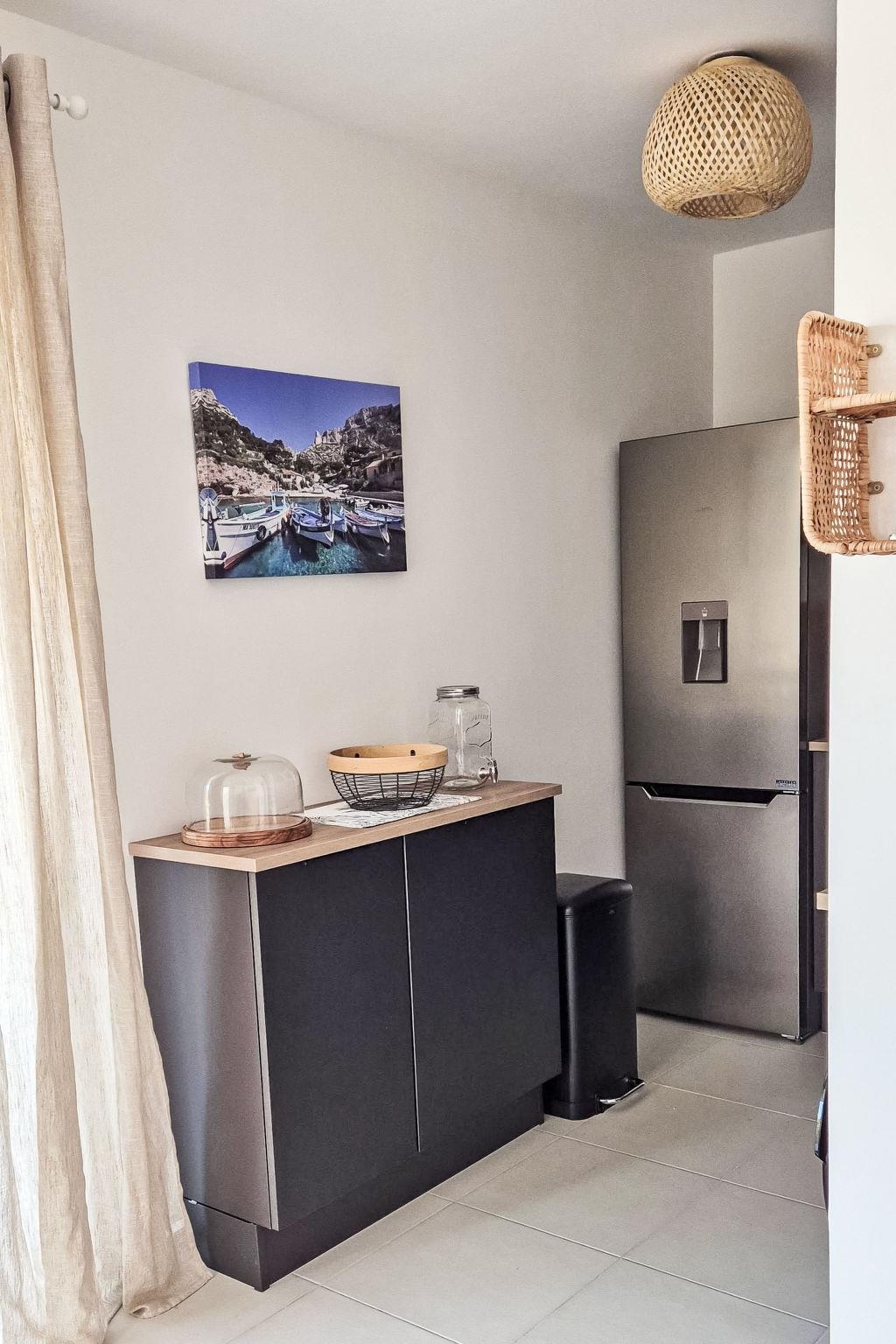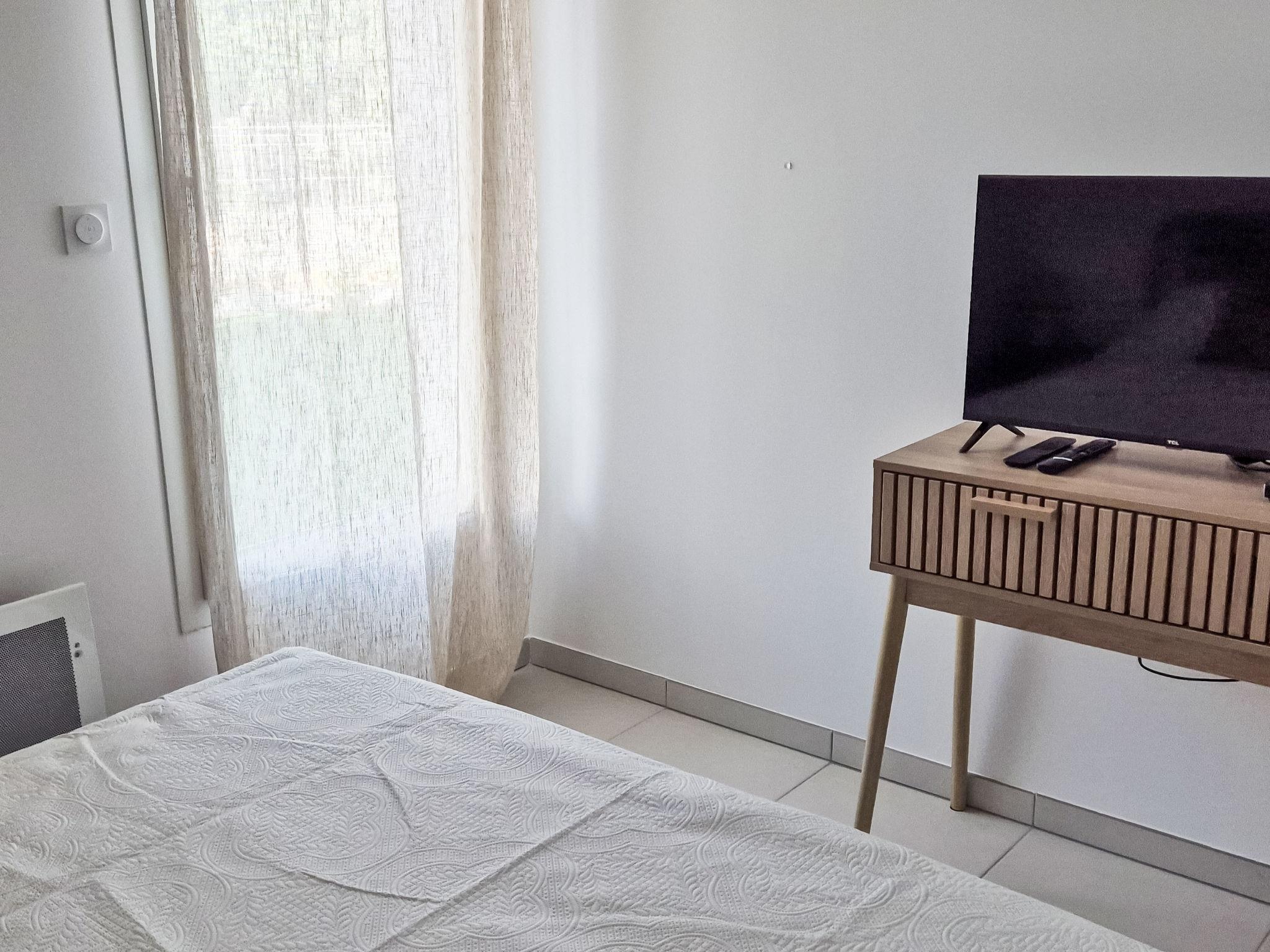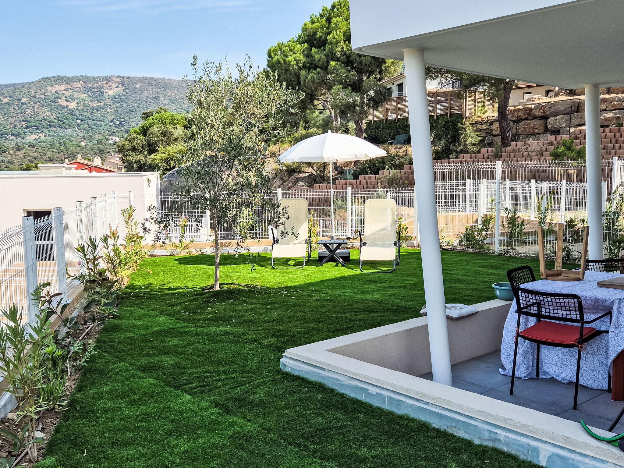 2-room apartment 41 m2 on 1st floor. Comfortable and tasteful furnishings: living/dining room with 1 sofabed (140 cm, length 190 cm), air conditioning. 1 room with 1 french bed (160 cm, length 200 cm), TV (flat screen). Kitchenette (dishwasher, 2 induction hot plates, toaster, kettle, electric coffee machine, Capsules for coffee machine (Nespresso) extra, combination microwave). Shower/WC. Electric heating. Terrace 12 m2, south-west facing position, garden 75 m2, south-west facing position. Terrace furniture. View of the resort. Facilities: washing machine, iron, hair dryer. Internet (WiFi, free). Parking space n 34 et 35 (2 cars). Please note: non-smokers only. TV only FR. Smoke alarm. Offer by a private individual according to Art. 155, IV of CGI. 83070003162HO