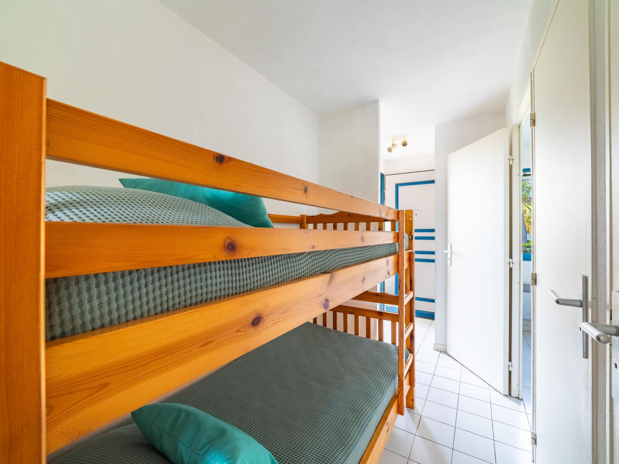 2-room apartment 35 m2 on 1st floor. Practical and beautiful furnishings: living/dining room with dining table and TV (flat screen), air conditioning. Exit to the balcony. Entrance hall with 1 x 2 bunk beds (90 cm, length 190 cm). 1 room with 1 french bed (140 cm, length 190 cm). Open kitchen (2 hot plates, toaster, kettle, microwave, electric coffee machine). Bathroom, sep. WC. Electric heating. Small balcony 10 m2. Balcony furniture. Facilities: washing machine, iron, hair dryer. Internet (WiFi, free). Parking space n 210. Please note: apartment street side. Maximum 1 pet/ dog allowed. TV only FR. Smoke alarm. 83070000775YQ