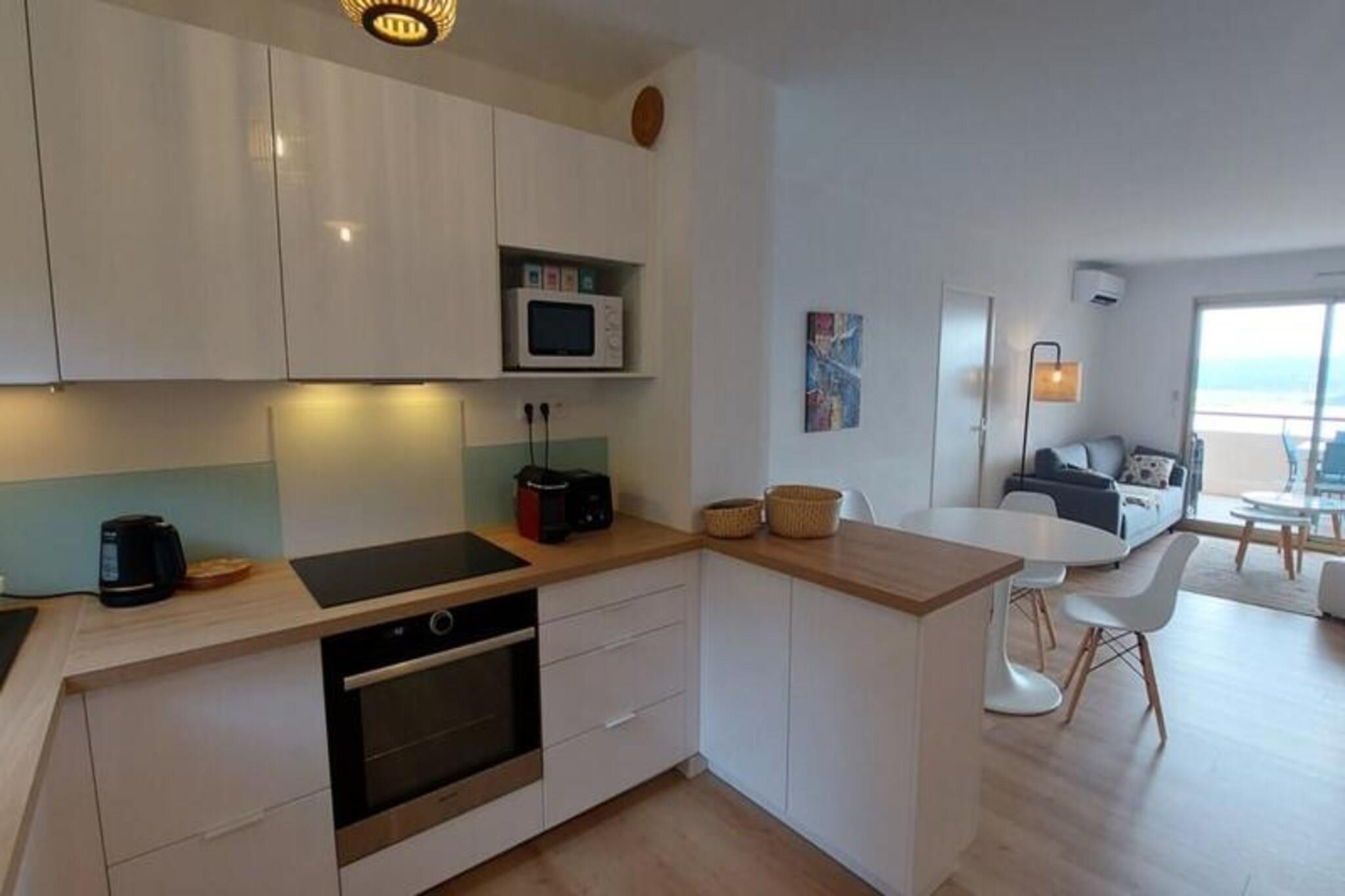 Højt over den charmerende kystby Le Lavandou tilbyder denne to-værelses lejlighed i Les Mandariniers-residensen en fredfyldt oase med en betagende udsigt over Middelhavet. Forestil dig at vågne op til solens glimt på vandet, nyde din morgenkaffe på terrassen og mærke den blide havbrise, mens du planlægger din dag i denne idylliske omgivelse på den franske riviera. Uanset om du søger afslapning eller eventyr, er denne ejendom det perfekte udgangspunkt. Lejligheden er omhyggeligt designet med henblik på komfort og bekvemmelighed. Den har to soveværelser, det ene med en luksuriøs kingsize-seng og det andet med to hyggelige enkeltsenge, hvilket gør den ideel til familier eller små grupper. Den fuldstændig renoverede stue og køkken er udstyret med moderne faciliteter, herunder køleskab, fryser, opvaskemaskine, ovn, mikroovn og Nespresso-kaffemaskine. Aircondition i soveværelset og stuen sikrer et køligt tilflugtssted efter en dag i solen. Terrassen med panoramaudsigt over havet er det perfekte sted at spise udendørs eller blot nyde Côte d'Azurs skønhed. Yderligere faciliteter omfatter vaskemaskine, privat parkeringsplads og en glitrende swimmingpool, der er åben fra juni til september. Beliggende kun 15 minutters gang fra stranden og tæt på det livlige centrum af Le Lavandou, har du nem adgang til lokale butikker, restauranter og markeder. Udforsk den uberørte kystlinje, tag en bådtur til Îles d'Or, eller slap af ved poolen. Sengelinned og håndklæder er inkluderet, så det eneste du skal medbringe er dit strandhåndklæde og en sans for eventyr. Denne 3-stjernede lejlighed, der er certificeret af Le Lavandou Turistkontor, lover et mindeværdigt ophold i en af Frankrigs mest maleriske kystbyer. Uanset om du er her for solen, havet eller charmen ved den franske riviera, er denne ejendom klar til at byde dig velkommen.