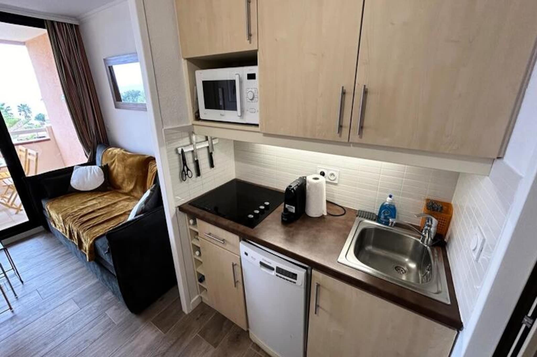 Med udsigt over Middelhavets azurblå vand tilbyder denne charmerende lejlighed med et soveværelse i 'L'Anse de Pramousquier'-residensen et roligt tilflugtssted for din strandferie. Beliggende i frodige, grønne omgivelser tilbyder denne ejendom en fredfyldt tilflugtssted fra de travle folkemængder, med den uberørte Pramousquier-strand kun en kort gåtur væk via hyggelige gangstier. Denne skjulte perle, kendt som 'Den Mystiske Strand', ligger beskyttet af Cap Nègre og tilbyder et fredeligt fristed til afslapning og udforskning. Lejligheden er omhyggeligt designet til komfort og bekvemmelighed og har aircondition i både stue og soveværelse for at holde dig kølig på varme sommerdage. Terrassen med havudsigt inviterer dig til at slappe af med en morgenkaffe eller et aftenglas vin, mens du nyder det betagende kystlandskab. Indenfor har stuen en komfortabel sofa, der kan laves om til to enkeltsenge, hvilket gør den ideel til familier eller små grupper. Yderligere faciliteter inkluderer en privat parkeringsplads og adgang til residensens rekreative faciliteter, såsom beachvolleybaner, bordtennisborde og en kravlegård til yngre gæster. Pramousquier Strand tilbyder et udvalg af dejlige restauranter ved stranden og muligheden for at leje liggestole eller vandcykler til en sjov dag på vandet. Ud over stranden er det omkringliggende område perfekt for naturelskere med muligheder for naturskønne vandreture og udforskning. Uanset om du rejser med familie, venner eller en særlig person, er denne lejlighed den perfekte base for en uforglemmelig ferie på den franske riviera. Book dit ophold og fordyb dig i skønheden og roen i dette skjulte kystparadis.