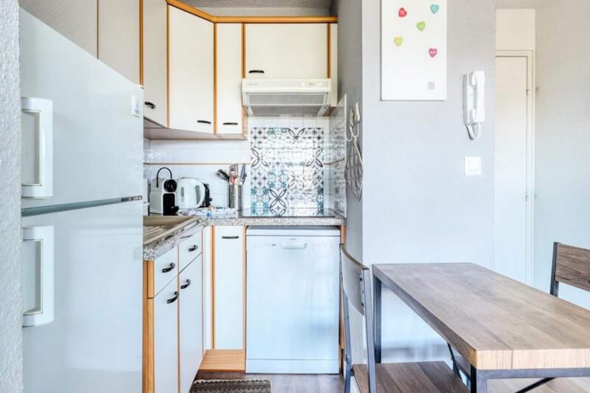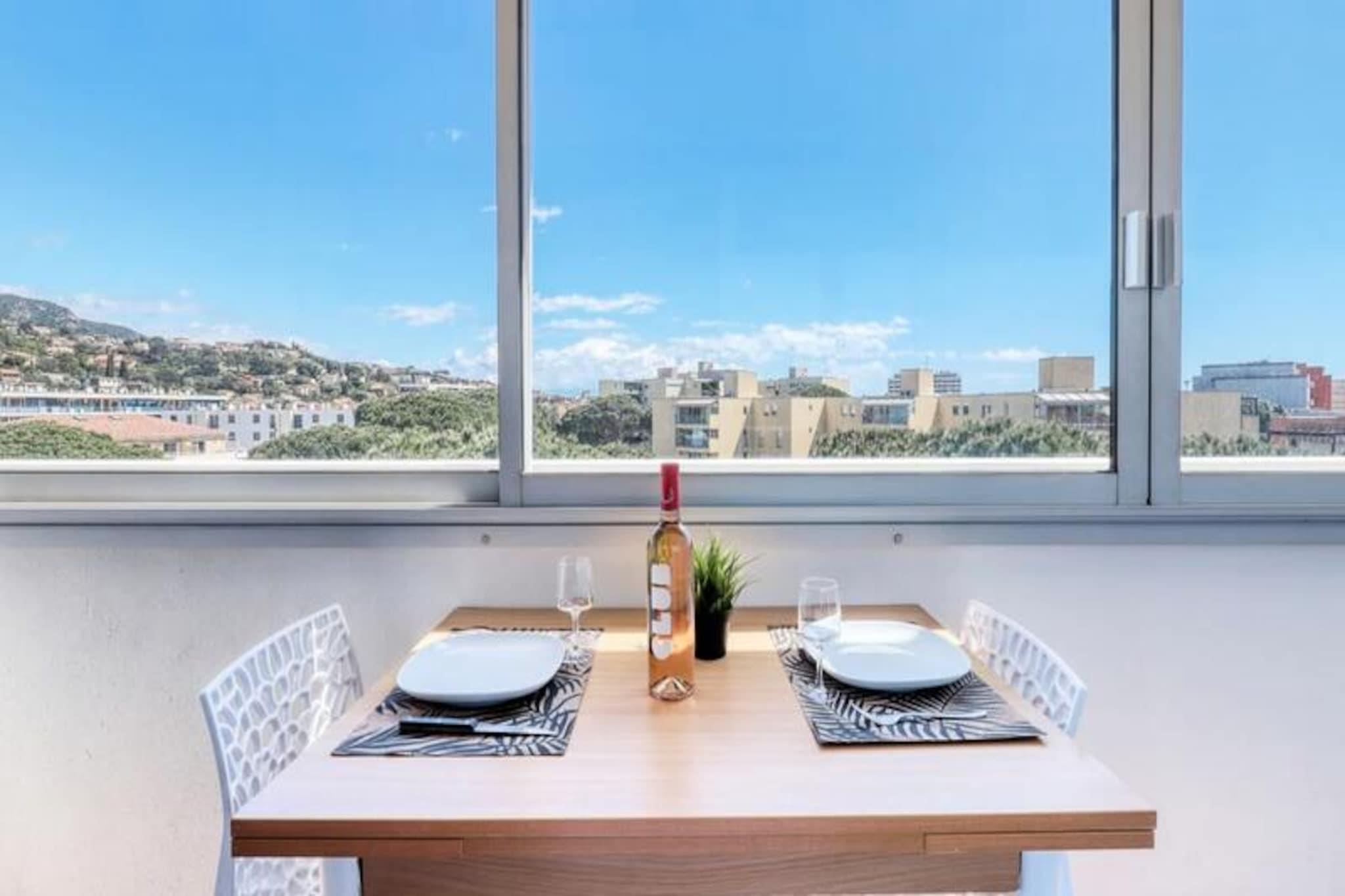 En mild havbrise og den gyldne glød fra middelhavssolen hilser dig velkommen i denne charmerende lejlighed i Le Lavandou. Beliggende kun 600 meter fra den centrale strand, tilbyder dette 36 m² store tilflugtssted en perfekt blanding af komfort og bekvemmelighed til din ferie. Uanset om du søger afslapning eller eventyr, sætter den pulserende kystatmosfære tonen for uforglemmelige øjeblikke. Fra udsigtspunktet på fjerde sal, der er tilgængeligt med elevator, kan du nyde den fredfyldte udsigt og en fredelig atmosfære. Den private loggia inviterer dig til at nyde måltider under åben himmel, mens du soler dig i solens varme. \n\nLejligheden er designet til at rumme op til fire gæster og har et hyggeligt soveværelse med en dobbeltseng og en stue udstyret med en sovesofa, tv og et tekøkken, hvor du kan tilberede lækre måltider. Moderne faciliteter såsom reversibel aircondition, en vaskemaskine og sikker privat parkering sikrer et stressfrit ophold. For familier, der rejser med små børn, er babyudstyr let tilgængeligt, og sengetøj, håndklæder og fornødenheder er omhyggeligt stillet til rådighed ved din ankomst. \n\nLe Lavandous centrale strand, kendt som \