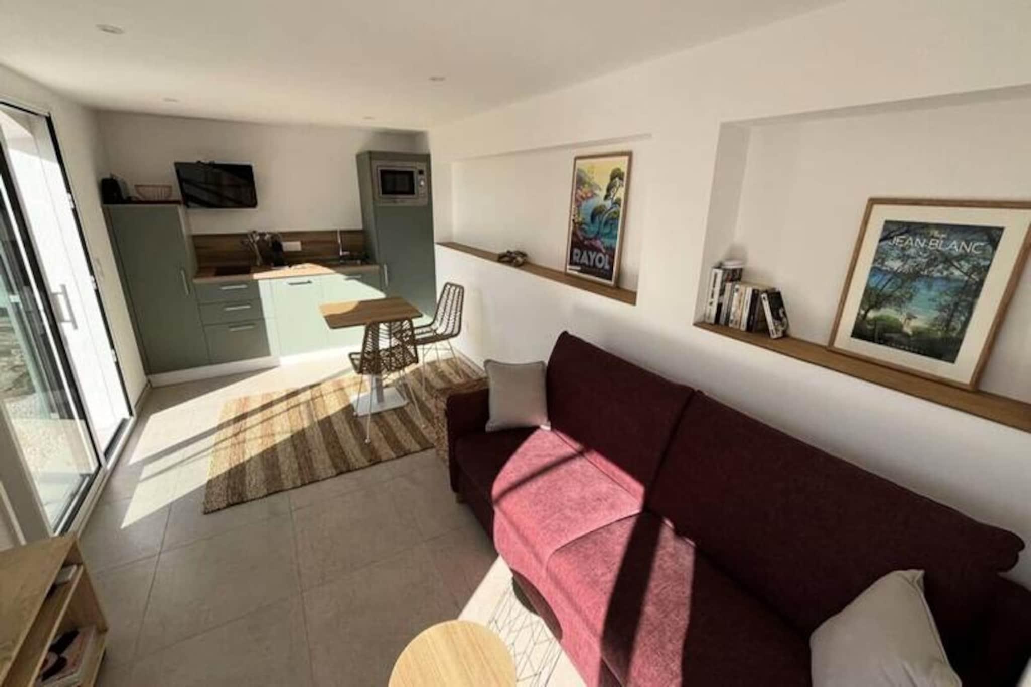 Beliggende over den glitrende middelhavskyst tilbyder dette smukt renoverede studio en fredfyldt tilflugtssted for to. Forestil dig at vågne op til den blide lyd af bølger og træde ud på en rummelig terrasse med betagende havudsigt. Beliggende i Aiguebelle, kun fem minutters gang fra sandstrandene, kombinerer dette charmerende tilflugtssted ro og bekvemmelighed, hvilket gør det til det perfekte sted for en romantisk ferie. Uanset om du nyder morgenmaden i morgensolen eller slapper af med et glas vin under stjernerne, inviterer terrassen dig til at omfavne den franske rivieras skønhed. \n\nIndenfor er studioet omhyggeligt designet med komfort og stil i tankerne. Den eksklusive 160 cm sovesofa sikrer afslappende nætter, mens det moderne badeværelse og det fuldt udstyrede køkken tilbyder alt det nødvendige for et problemfrit ophold. Smagfuld indretning tilføjer et strejf af elegance og skaber en varm og indbydende atmosfære. For din bekvemmelighed er lagner og håndklæder inkluderet, og sengen er redt ved ankomst, så du kan rejse let og fokusere på afslapning. \n\nUd over ejendommen venter den idylliske Aiguebelle-strand med gyldent sand og krystalklart vand, perfekt til svømning eller solbadning. Udforsk de nærliggende kyststier, oplev charmerende landsbyer, eller nyd lokal mad på restauranter ved havet. Uanset om du søger eventyr eller blot ønsker at slappe af, er dette studie din port til det bedste af Côte d'Azur. \n\nLad freden, komforten og charmen i dette tilflugtssted inspirere til uforglemmelige øjeblikke ved havet.