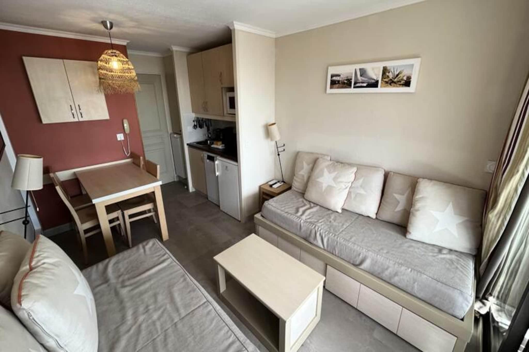 Hvor de azurblå bølger kysser det gyldne sand, inviterer denne charmerende etværelseslejlighed i L'Anse de Pramousquier-residensen dig til at opleve den ultimative ferie ved havet. Med panoramaudsigt over havet og den beroligende lyd af bølger som baggrund føles hvert øjeblik her som et roligt tilflugtssted i naturens favn. Kun få skridt fra stranden tilbyder denne ejendom idylliske omgivelser for par, små familier eller venner, der søger ro og skønhed. Indvendigt er lejligheden omhyggeligt designet til komfort og afslapning. Den airconditionerede stue og soveværelse sikrer en kølig oase selv på de varmeste dage, mens den private terrasse giver en plads på forreste række til horisontens stadigt skiftende farver. Den lyse opholdsstue har en hyggelig sovesofa, og det fuldt udstyrede køkken gør madlavning til en leg. Et funktionelt badeværelse og separat toilet bidrager til bekvemmeligheden, og den dedikerede parkeringsplads sikrer stressfri ankomst og afgang. Selve residensen er et fristed for afslapning. Deltag i livlige beachvolleykampe, nyd venskabelige bordtennisspil, eller lad de små udforske børnenes legeplads. Med sengelinned og håndklæder samt gennemtænkte detaljer som et par essentielle ting ved ankomst, er dit ophold designet til at være ubesværet og behageligt. Beliggende i rolige og uspolerede omgivelser er denne lejlighed perfekt til dem, der drømmer om at vågne op til havets lyd og tilbringe deres dage med at sole sig i middelhavssolen. Uanset om du slentrer langs den uberørte strand, nyder det lokale køkken eller blot slapper af på din terrasse, er dette dit lille hjørne af paradis for en uforglemmelig ferie ved havet.