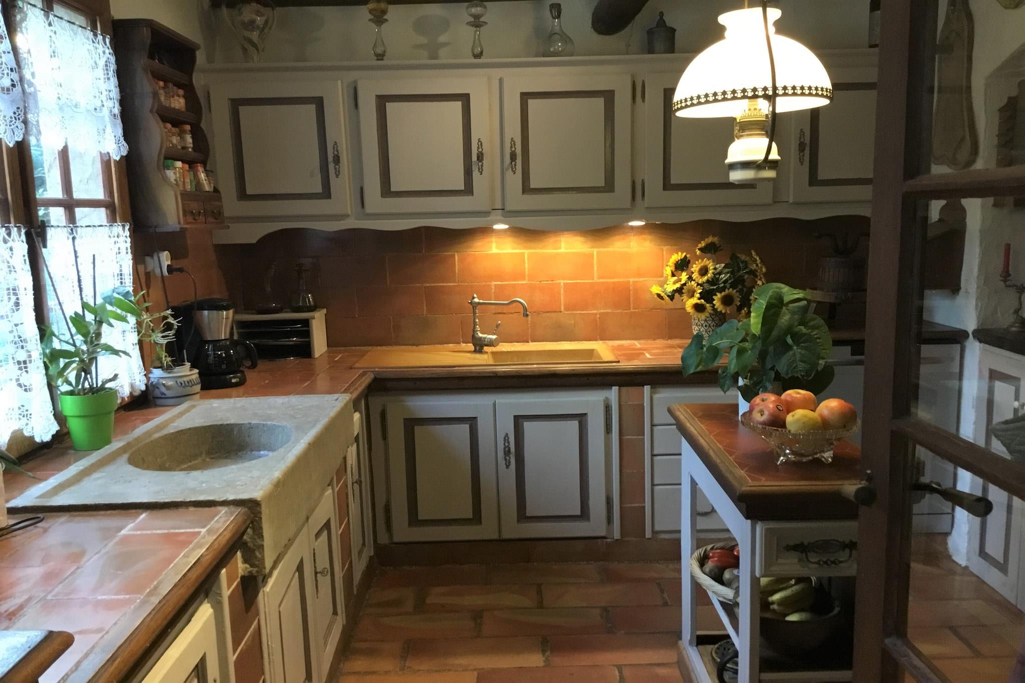 Stueetage: (Stue(70 m2)(Fjernsyn, pejs, DVD-afspiller, CD-afspiller, stereoanlæg), Køkken(komfur, kaffemaskine, ovn, mikrobølgeovn, opvaskemaskine , køle-fryseskab, vaskemaskine), soveværelse(enkeltseng, insektnet), soveværelse(dobbeltseng, Fjernsyn, insektnet), badeværelse(badekar med bruser), toilet) På 1. etage: (soveværelse(dobbeltseng(160 x 200 cm), Fjernsyn), badeværelse(bruser, håndvask, toilet), bibliotek) havestue/veranda, komfur(gas), varme, terrasse, have(> 1000 m2), grill, swimmingpool(privat, 8 x 4 m., opened from Jun upto and including Aug), petanquebane, bordtennisbord, cykler til rådighed, barneseng