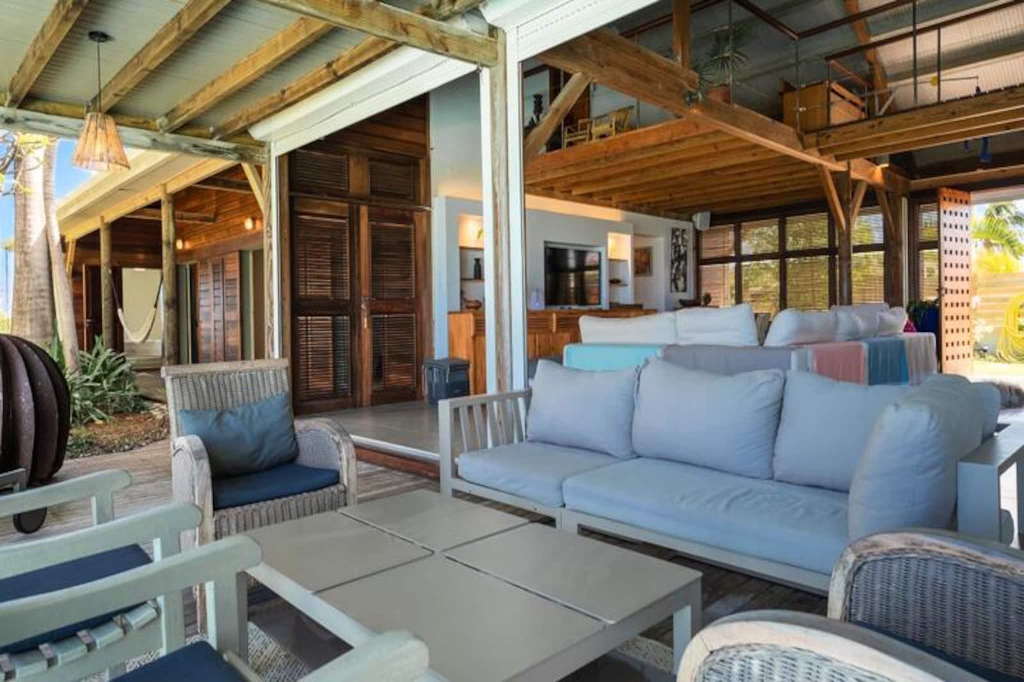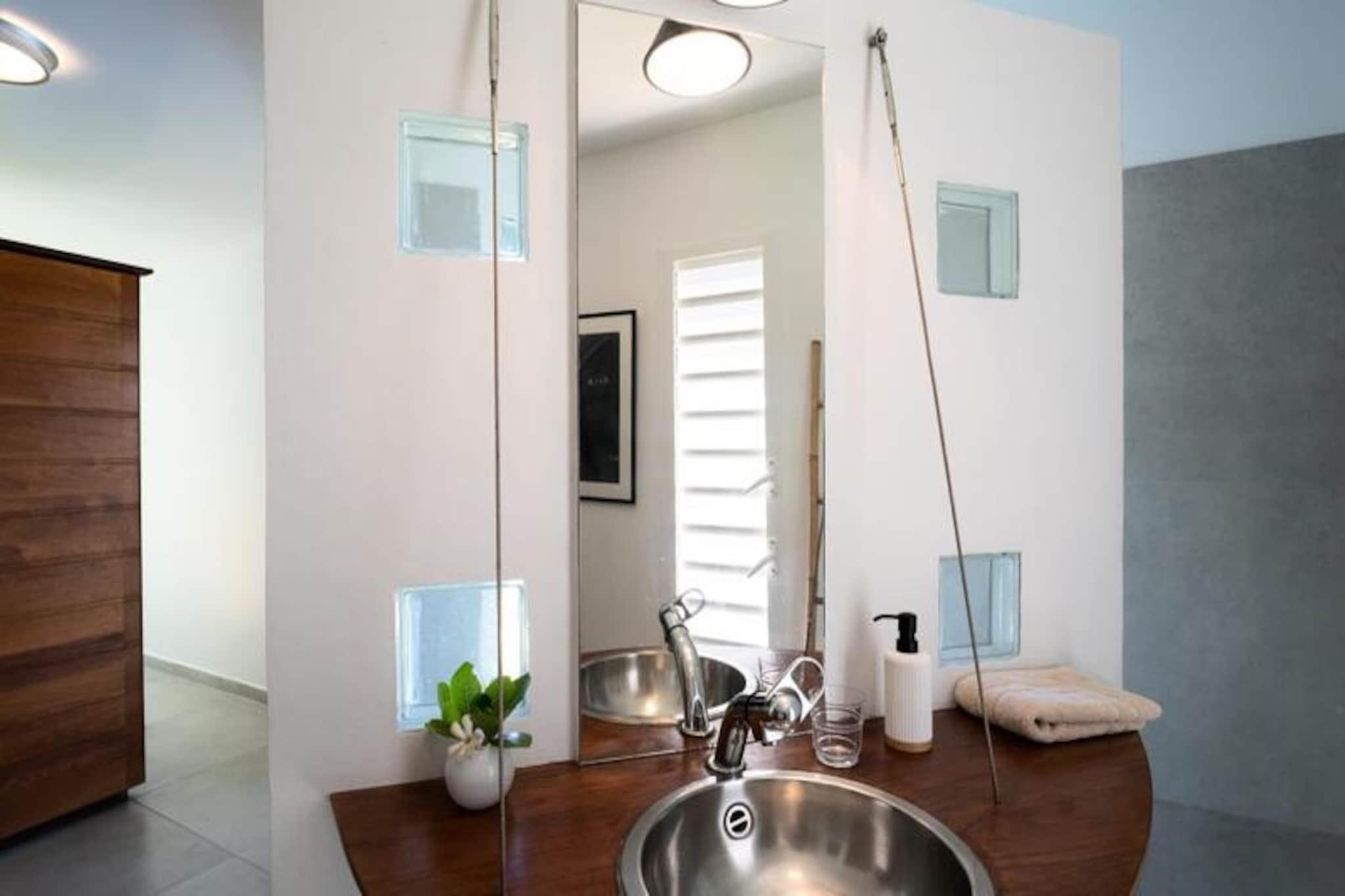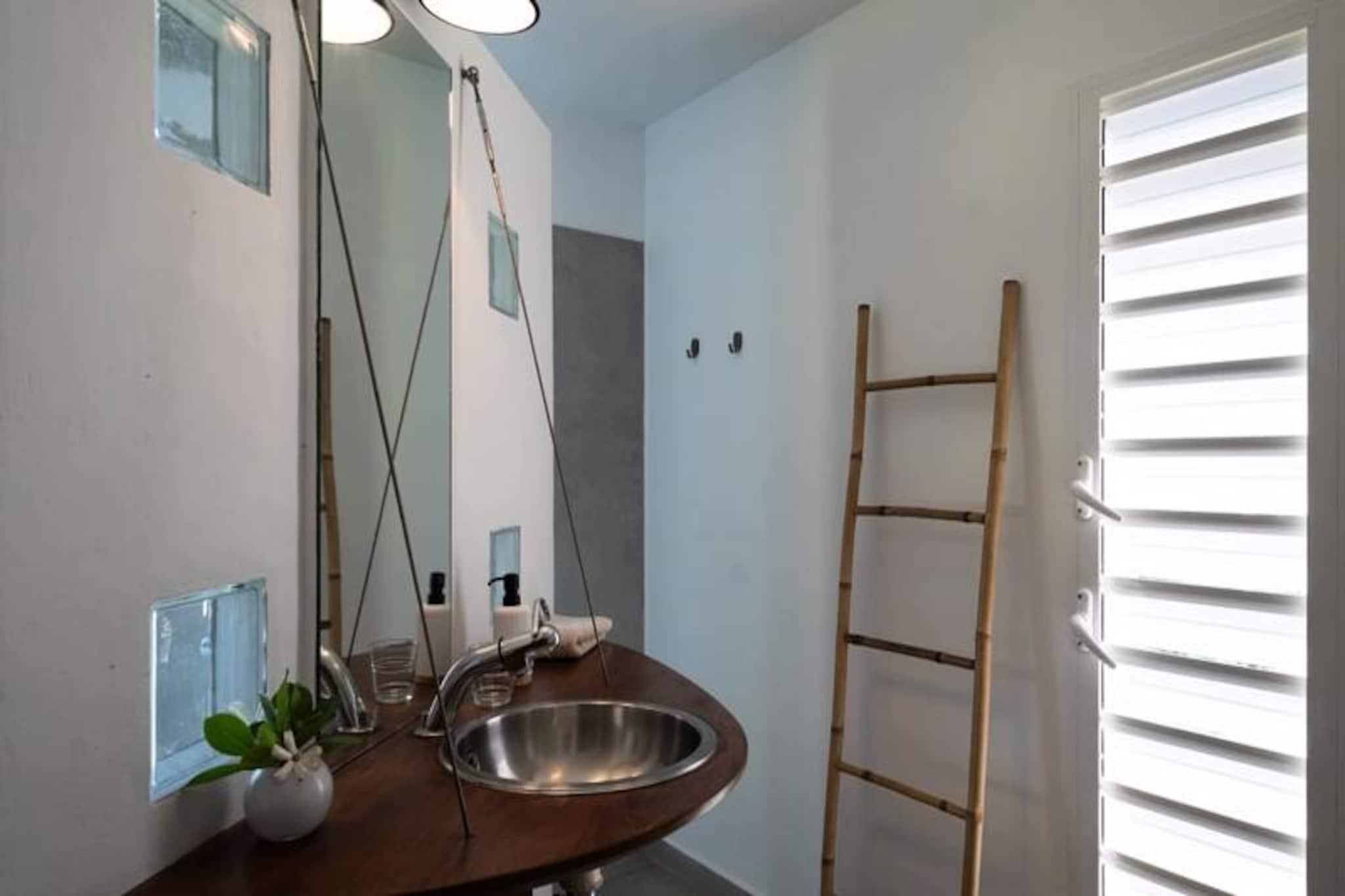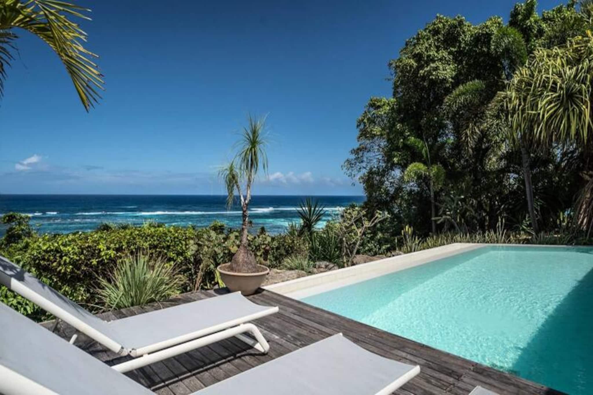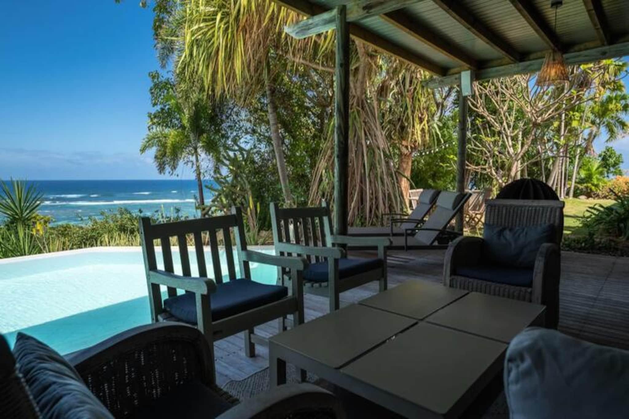 Denne smukke 4-stjernede villa kombinerer eksotisk charme med moderne bekvemmeligheder, og tilbyder fire soveværelser og tre bruserum, med plads til op til otte gæster. Hvert værelse har udsigt over havet og palmerne, og alle værelser har aircondition. Villaen er perfekt til afslapning, med en fredelig atmosfære og friske økologiske æg leveret dagligt af venlige høns. Kæledyr er ikke tilladt, hvilket sikrer et roligt miljø. Villaen ligger i Moule, kun 3 minutters gang fra Trade Winds-stranden og kendte surfspots. Den pulserende Saint-François-marina, med restauranter, butikker og en golfbane, ligger kun 15 minutter væk. Gæster kan nyde vandsport såsom kiteboarding og wing-foil, eller udforske lokalområdet, som tilbyder alle nødvendige faciliteter, herunder et supermarked, bageri og apotek. Villaen har et fuldt udstyret køkken, perfekt til at lave lokale måltider, og en rummelig terrasse med skyggefuld spiseplads. Den smaragdfarvede pool, omgivet af frodig vegetation, inviterer til afslapning. Indenfor blander indretningen træ og kunst og skaber en varm og indbydende atmosfære. Vandreservesystemet sikrer en pålidelig vandforsyning under hele dit ophold.