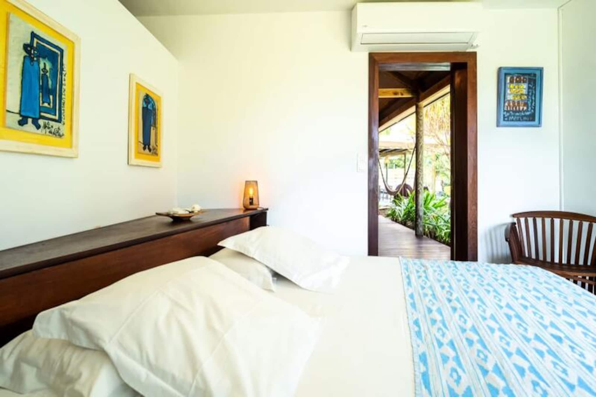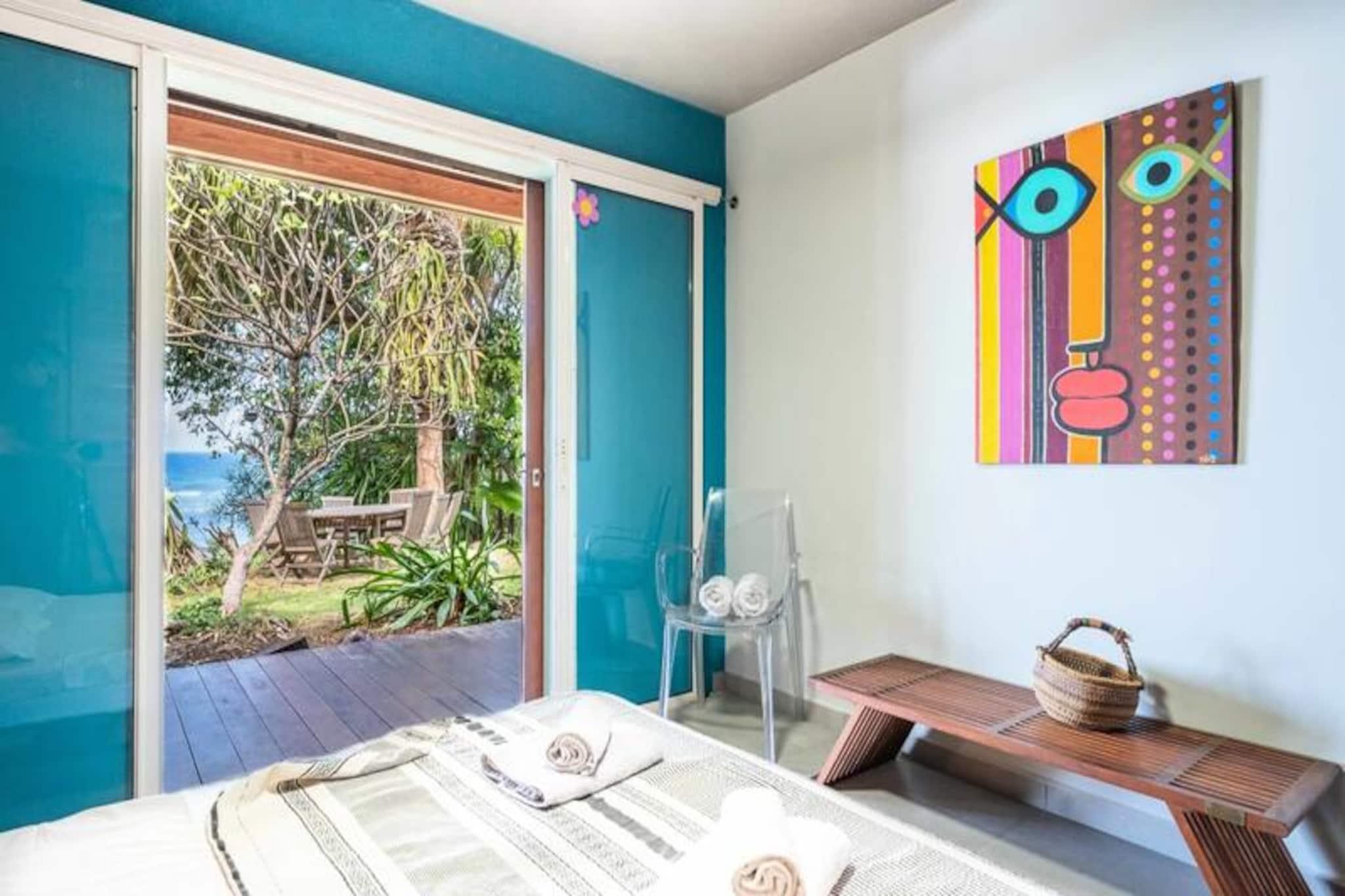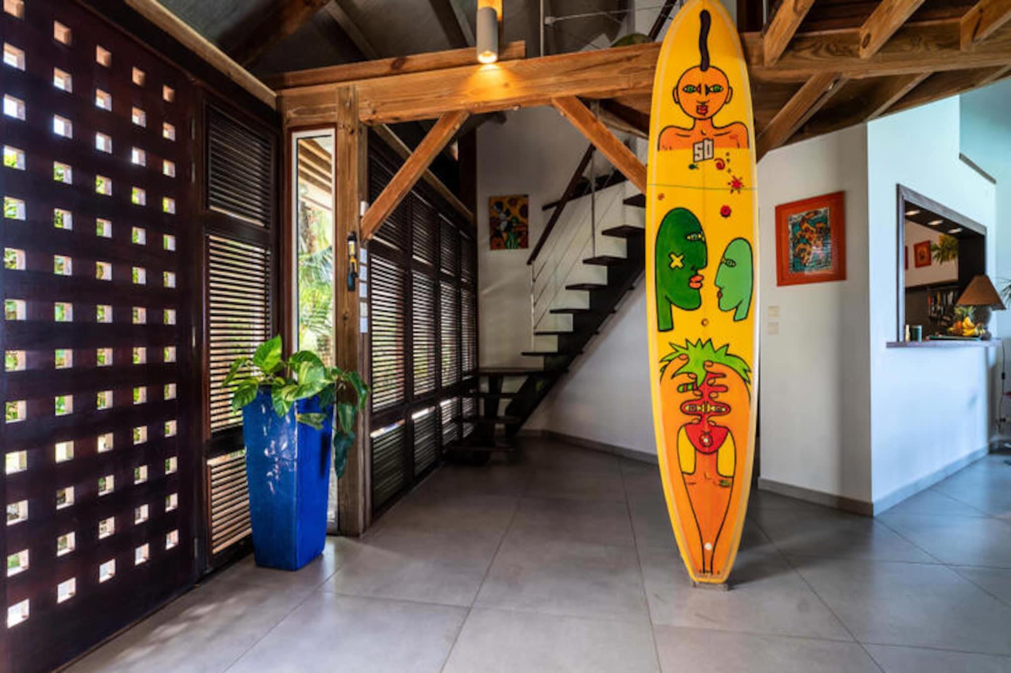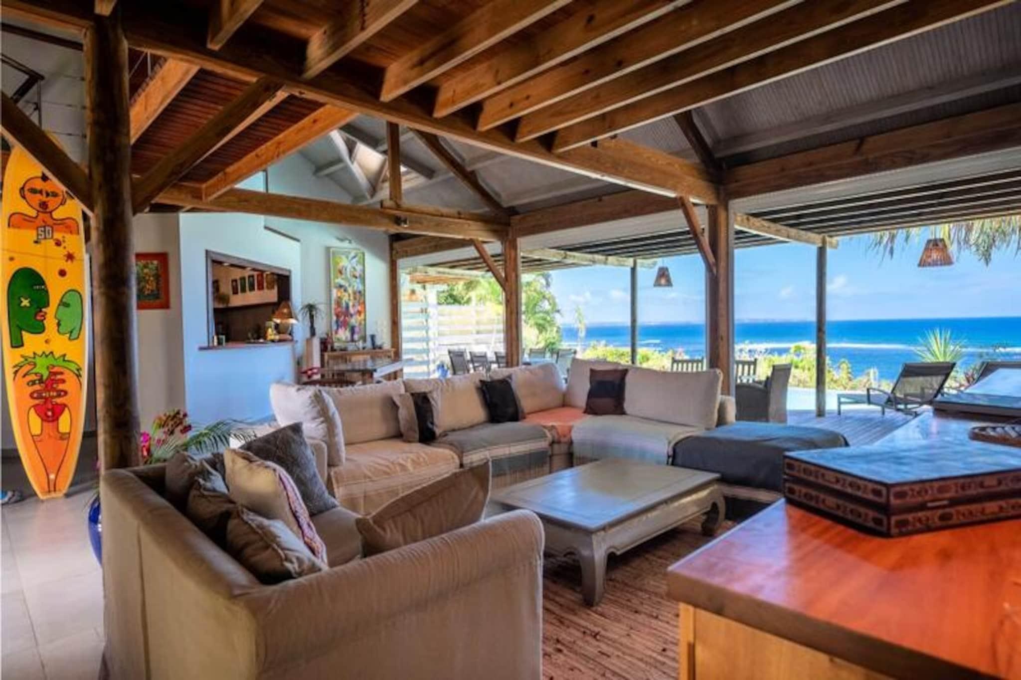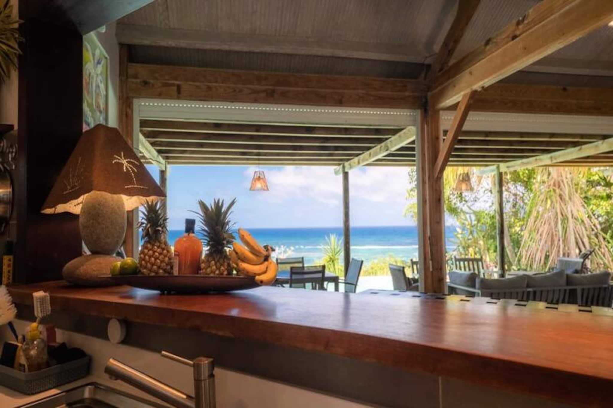 Denne smukke 4-stjernede villa kombinerer eksotisk charme med moderne bekvemmeligheder, og tilbyder fire soveværelser og tre bruserum, med plads til op til otte gæster. Hvert værelse har udsigt over havet og palmerne, og alle værelser har aircondition. Villaen er perfekt til afslapning, med en fredelig atmosfære og friske økologiske æg leveret dagligt af venlige høns. Kæledyr er ikke tilladt, hvilket sikrer et roligt miljø. Villaen ligger i Moule, kun 3 minutters gang fra Trade Winds-stranden og kendte surfspots. Den pulserende Saint-François-marina, med restauranter, butikker og en golfbane, ligger kun 15 minutter væk. Gæster kan nyde vandsport såsom kiteboarding og wing-foil, eller udforske lokalområdet, som tilbyder alle nødvendige faciliteter, herunder et supermarked, bageri og apotek. Villaen har et fuldt udstyret køkken, perfekt til at lave lokale måltider, og en rummelig terrasse med skyggefuld spiseplads. Den smaragdfarvede pool, omgivet af frodig vegetation, inviterer til afslapning. Indenfor blander indretningen træ og kunst og skaber en varm og indbydende atmosfære. Vandreservesystemet sikrer en pålidelig vandforsyning under hele dit ophold.