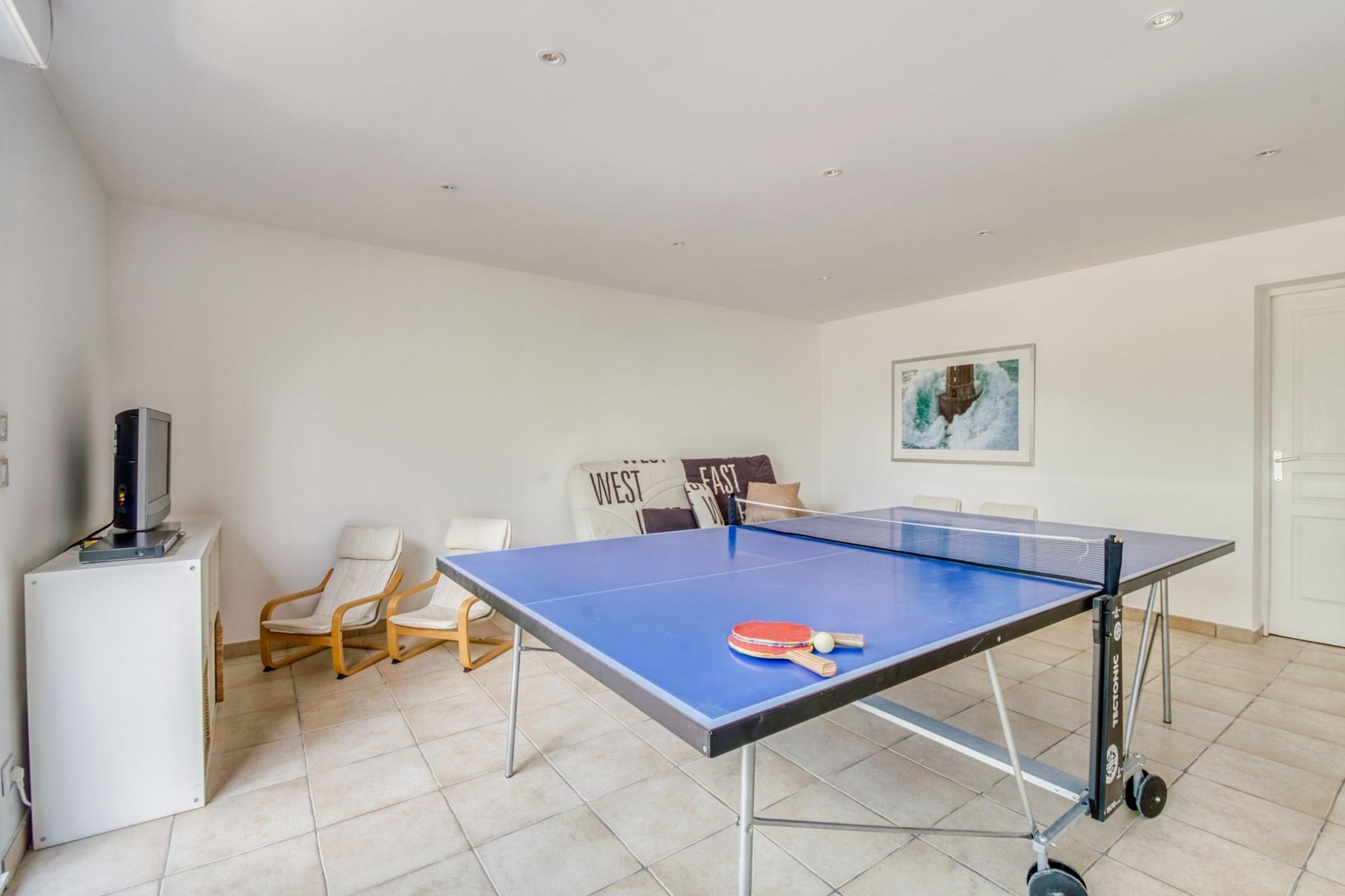 Stueetage: (Stue(Fjernsyn(fladskærm, parabol), pejs, sofahjørne, DVD-afspiller, stereoanlæg, varme(gulvvarme)), spisestue(Fjernsyn(fladskærm, parabol), spisebord, varme(gulvvarme)), Køkken(Fjernsyn(fladskærm, parabol), elkedel, brødrister, komfur(glaskeramisk), 2x kaffemaskine(kopper, kaffetragt, kaffepude), combi-mikroovn, opvaskemaskine , 2x køle-fryseskab, varme(gulvvarme)), Soveværelse med badeværelse(dobbeltseng(180 x 200 cm), bruser, håndvask, toilet, varme(gennem aircondition), klimaanlæg, terrasse), toilet, pulterkammer(køle-fryseskab, tørretumbler, vaskemaskine)) På 1. etage: (soveværelse(2x enkeltseng(90 x 200 cm), balkon, varme(gennem aircondition), klimaanlæg), soveværelse(2x enkeltseng(90 x 200 cm), balkon, varme(gennem aircondition), klimaanlæg), Soveværelse med badeværelse(dobbeltseng(180 x 200 cm), bruser, håndvask, toilet, balkon, varme(gennem aircondition), klimaanlæg), badeværelse(badekar, bruser, håndvask, varme(elektrisk)), toilet) Kælderetage: (soveværelse(2x enkeltseng(90 x 200 cm), varme(gennem aircondition), klimaanlæg, terrasse), soveværelse(køjeseng, varme(gennem aircondition), klimaanlæg, terrasse), Soveværelse med badeværelse(dobbeltseng(180 x 200 cm), bruser, håndvask, varme(gennem aircondition), klimaanlæg, terrasse), badeværelse(badekar, bruser, håndvask, varme(elektrisk)), toilet, legeværelse(DVD-afspiller, bordtennisbord)) tremmeseng, tremmeseng, klimaanlæg, terrasse(privat, overdækket), terrasse(privat), have(privat, 2700 m2), havemøbler, solstole, grill(trækul), swimmingpool(privat, indhegnet, 12 x 6 m.), petanquebane, barnestol, barnestol
