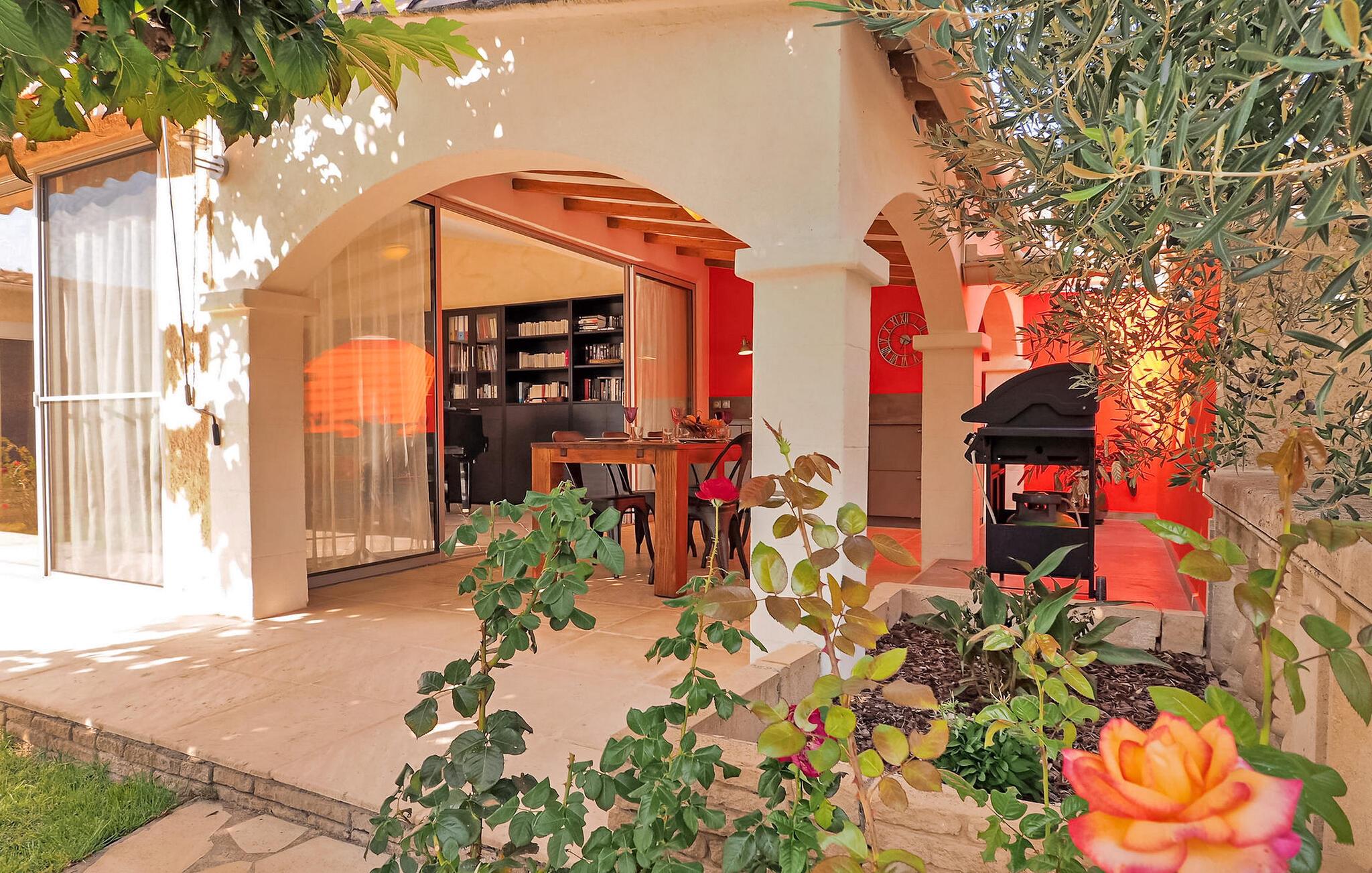 Oplev en dejlig ferievilla beliggende i Paradou, Alpilles, Provence, der tilbyder en fortryllende flugt. Denne villa har en privat opvarmet pool, en have og rolige omgivelser i et roligt område af Paradou, med nem adgang til nærliggende butikker. Denne et-etagers villa omfatter en indgang, der fører til et opholdsområde med spisestue, afslappende opholdsområde, åbent køkken og en indbydende veranda. Villaen byder på hyggelige soveværelser, herunder et som er ideelt for børn. Udenfor kan du opdage de indbydende udendørsfaciliteter midt i en lukket have: en trampolin til børn, en overdækket terrasse med et sommerkøkken og en privat opvarmet pool (7m x 4m) med komfortable lounging områder og fitnessudstyr. Huset ligger i hjertet af Paradou, en karakteristisk landsby i Alpilles. Alle faciliteter er inden for gåafstand: Bageri, læge, supermarked, restauranter. For mere shopping kan du besøge Saint Martin de Crau (10 km) eller Arles (8 km). Typiske provencalske markeder, der er værd at besøge, er: onsdag i Saint Rémy, torsdag i Maussane les Alpilles og fredag i Saint Martin de Crau. Le Paradou er beliggende nær Maussane les Alpilles og kun 3 km fra des Baux de Provence. Nyd din ferie i Bouches-du-Rhône i Provence.