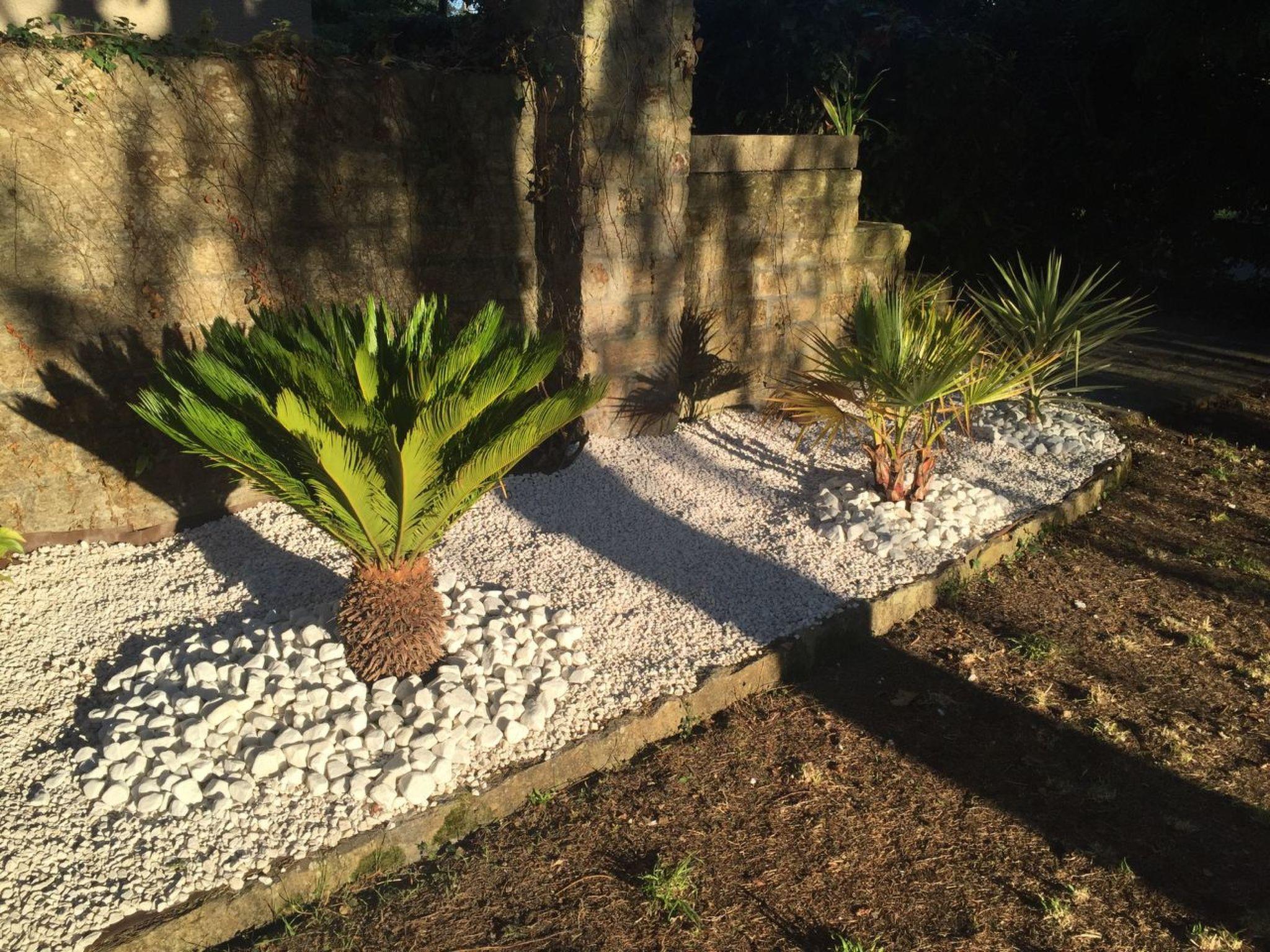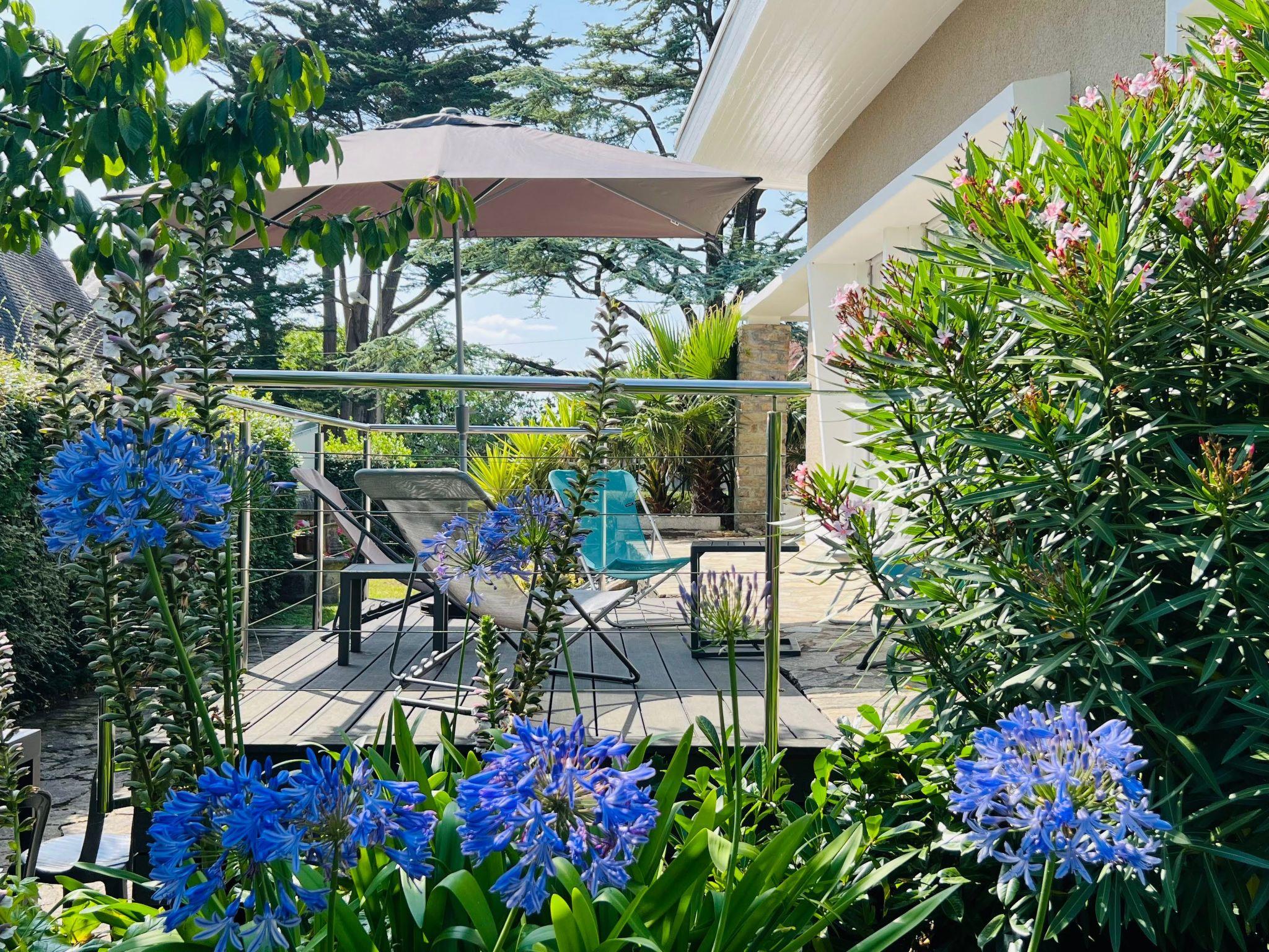 Our 500m2 garden is bright and green, with hydrangeas adding a lovely splash of colour. The mild climate means that palm trees flourish at the foot of the villa.