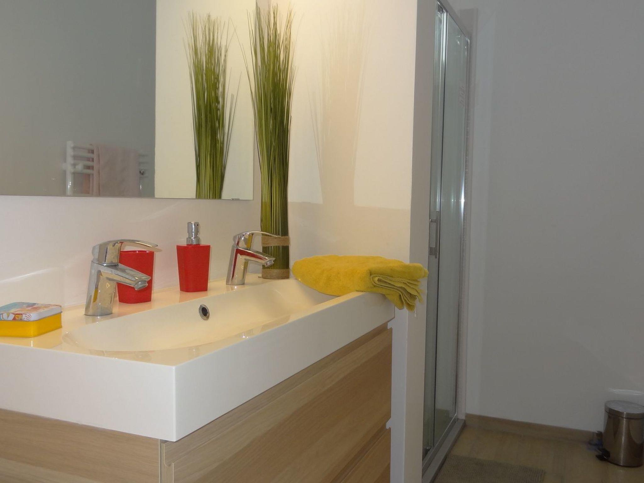 The bathroom has a double washbasin, a large shower (110x80) with natural lighting, and a heated towel rail.