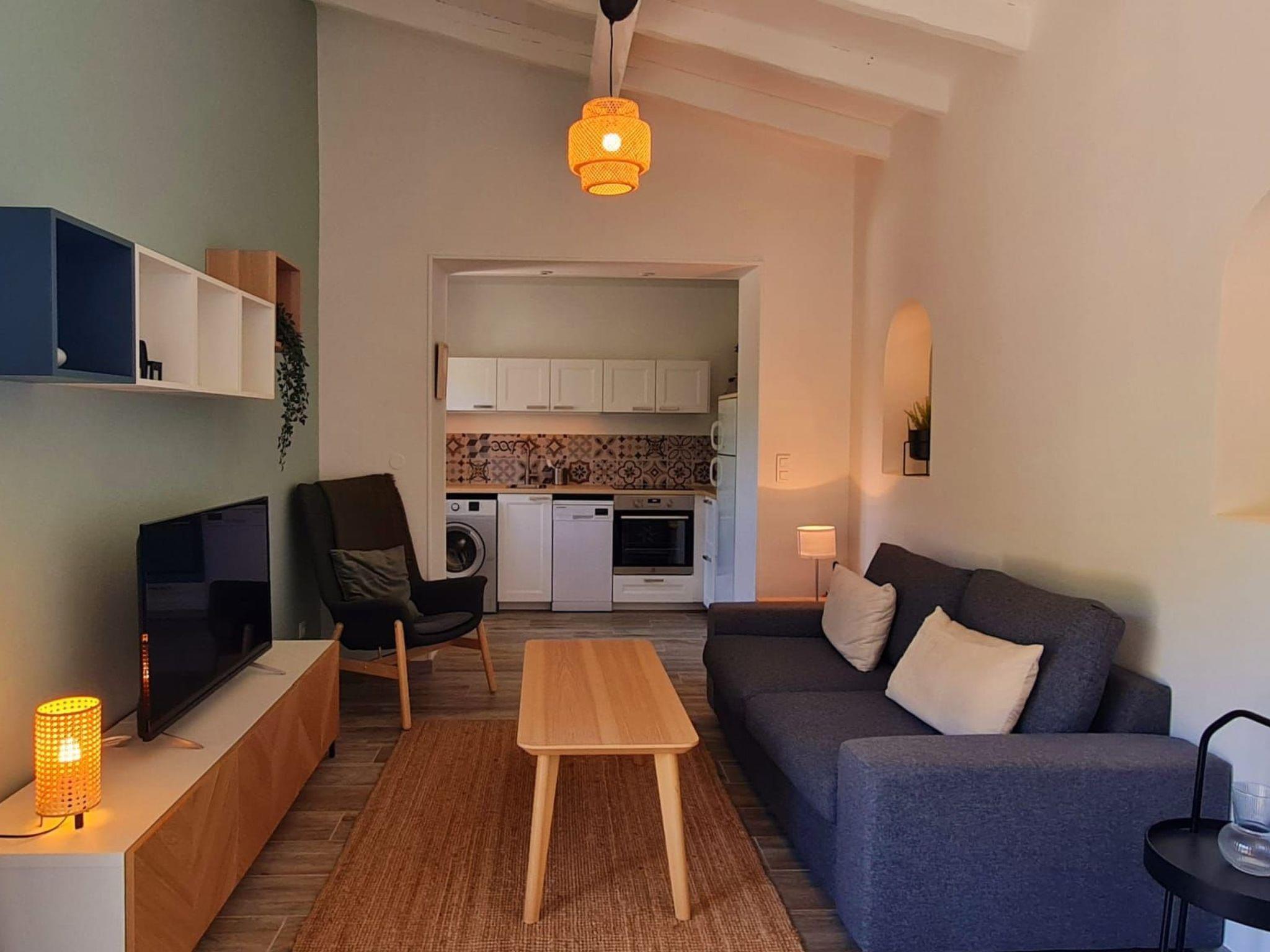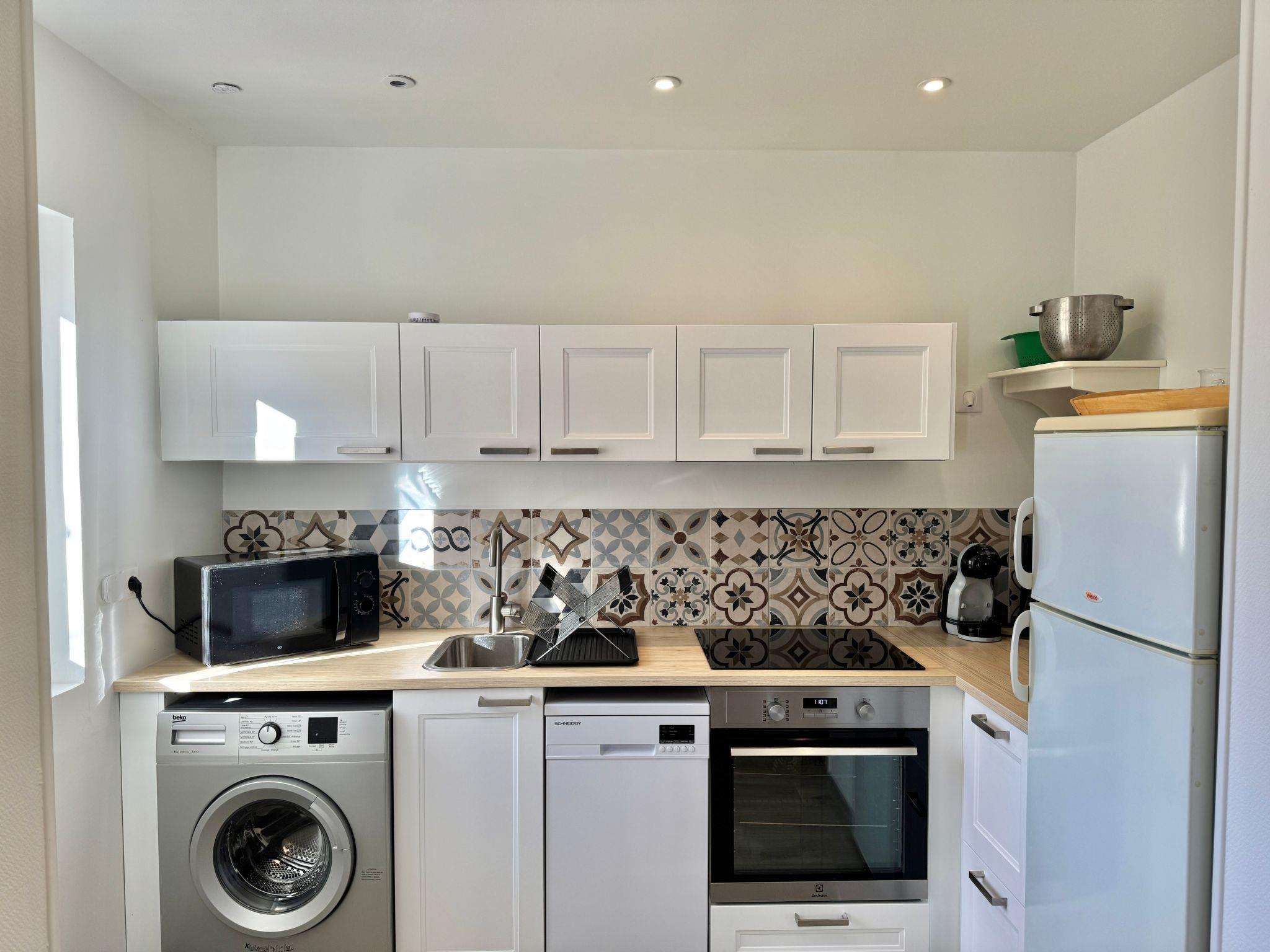 Warm and comfortable gîte with living/dining room, sofa bed, fully equipped kitchen (hob, oven, microwave, fridge, coffee maker, toaster, dishwasher), double bedroom (2 twin beds), bathroom with shower and separate WC. Washing machine and iron available. Terrace overlooking the pétanque court, sea view. Bedroom: * 2 single beds 0.90 x 2.00m * Living room: sofa bed 1.40 x 2.00m for 2 people Fully equipped kitchen.