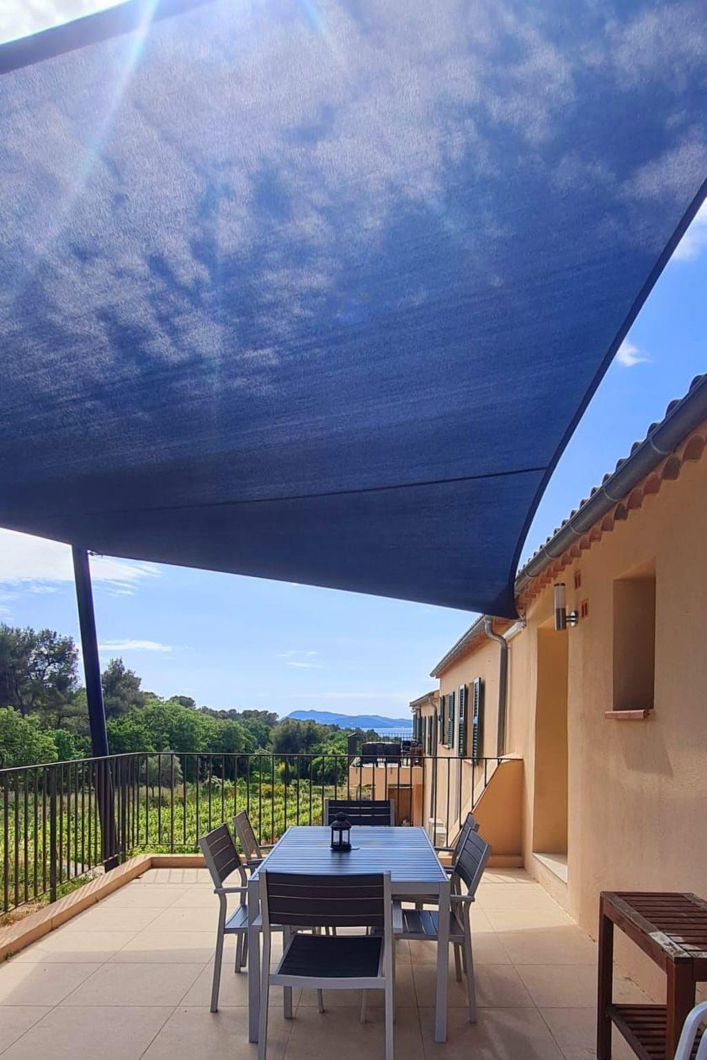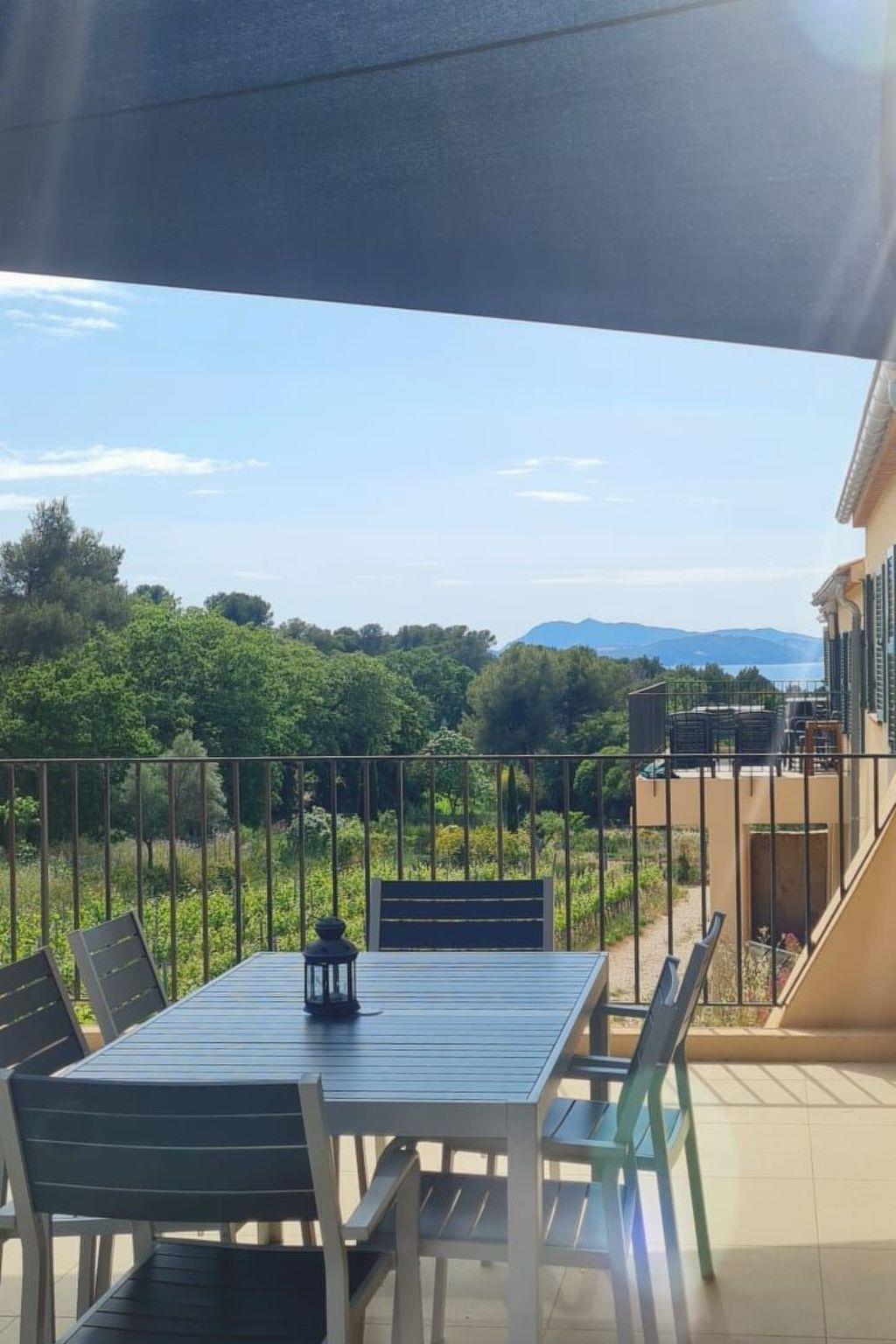 Large private terrace with table and chairs and parasol overlooking the vineyards. Uninterrupted view of the sea.