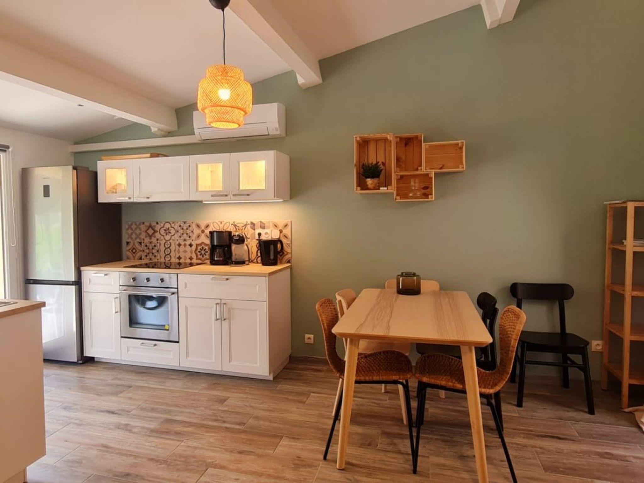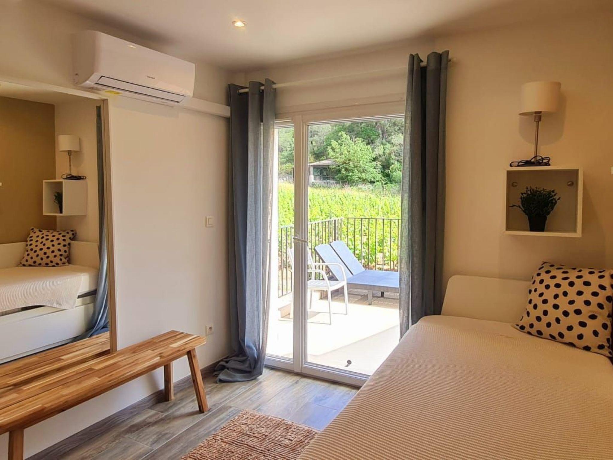 Gîte of 70m² for 7 people. Very pleasant gîte comprising a fully-equipped open-plan kitchen (hob, oven, microwave, fridge, coffee maker, toaster, dishwasher), a living room with sofa bed, a double bedroom (queen-size bed), a connecting double bedroom (2 single beds), a bathroom with shower and WC. Washing machine and iron available. Large terrace overlooking the vineyards with sea views. Bedroom: * 1 double bed 1.60 x 2.00m * 1 single bed 0.90 x 2.00m * Connecting room: Sofa bed 1.40 x 2.00m for 2 people * Living room: Sofa bed 1.40 x 2.00m for 2 people Fully equipped kitchen.