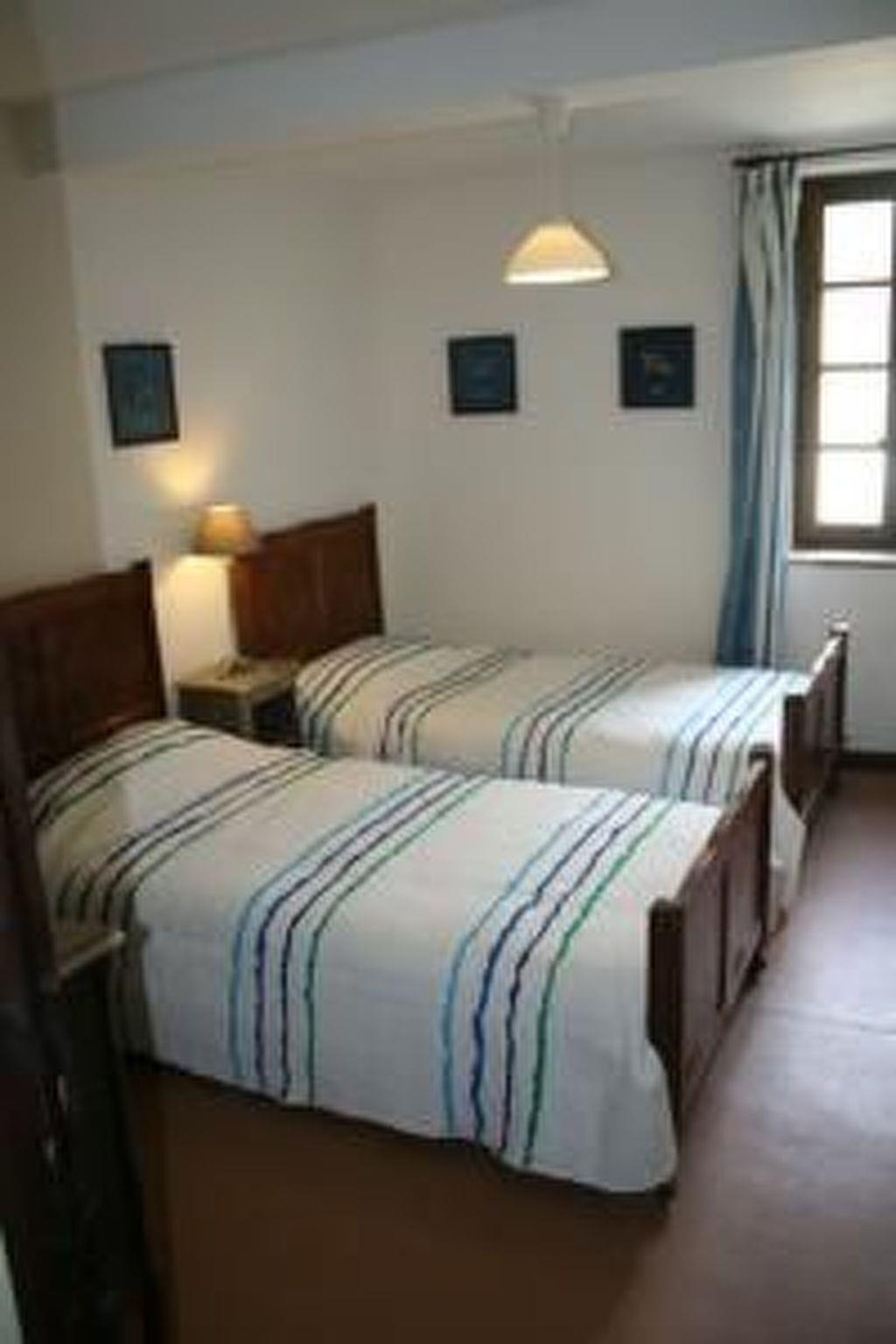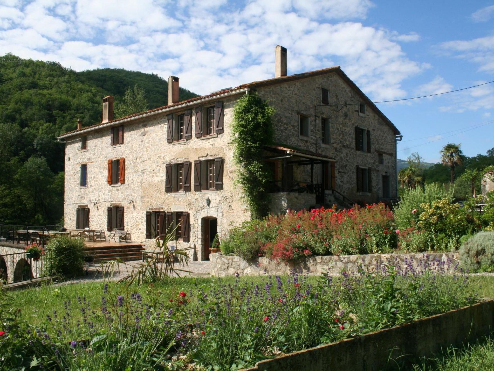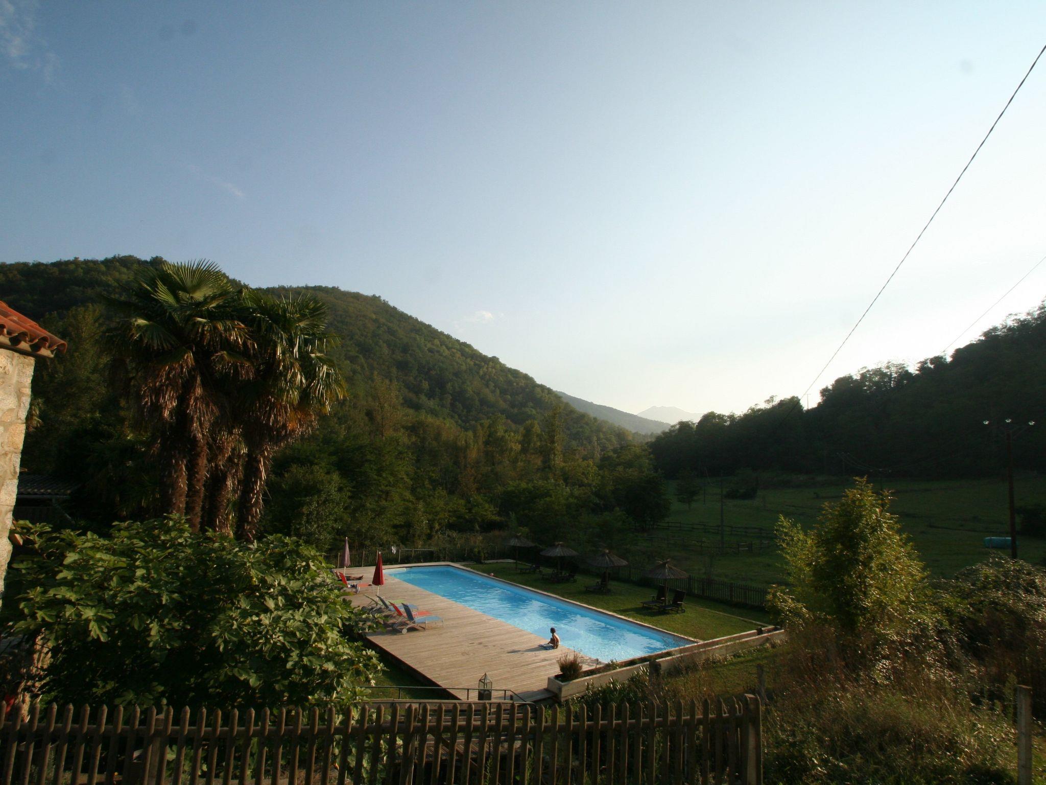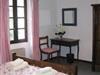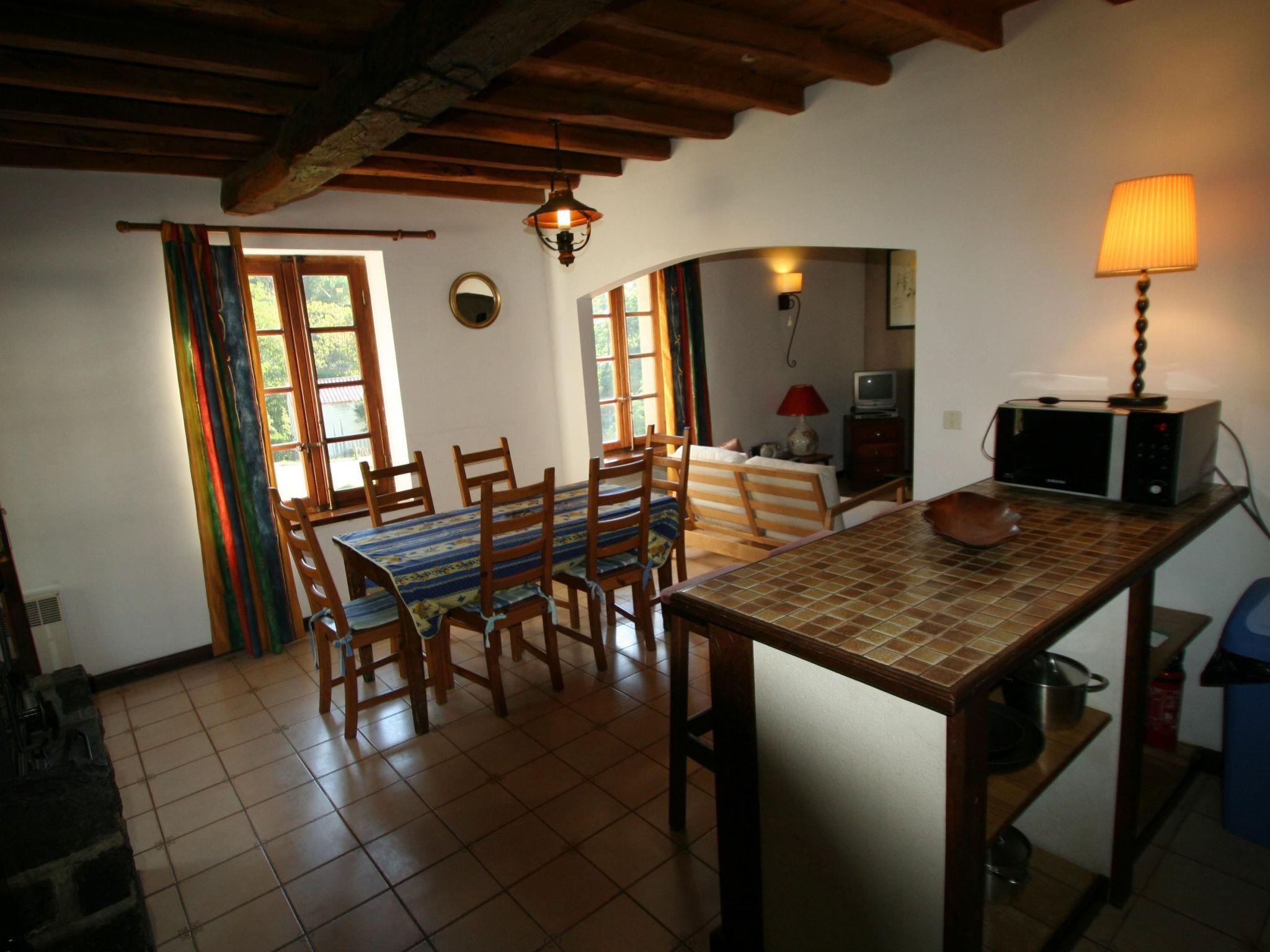 Access is via a covered porch with table and chairs, and another table in front of the gîte is on the lawn. The entrance is via the dining room and pleasant open-plan kitchen with its counter and high chairs. This north-east-facing flat comprises a spacious living/dining room with rocking chairs and TV. The open-plan kitchen is equipped with dishwasher, cooker with oven, microwave and other appliances for everyday use. Pleasant wood-burning stove. The flat has two bedrooms, one with a large 1.60 m double bed and the other with two single beds. The bathroom has a bath, bidet and separate WC. This flat also has the best view of the Mas.