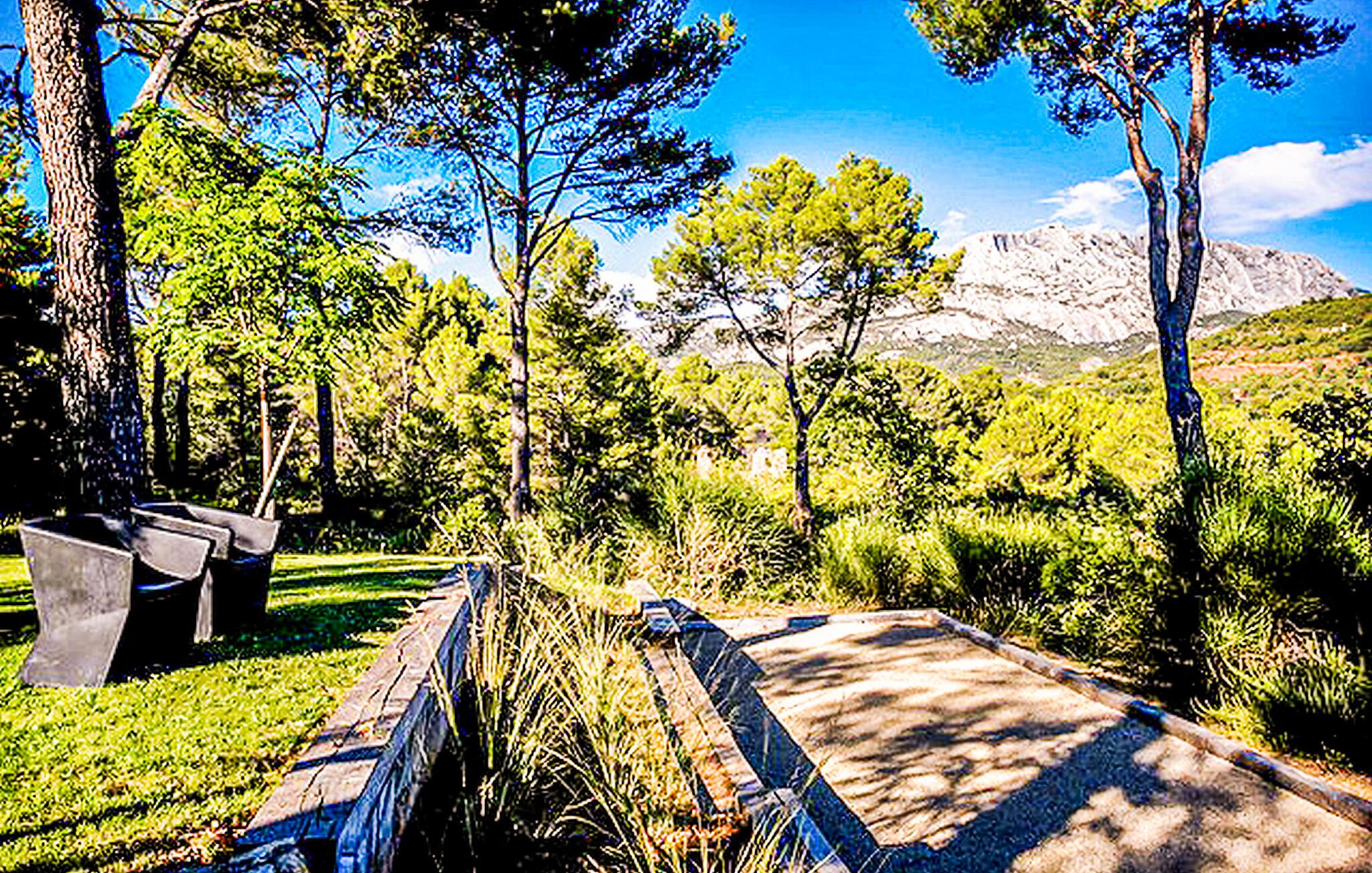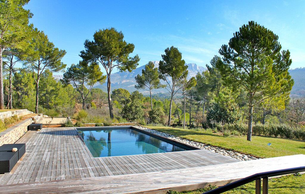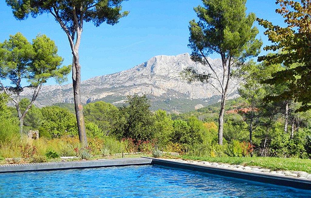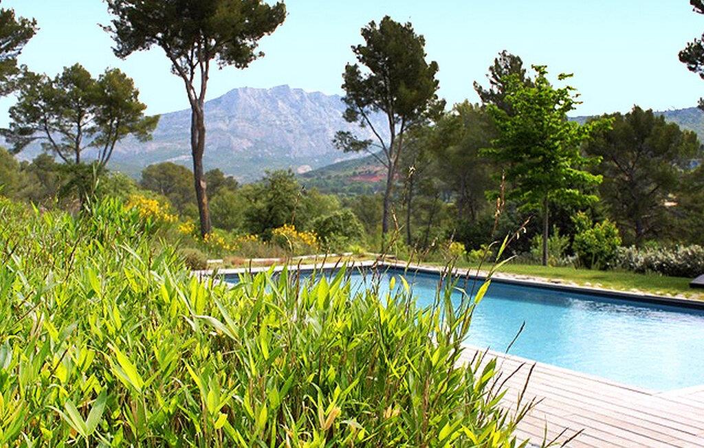 Beliggende i Le Tholonet, tæt på Aix en Provence, har denne moderne ferievilla en opvarmet privat pool med en fantastisk udsigt over Sainte Victoire-bjerget. Designervillaen, der ligger helt i stueplan, har en åben planløsning og ekspansive karnapper, der problemfrit fusionerer indendørs og udendørs rum, mens den fremviser betagende naturudsigter. Nyd moderne bekvemmeligheder under dit ophold, herunder en Nespresso-kaffemaskine i køkkenet og en Canal+-projektor i stuen, til familiefilmaftener. Soveværelserne er fordelt på to soveområder, med et område specielt designet til børn med et legerum og tv-stue til indendørs underholdning. Udenfor omfatter den vidtstrakte grund udendørs spisepladser, et udendørs badeværelse, en sikret og opvarmet pool med sikkerhedsafdækning samt rekreative områder som petanquebane og en dejlig legeplads. Villaen er beliggende i Le Tholonet omkring 10 minutter fra Aix en provence og 25 minutter fra havet og Calanques i Cassis. Le Tholonet er en ideel base for at opdage Provence, Cassis og calanques, Marseille, Aubagne, og tilbyder også forskellige vandre- og vandrestier i området omkring Sainte Victoire-bjerget. Nyd din ferie i Bouches-du-Rhône i Provence. Bemærk venligst: Om sommeren holder et afkølet gulvsystem en behagelig indendørstemperatur, selvom der ikke er aircondition. Derudover dækker rullegardiner de store karnapper, men de tilbyder måske ikke fuldstændig mørke, især i soveværelserne. Der er rengøring to gange om ugen og ugentlig vedligeholdelse af haven og poolen.