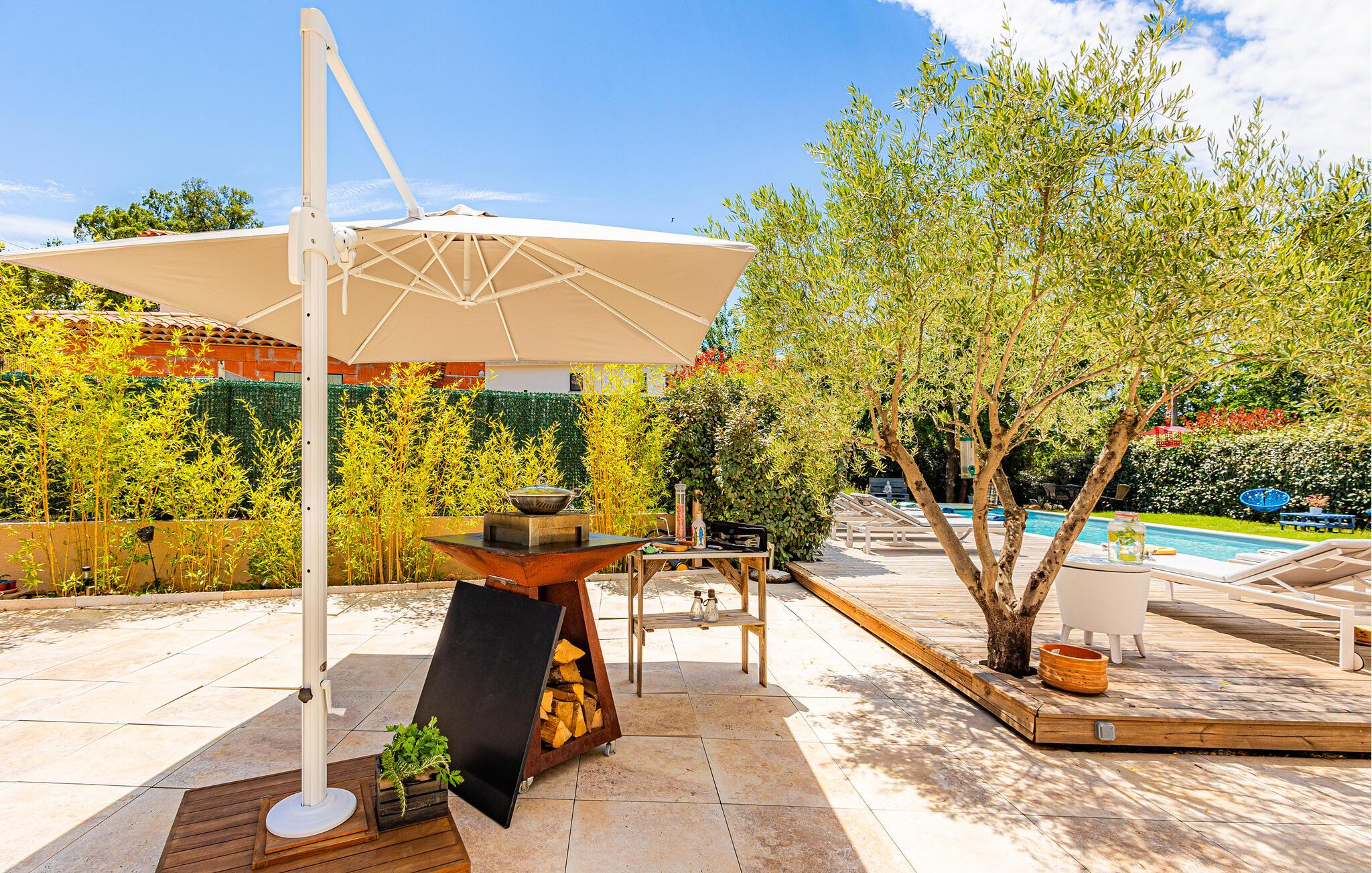 I kan også tilbringe dejlige timer udendørs. Nyd solen og et par kolde drinks på terrassen, I kan til enhver tid snuppe en frisk dukkert i den private pool og derefter slappe af i en liggestol. Afslut dagen med et lækkert måltid fra grillen.