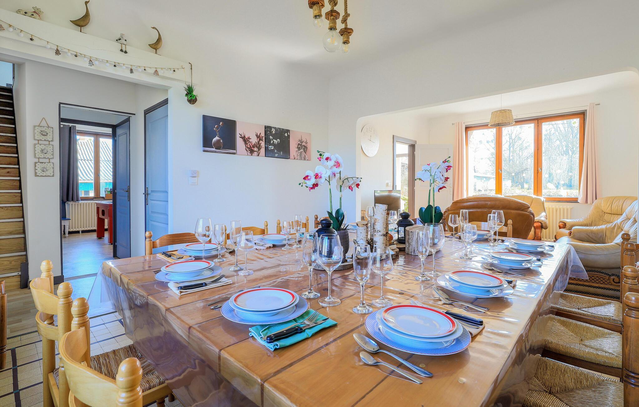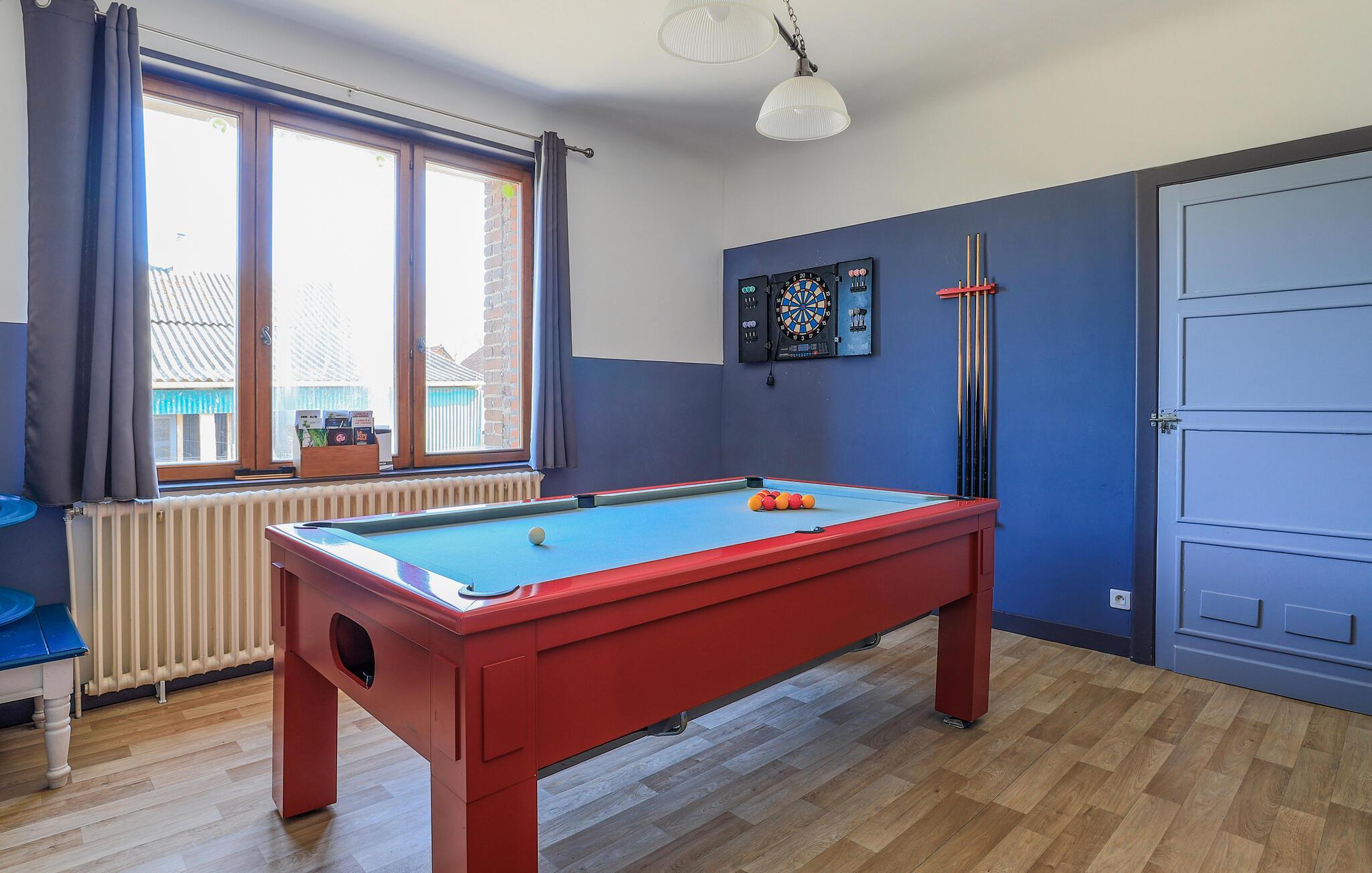 Nyd jeres ferie i dette rummelige hus med plads til flere familier, I et lille samfund med charmerende murstensarkitektur i Pas-de-Calais. Oplev den lyse og komfortabelt møblerede stue, ideel til sociale sammenkomster. Brug den rummelige spiseplads til at nyde måltider sammen, som I nemt kan tilberede i det smukke køkken. Brug underholdende timer på at spille billard eller dyster i spændende dartturneringer.