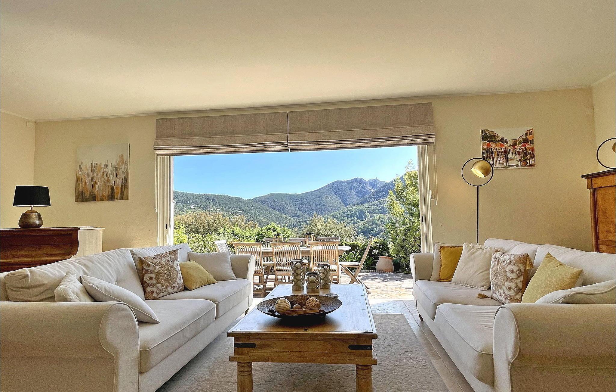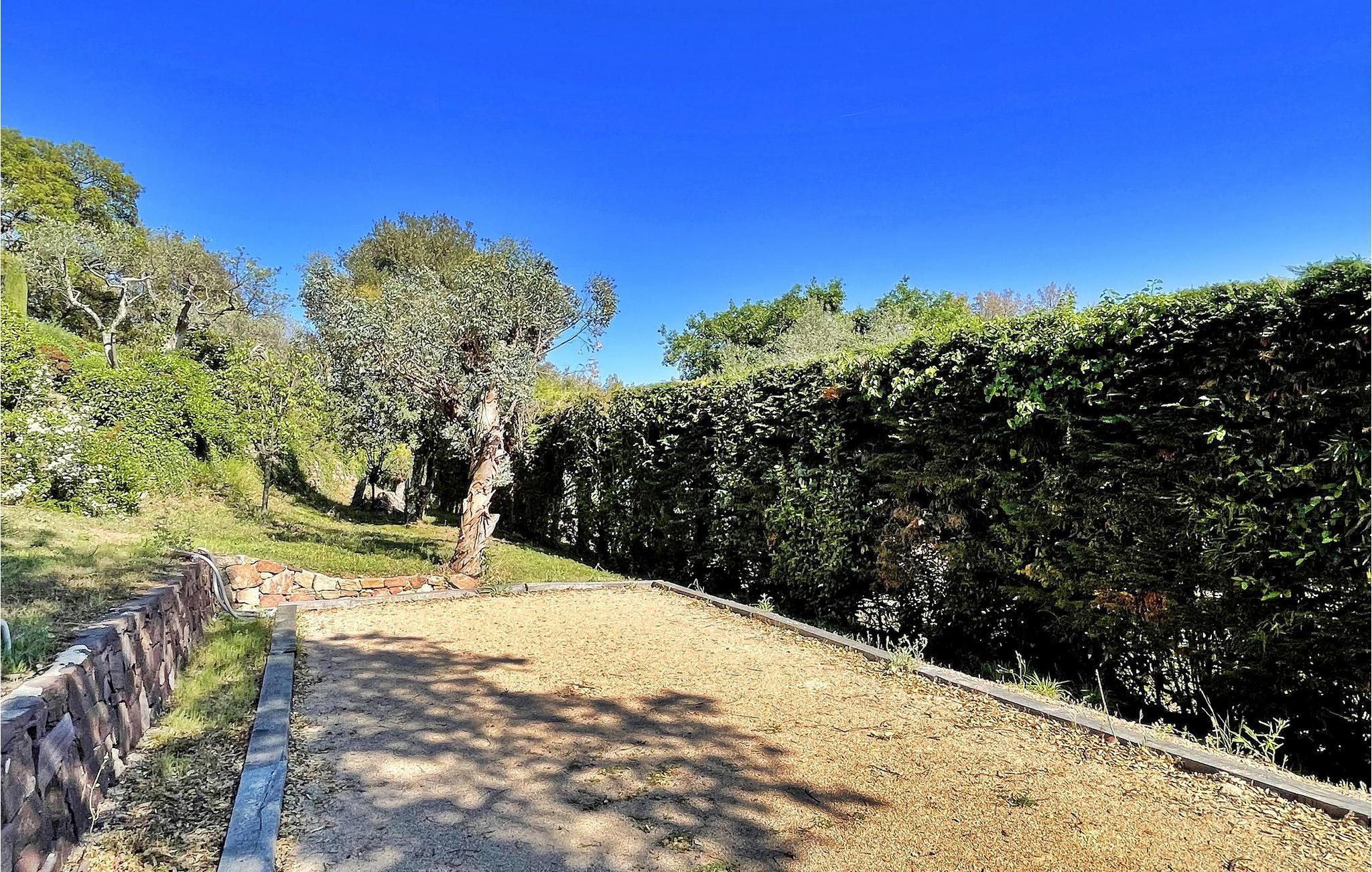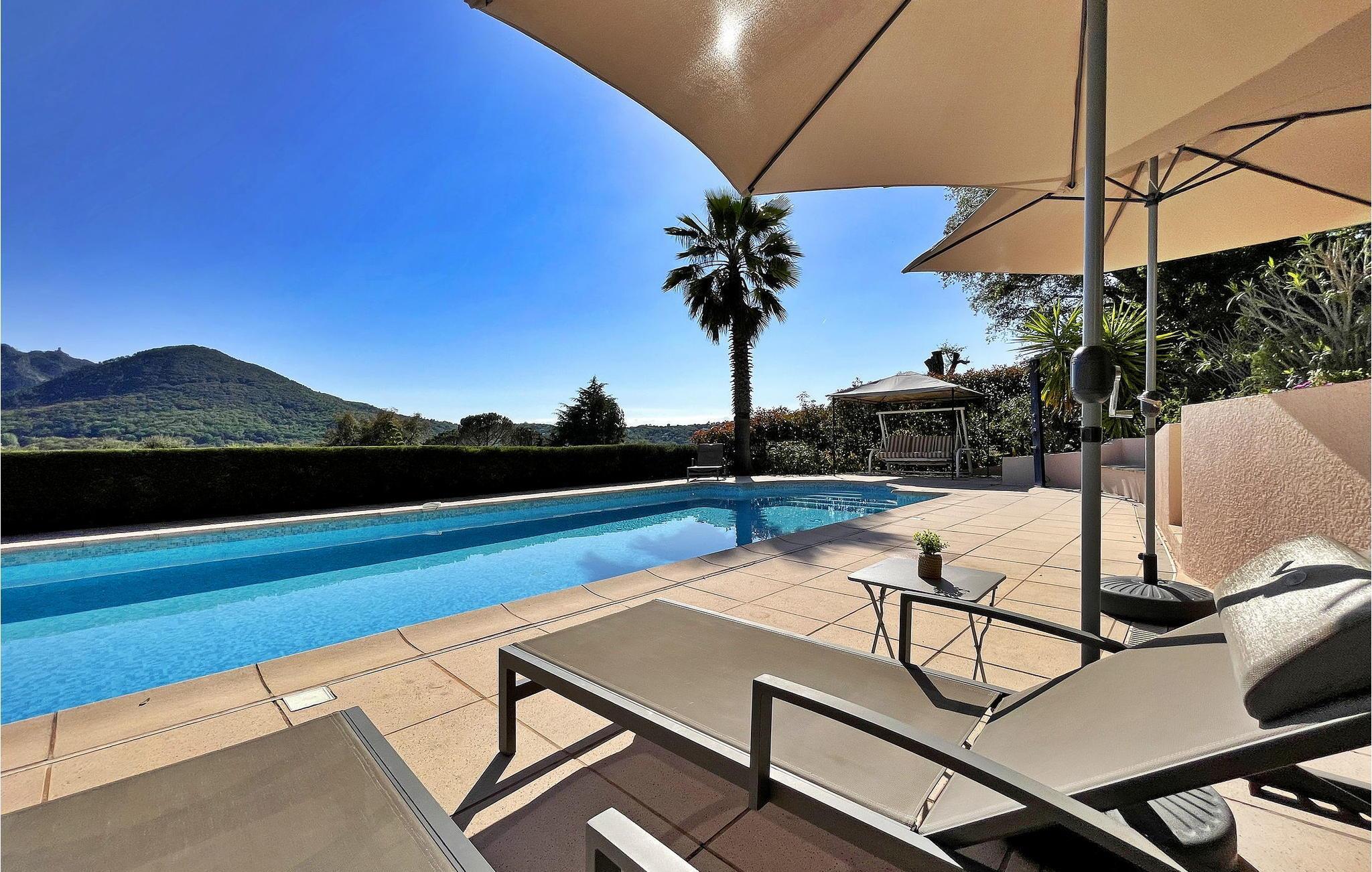Beliggende i Adrets-de-l'Estérel er denne ferievilla et idyllisk oase med en privat opvarmet swimmingpool, sauna og jacuzzi. Denne generøse og luksuriøse villa tilbyder indkvartering på to halve etager. En indgang i stueetagen fører til et halvt niveau højere med to soveværelser, begge med balkoner med udsigt over Estérel og aircondition. Nedstigning et halvt niveau bringer dig til en rummelig opholdsstue med kontorplads, lounge, tv-område og spiseplads. Det lukkede køkken, der åbner ud til en overdækket terrasse, er veludstyret. Yderligere to soveværelser, et brusebad, et vaskerum og et ekstra toilet fuldender dette niveau. Udendørs kan villaen prale af lukket terrassegrund, flere terrasser og en petanquebane. En haveterrasse har spa, indglasset sauna og afslapningszoner. Poolområdet kan prale af en opvarmet 12 mx 5 m pool, liggestole, en bruser ved poolen og en skyggefuld bar med vask og køleskab. Huset er ideelt beliggende i hjertet af Estérel, halvvejs mellem Saint-Cassien-søen og 12 km fra strandene i Mandelieu i Var. Landsbyens centrum af Estérel er omkring 2,5 km fra huset med alle lokale butikker. Du kan nyde vandre-, vandre- og mountainbikestier i hjertet af massivet med adskillige stier gennem ege og fyrretræer, med storslåede udsigtspunkter og pauser nær søerne Avellan eller Saint-Cassien. Disse to søer er et godt sted at fiske, og søen Saint-Cassien byder på smukke strande udstyret til svømning samt forfriskningsbarer og udlejning af vandcykler. Golfelskere vil sætte pris på Terres Blanches golfbane omkring 20 km væk i Fayence. Tag på en ferie, hvor luksus møder natur og skaber en uforglemmelig flugt i hjertet af Estérel.