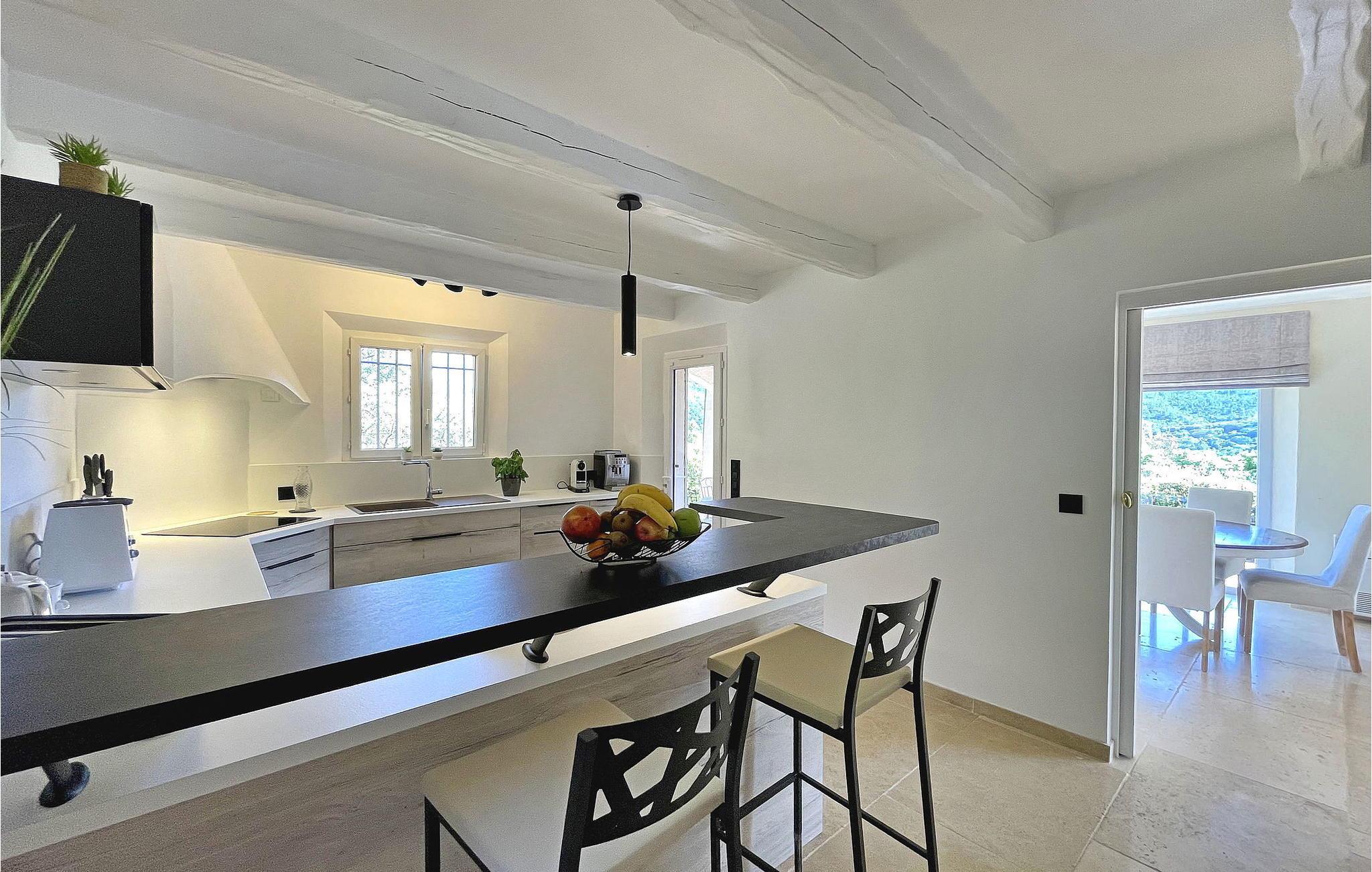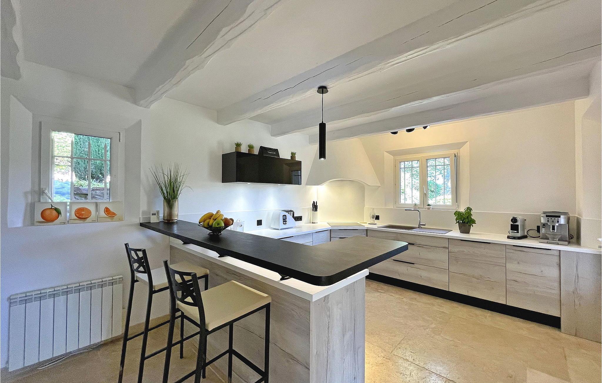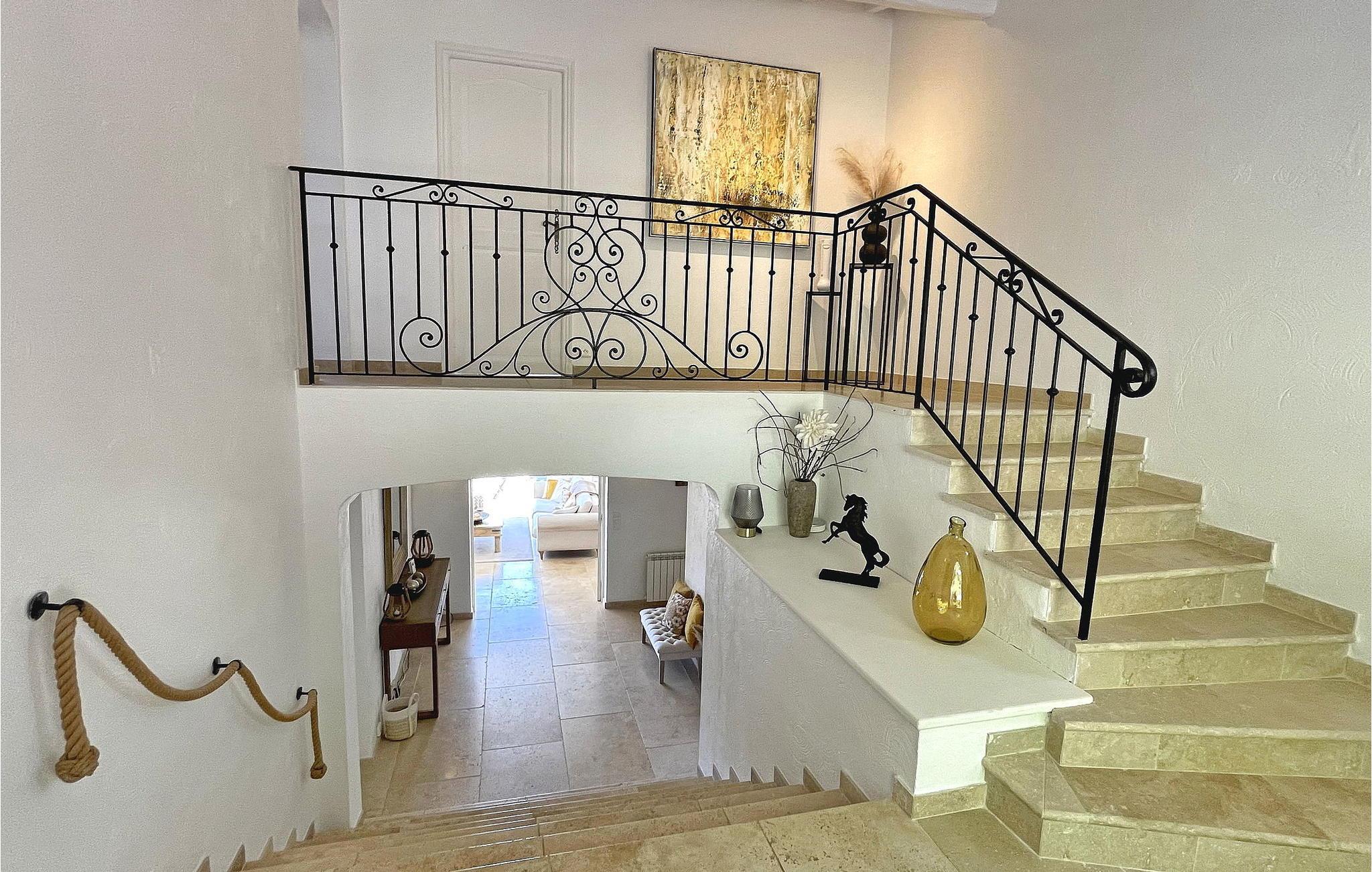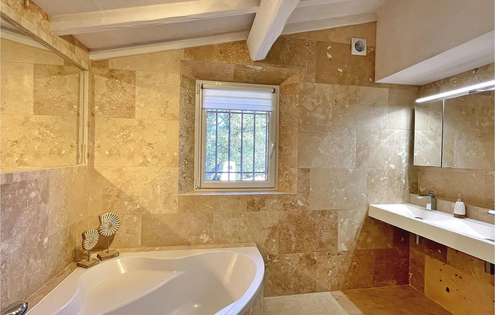 Beliggende i Adrets-de-l'Estérel er denne ferievilla et idyllisk oase med en privat opvarmet swimmingpool, sauna og jacuzzi. Denne generøse og luksuriøse villa tilbyder indkvartering på to halve etager. En indgang i stueetagen fører til et halvt niveau højere med to soveværelser, begge med balkoner med udsigt over Estérel og aircondition. Nedstigning et halvt niveau bringer dig til en rummelig opholdsstue med kontorplads, lounge, tv-område og spiseplads. Det lukkede køkken, der åbner ud til en overdækket terrasse, er veludstyret. Yderligere to soveværelser, et brusebad, et vaskerum og et ekstra toilet fuldender dette niveau. Udendørs kan villaen prale af lukket terrassegrund, flere terrasser og en petanquebane. En haveterrasse har spa, indglasset sauna og afslapningszoner. Poolområdet kan prale af en opvarmet 12 mx 5 m pool, liggestole, en bruser ved poolen og en skyggefuld bar med vask og køleskab. Huset er ideelt beliggende i hjertet af Estérel, halvvejs mellem Saint-Cassien-søen og 12 km fra strandene i Mandelieu i Var. Landsbyens centrum af Estérel er omkring 2,5 km fra huset med alle lokale butikker. Du kan nyde vandre-, vandre- og mountainbikestier i hjertet af massivet med adskillige stier gennem ege og fyrretræer, med storslåede udsigtspunkter og pauser nær søerne Avellan eller Saint-Cassien. Disse to søer er et godt sted at fiske, og søen Saint-Cassien byder på smukke strande udstyret til svømning samt forfriskningsbarer og udlejning af vandcykler. Golfelskere vil sætte pris på Terres Blanches golfbane omkring 20 km væk i Fayence. Tag på en ferie, hvor luksus møder natur og skaber en uforglemmelig flugt i hjertet af Estérel.